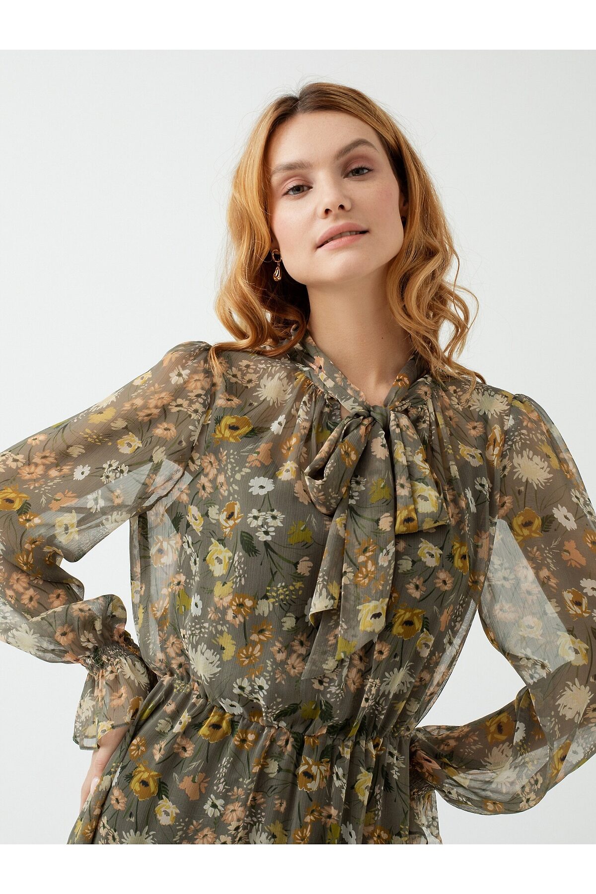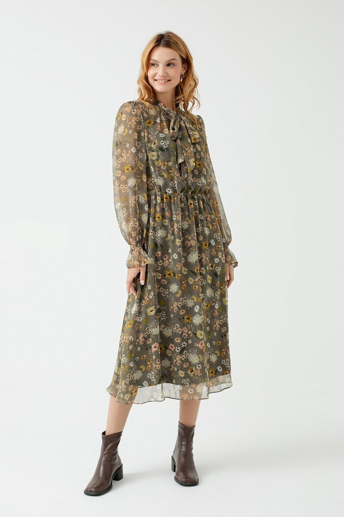 Женственное платье длины миди из плиссированного шифона в цветочном принте приталенного силуэта с воротником стойка, преходящим в бант и втачным рукавом полной длины. На талии резинка, юбка летящая, А-силуэта. По низу рукавов сборка на тонкую резинку и манжета - волан. К комплект входит нижнее платье на бретелях из непрозрачной подкладочной ткани.