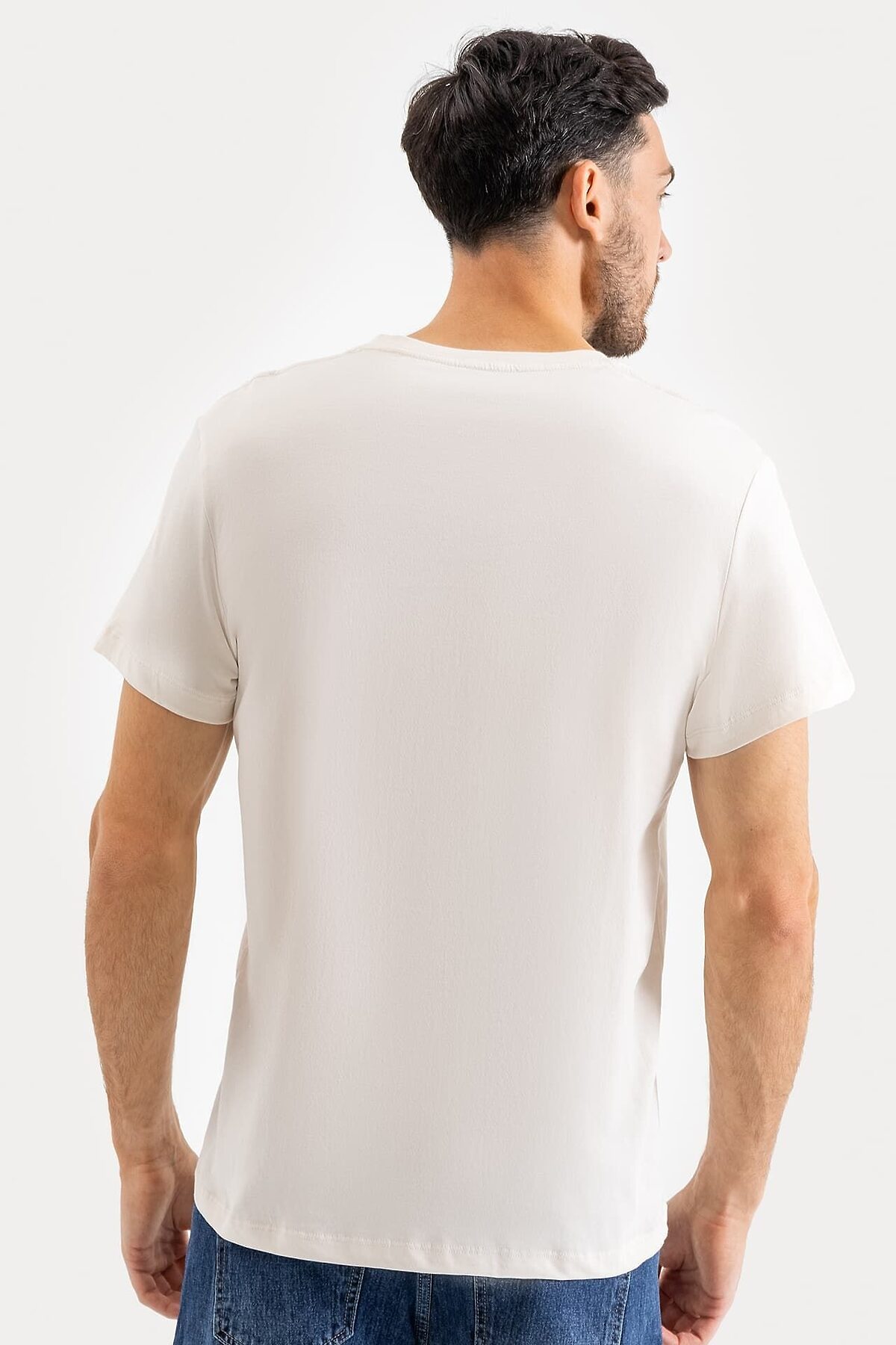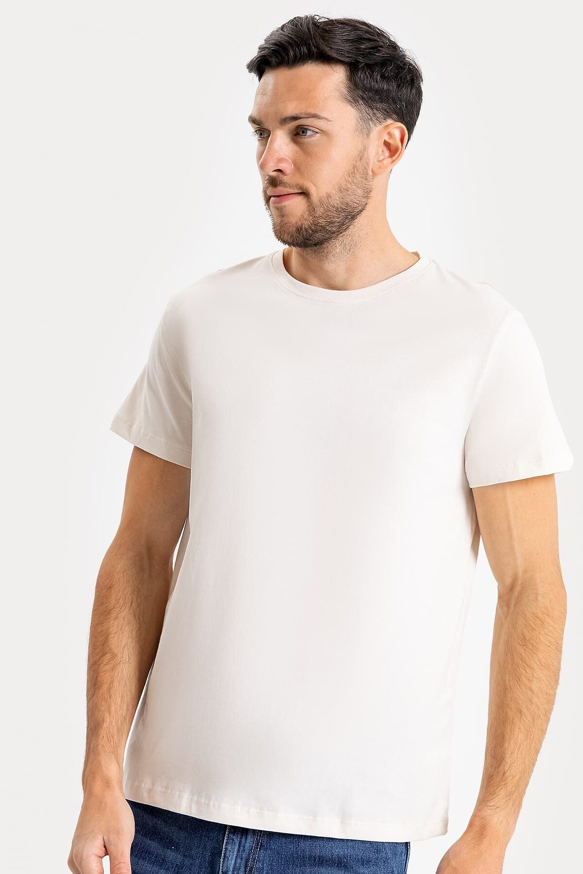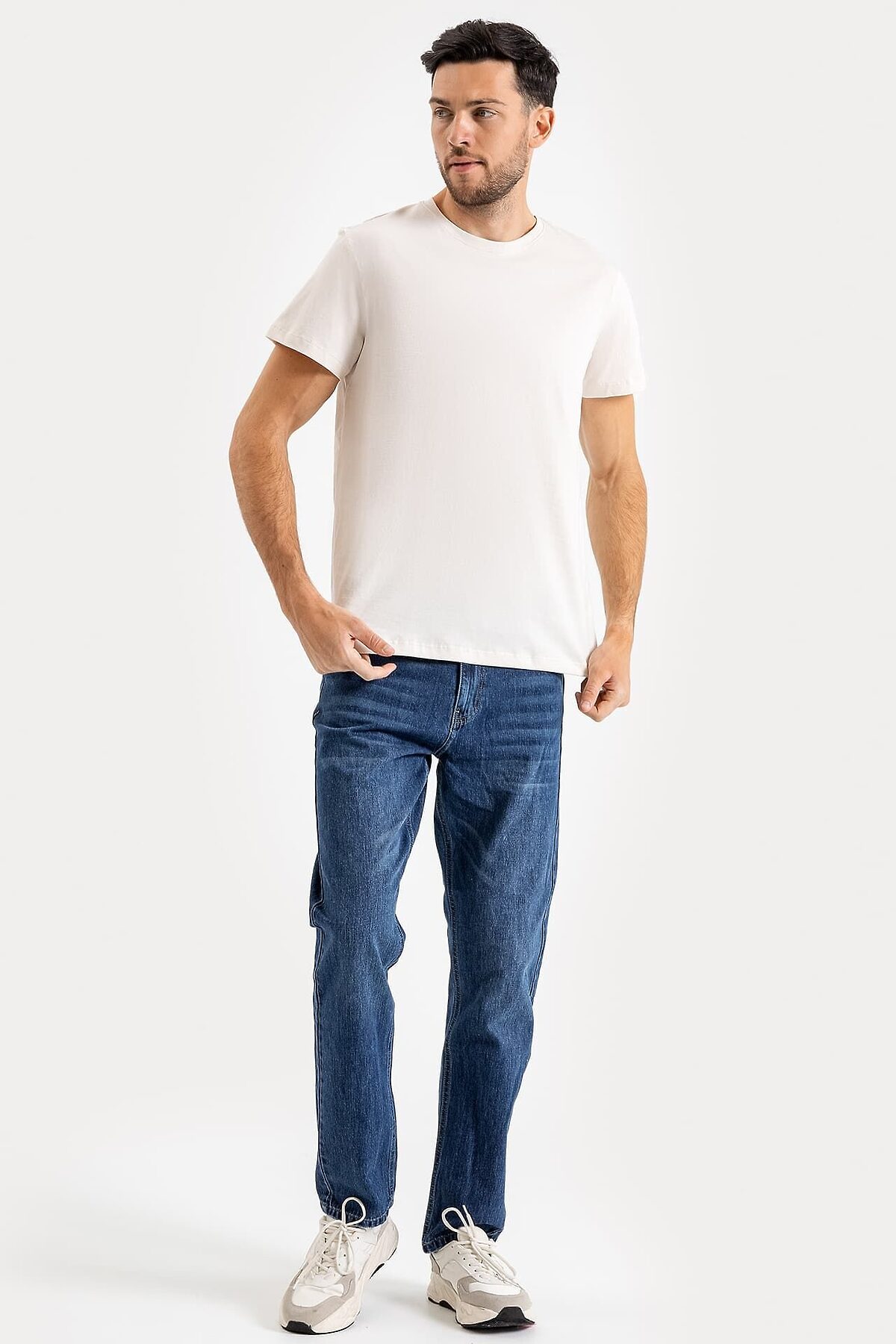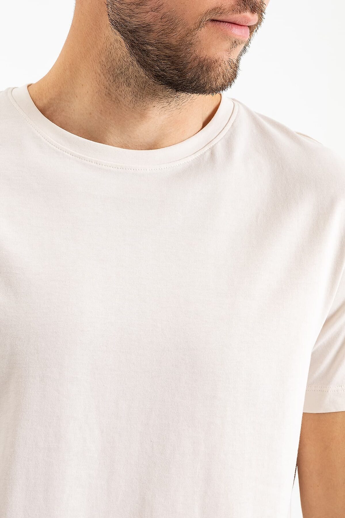 Футболка мужская прямого силуэта из трикотажного полотна кулирка. Горловина круглой формы, обтачка из рибаны. По горловине проложена отделочная строчка. Бейка по горловине спинки из кулирки от плечевого шва. Рукав втачной, короткий.