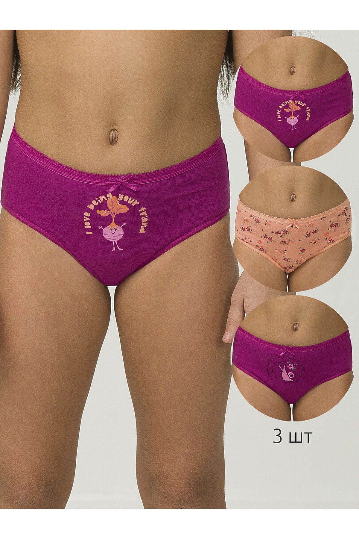 Детские трусы слипы для девочки из 100% хлопка, набор 3 штуки. Составляя детский гардероб, очень важно подобрать комфортные и удобные трусы для детей и подростков для повседневной носки на каждый день и сна. Трикотажные детские трусики слипы с эластичной резинкой по талии надежно держатся на теле ребенка, не скручиваются, не закатываются и не сползают, а дышащая ткань позволяет избежать натирания нежной кожи. Плотная, но свободная модель и средняя посадка не сковывают движения девочки, что важно маленьким детям. Милое и практичное детское нижнее белье порадует родителей долговечностью – хлопковые повседневные трусы не боятся многочисленных стирок, не растянутся и не полиняют. Детская одежда для девочек должна отвечать моде, комплект представляет только молодежные цвета, которые порадуют и поднимут настроение современной модницы.