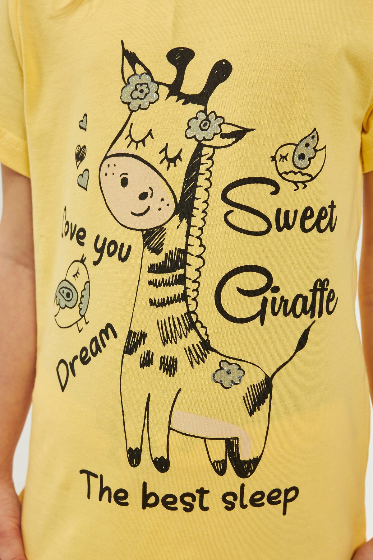 Футболка прямого кроя. Горловина обработана рибаной. Декорирована набивкой и принтом. Шорты на резинке, низ шорт обработан швом вподгибку. Декорированы набивкой . Тип ткани- Кулирная гладь.