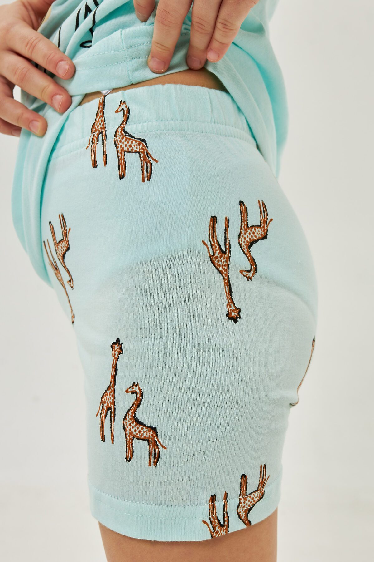 Футболка прямого кроя. Горловина обработана рибаной. Декорирована набивкой и принтом. Шорты на резинке, низ шорт обработан швом вподгибку. Декорированы набивкой . Тип ткани- Кулирная гладь.