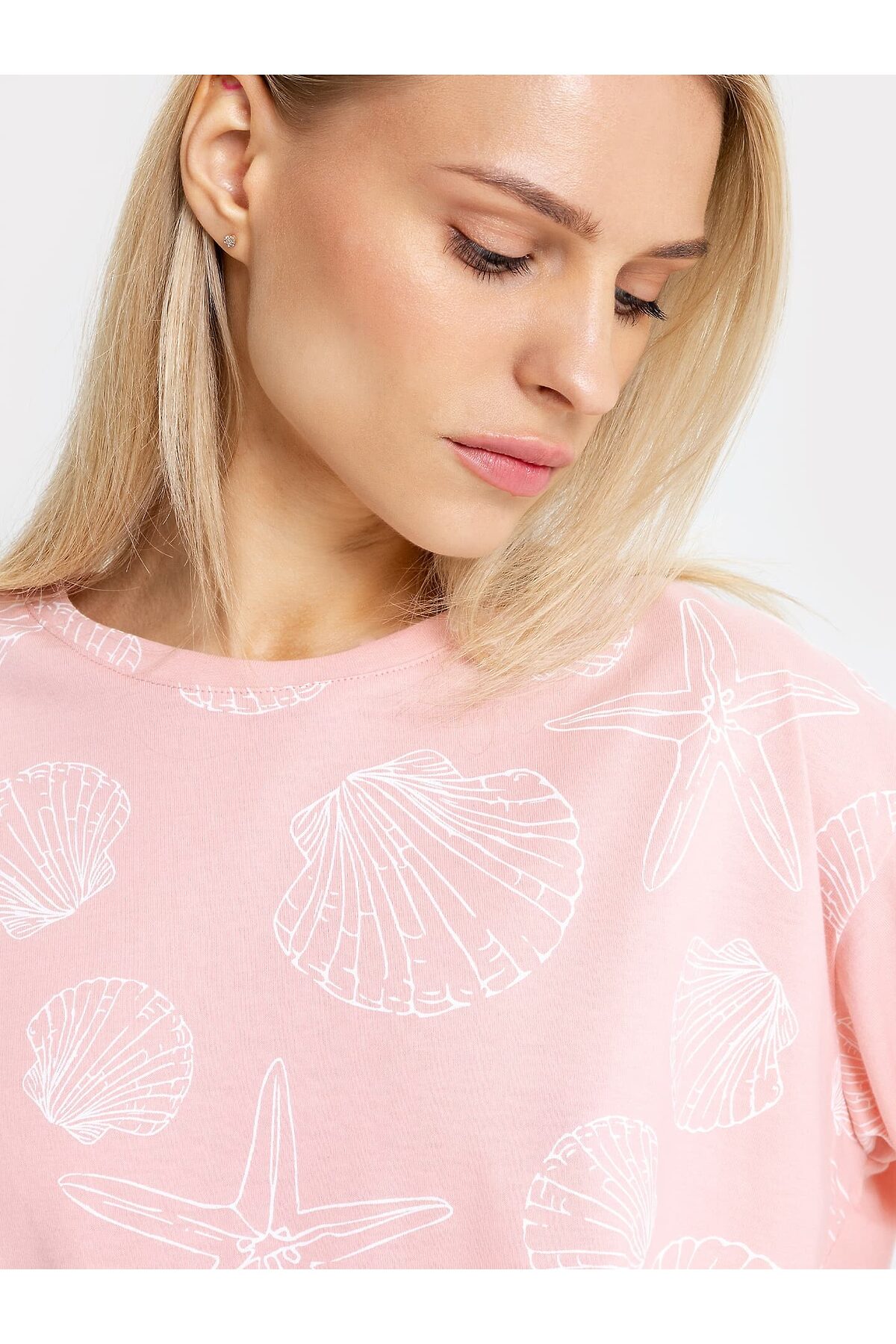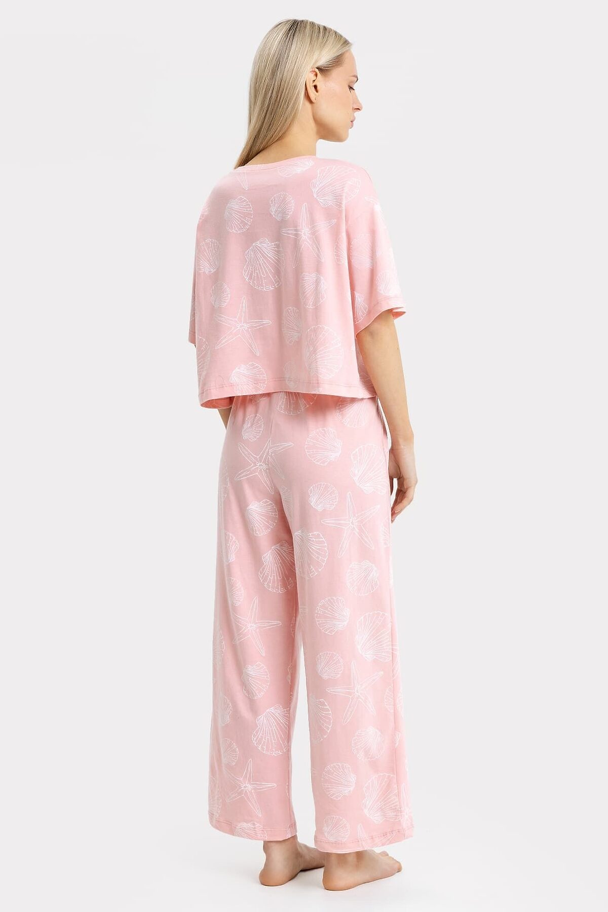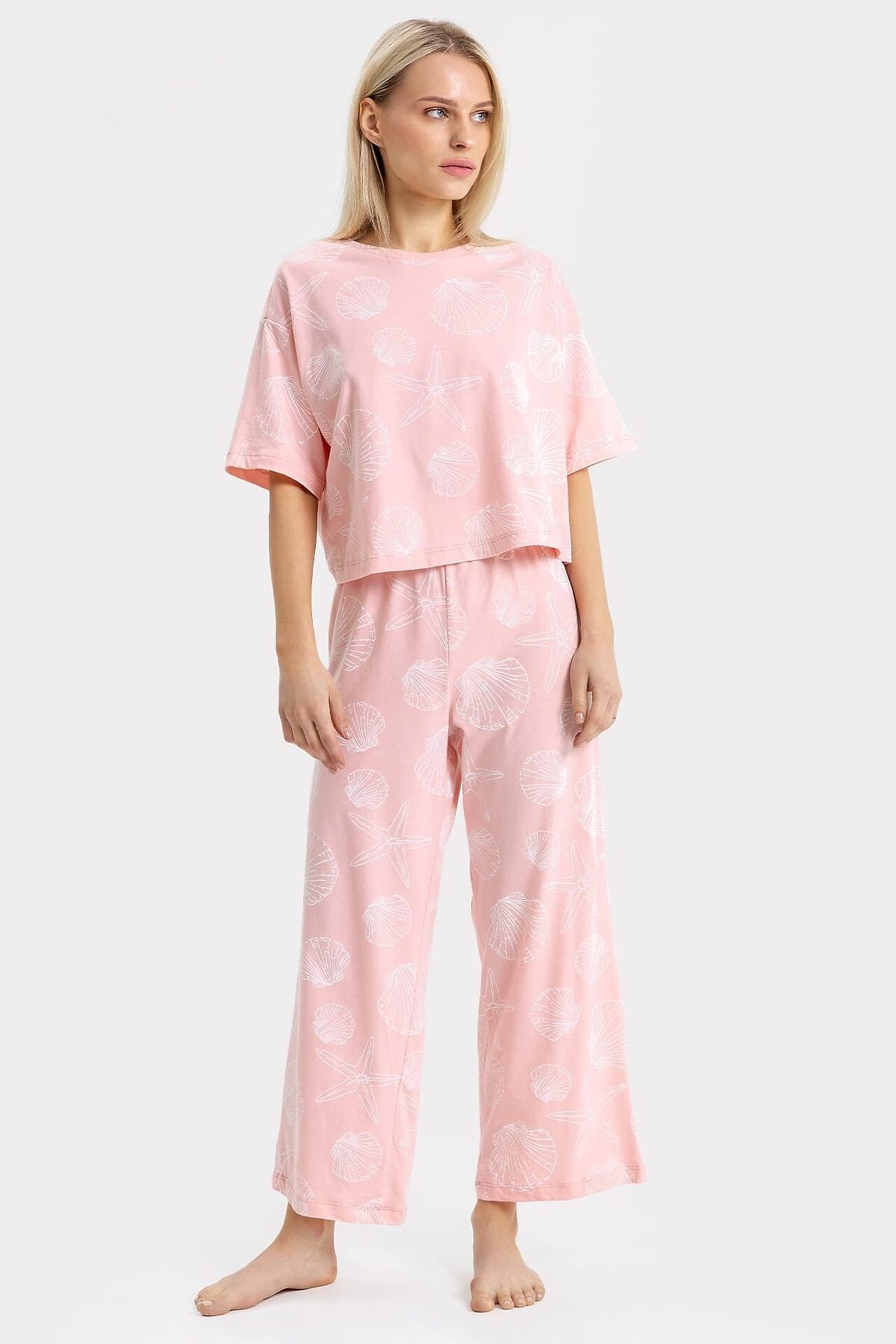 Очаровательный домашний комплект из трикотажной кулирки. Футболка прямого силуэта длиной до талии и просторные бриджи с эластичной тесьмой в поясе гарантируют свободу движений и неповторимый комфорт. Идеально для сна и домашних дел!