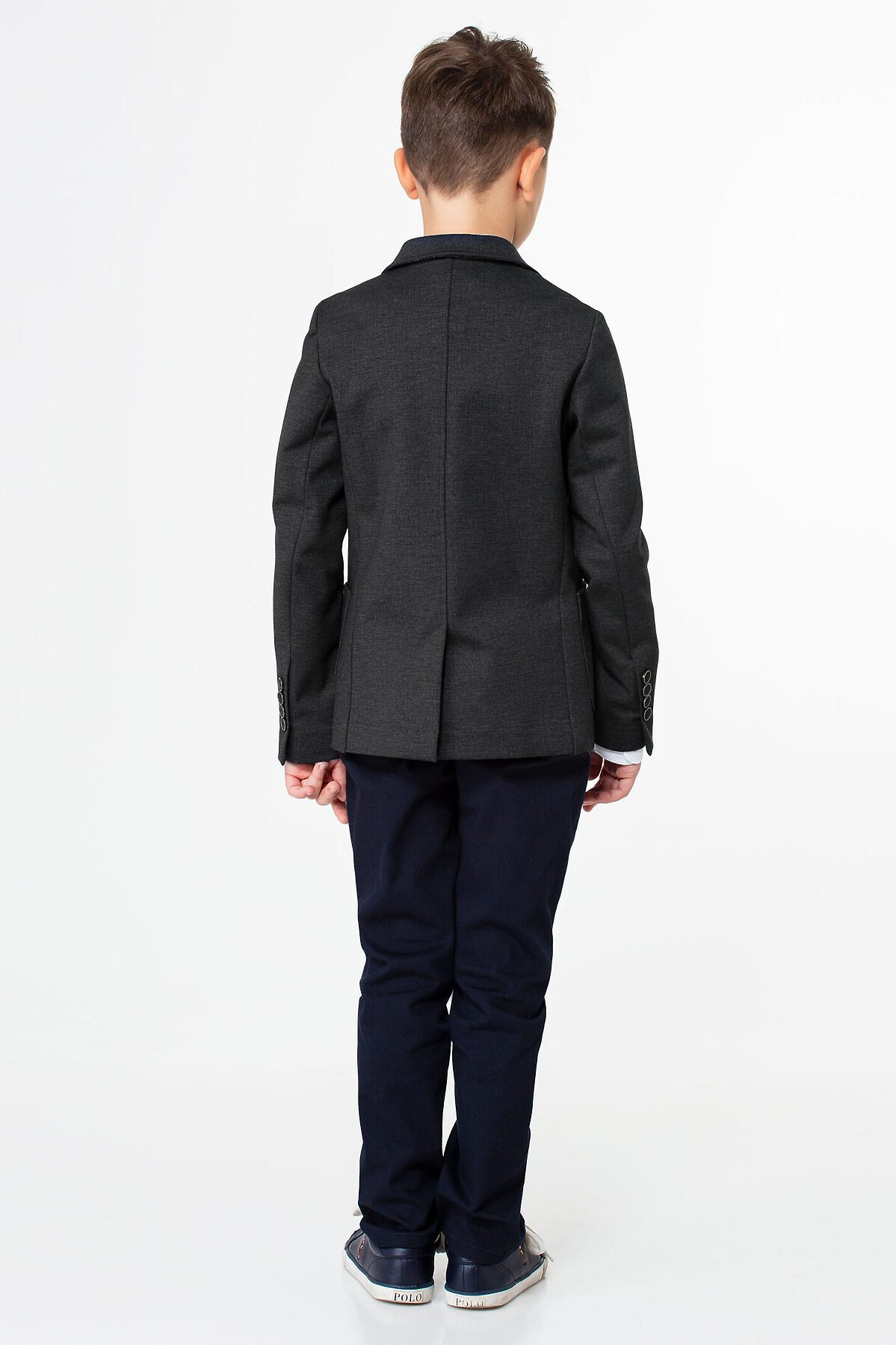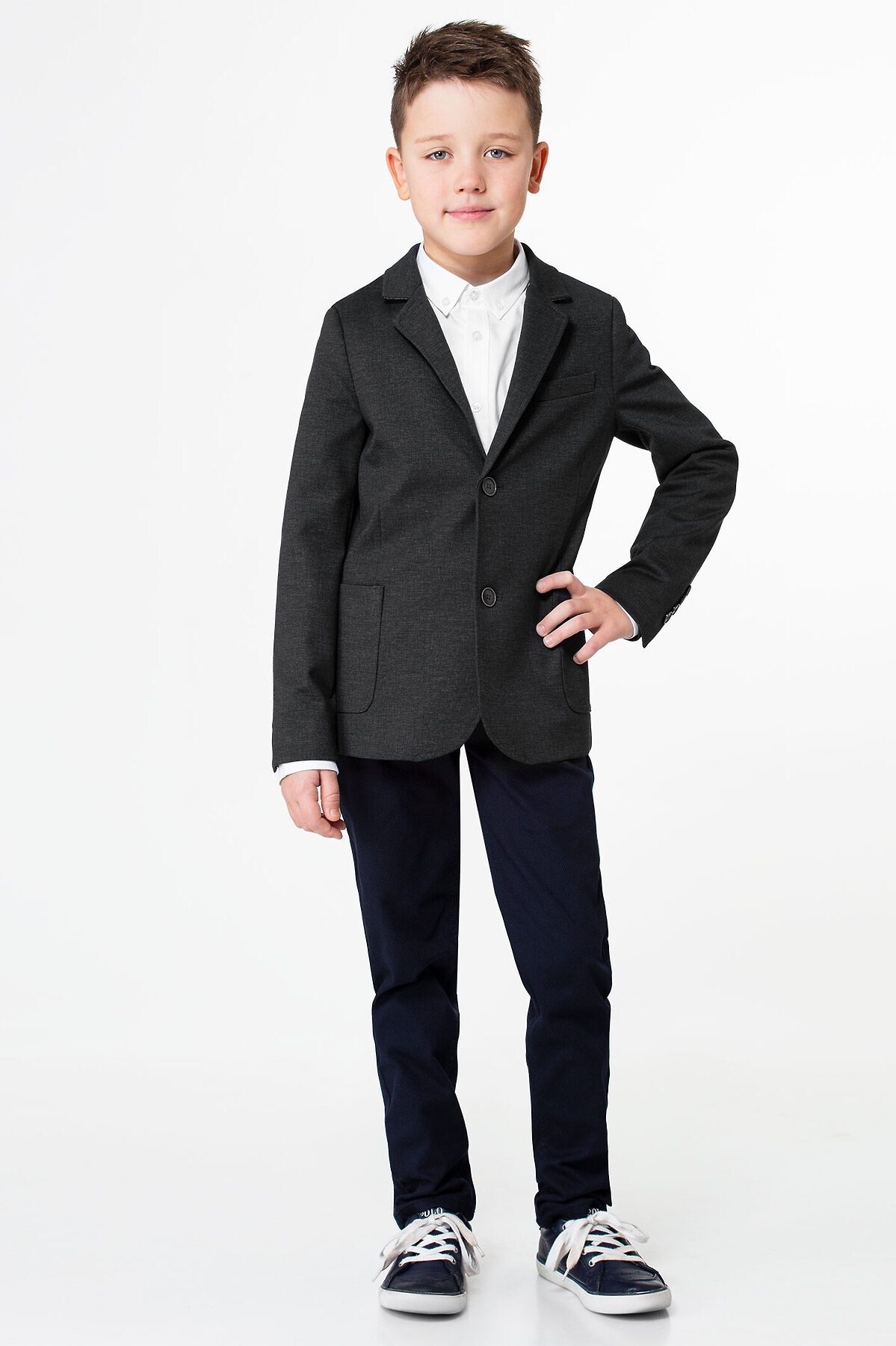 Пиджак для мальчика из трикотажного вискозного полотна. Пиджак полуприлегающего силуэта с центральной застежкой на две петли и пуговицы, с V- образным вырезом горловины, с втачными рукавами. Локтевые швы заканчиваются шлицами с декоративными пуговицами. Перед пиджака с отрезным бочком, с талиевыми вытачками. На переде расположены накладные карманы, обработанные подкладкой, а так же на левой полочке переда расположен нагрудный карман с листочкой. Спинка со средним швом. Воротник отложной пиджачного типа. Перед и рукава пиджака на вискозной подкладке. На левой внутренней части пиджака, на подборте, имеется внутренний карман в рамку с застежкой на пуговицу. Комфортный стильный пиджак станет отличным решением для ежедневной носки в школу.