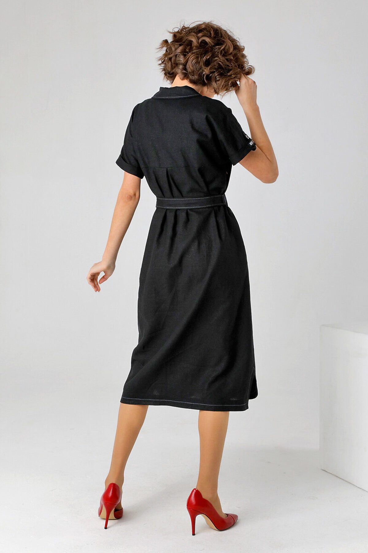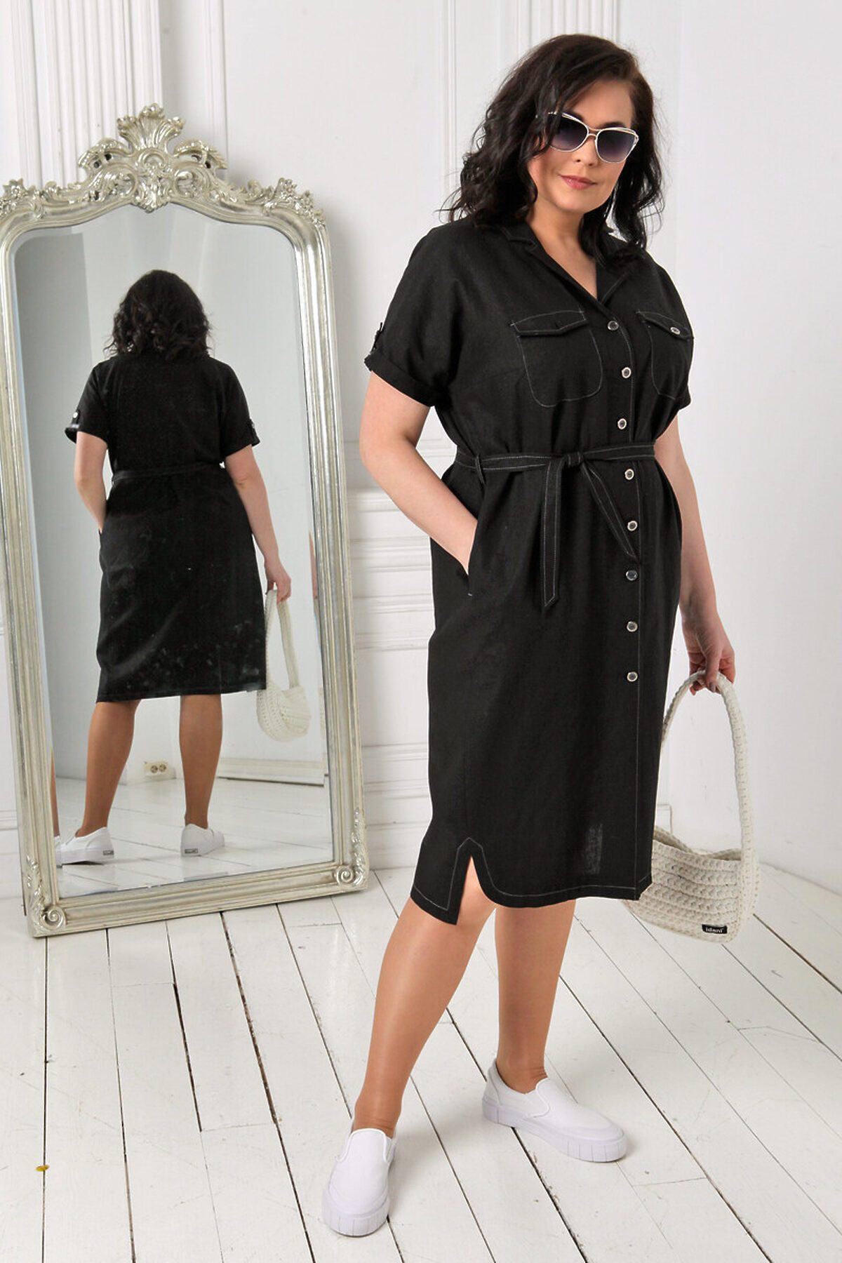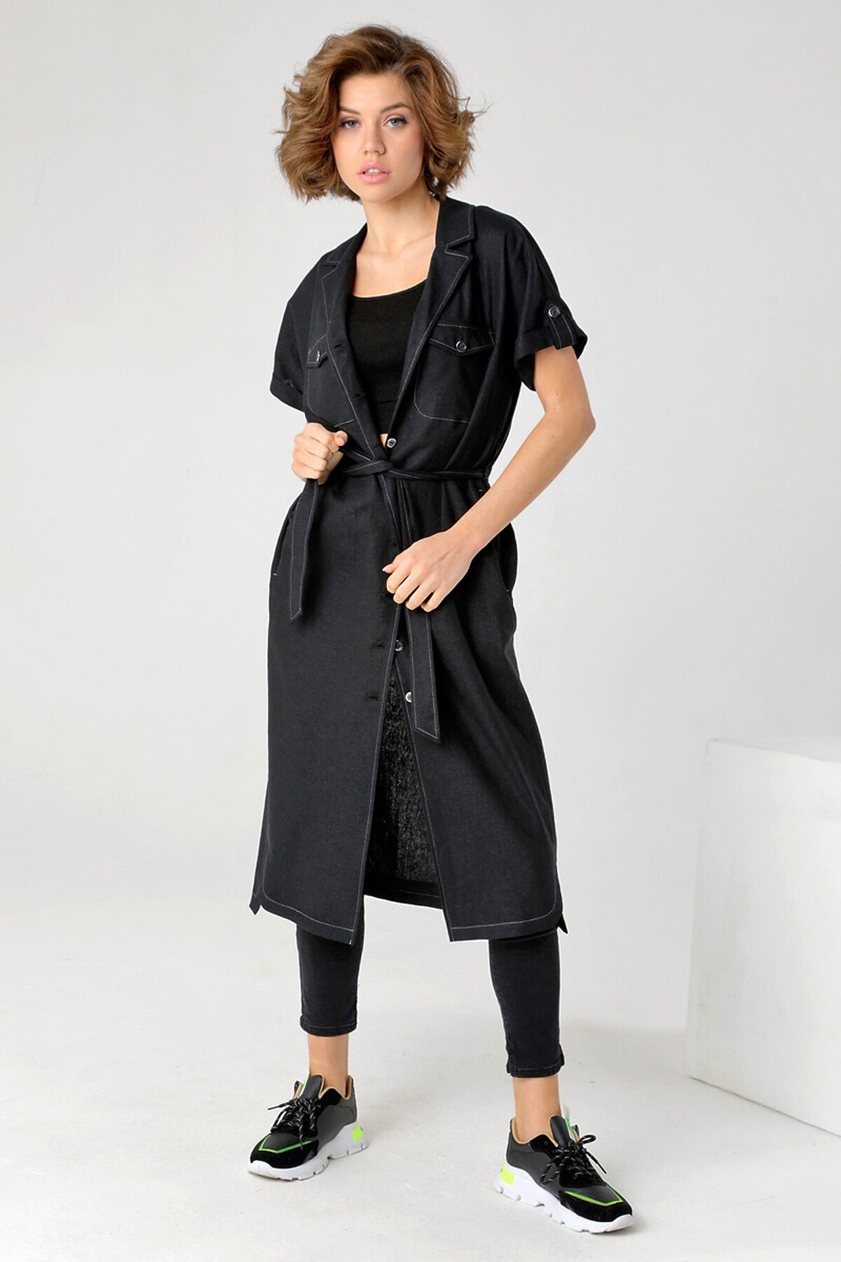 23207 Льняное платье-рубашка прямого силуэта с короткими цельнокроенными рукавами и застежкой на петли и пуговицы. Воротник английского типа с лацканами. Функциональные карманы расположены в боковых швах. Линию талии, при желании, можно подчеркнуть завязывающимся поясом. Такое платье можно использовать и как легкий кардиган в сочетании с брюками, джинсами и топами. Комбинируя это платье-рубашку с различными видами одежды, подбирая обувь по стилю, вы можете создать множество образов как для прогулок, так и для поездки в офис.