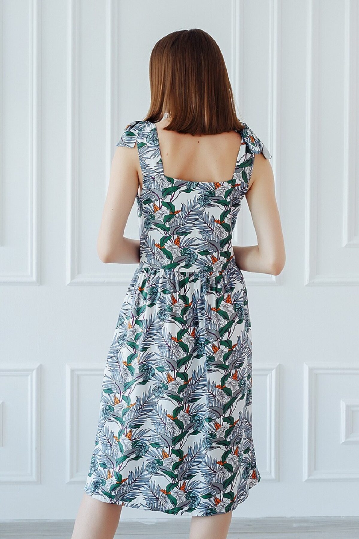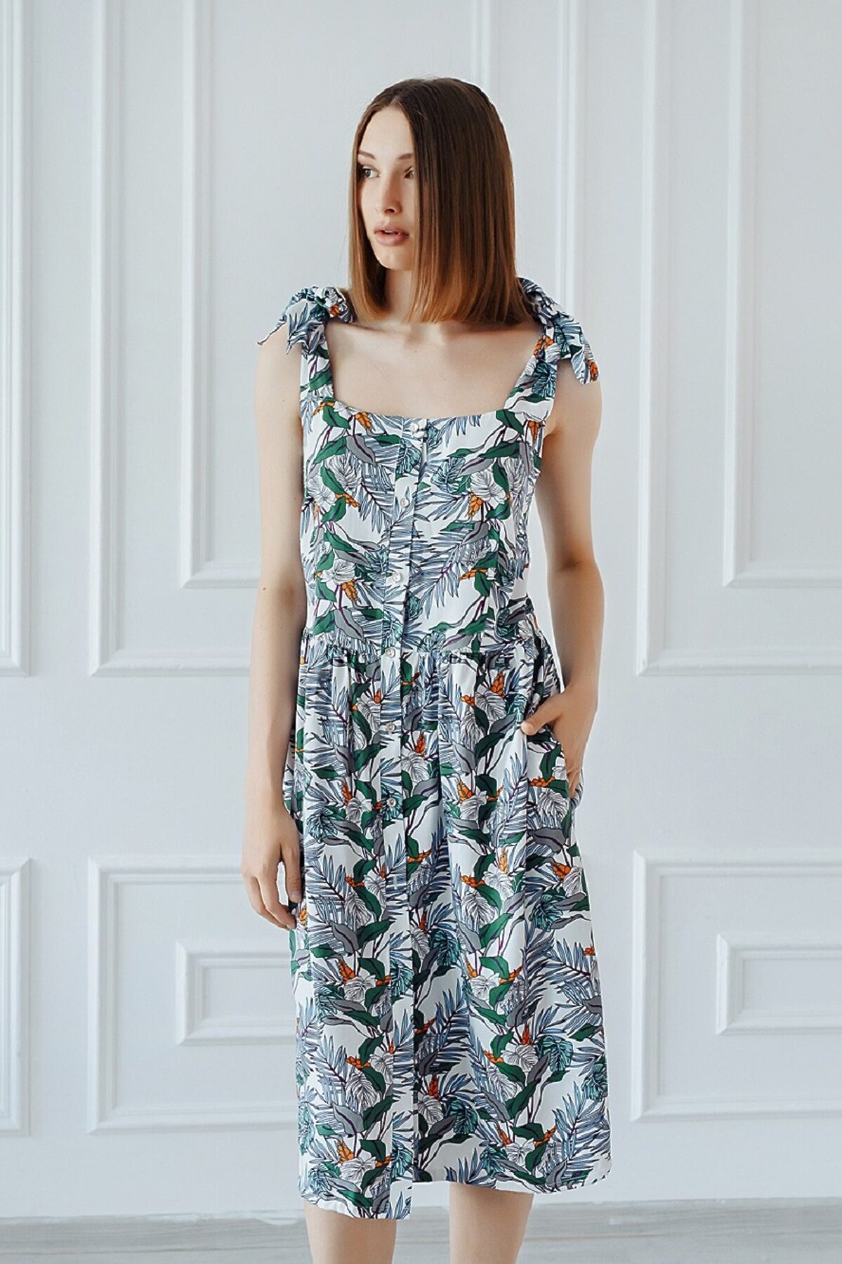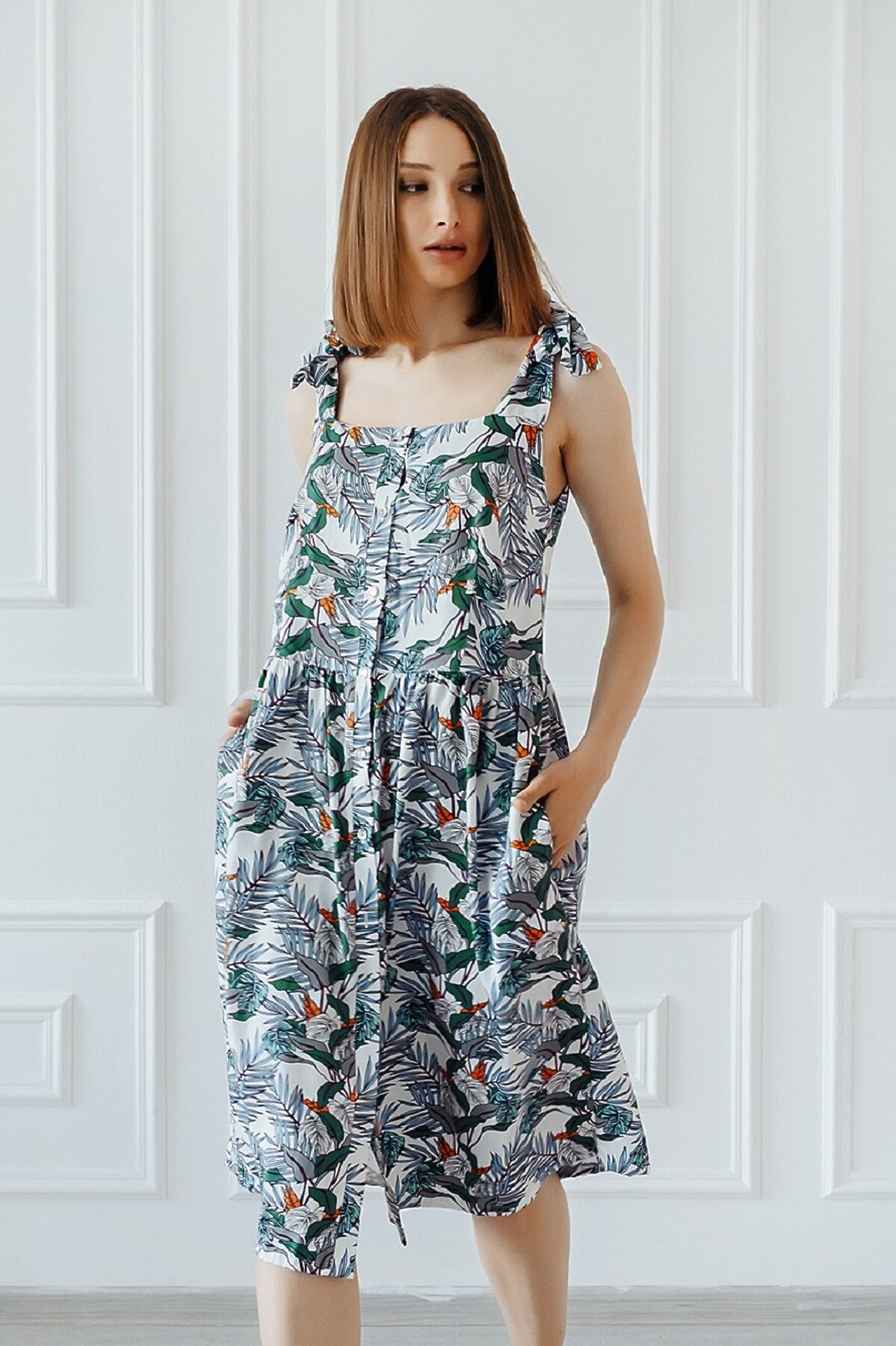 Сарафан женский летний из штапеля полуприлегающего силуэта длиною до колена с застежкой на пуговицы. По линии талии расположена легкая сборка. Бретели сарафана декорируются в банты. В боковых швах расположены карманы. Платье летнее женское из тонкой вискозы - штапель. Штапель это натуральный, легкий и дышащий материал. В таком платье Вы будите чувствовать себя комфортно даже в самый жаркий летний день. Летнее платье универсально, Вы можете создать легкий спортивный образ с кедами или романтичный, надев босоножки на каблуке. Дополните платье различными аксессуарами (серьги, сумочки, ремешки, бусы) и можете собрать вечерний образ. Стильное, модное, романтичное отлично подойдет для фотосессии. Платье из штапеля можно взять с собой на отдых или использовать как домашнее платье. Подойдет как стройным девушкам, так и дамам с пышными формами. Благодаря крою подойдет беременным и кормящим, а натуральная ткань не вызовет дискомфорта. Обращаем Ваше внимание, что платье выполнено из натуральной ткани и может дать усадку от 4 до 7 %, учитывайте это при заказе изделия. Платье из штапеля будет отличным подарком девушке, сестре, подруге, маме, племяннице и любимой женщине на день рождения, юбилей, годовщину свадьбы, новый год или просто без всякого повода.