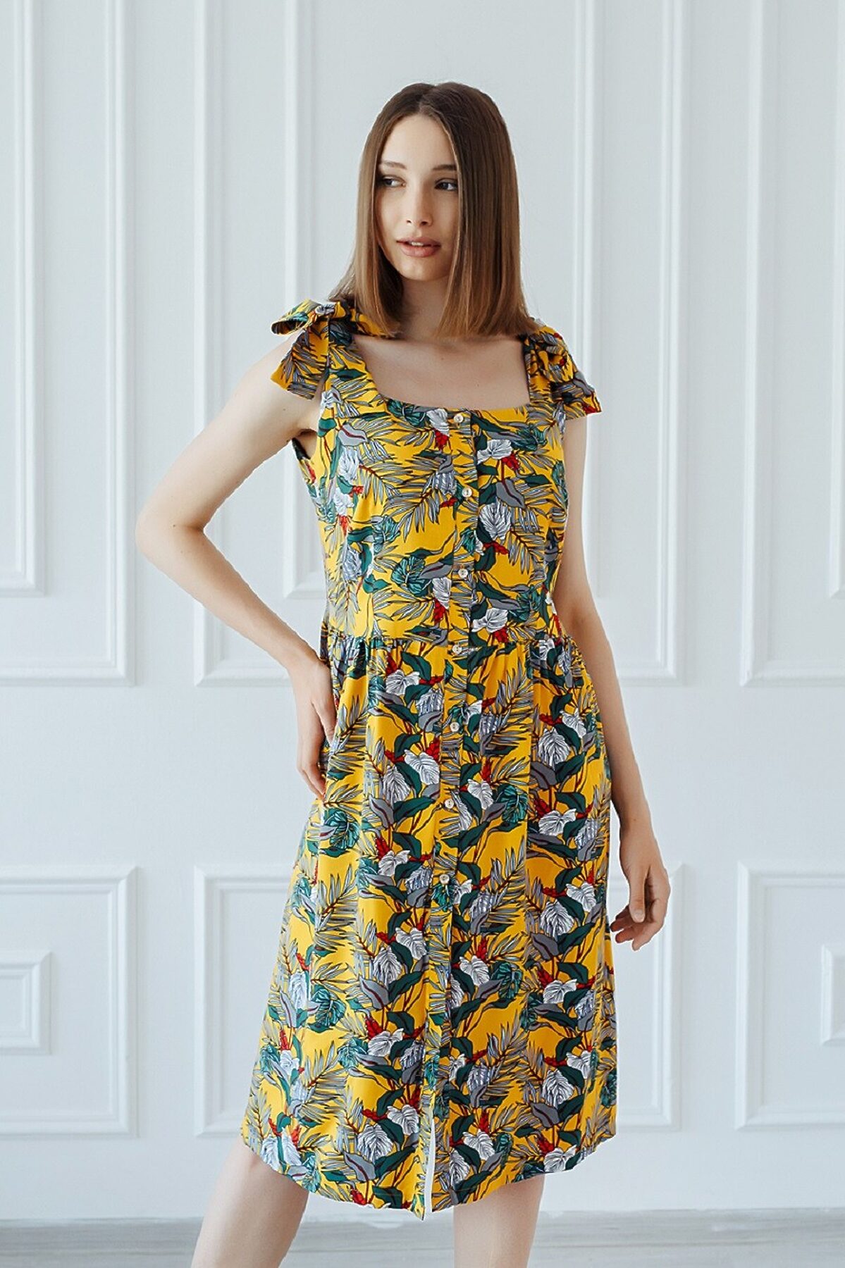 Сарафан женский летний из штапеля полуприлегающего силуэта длиною до колена с застежкой на пуговицы. По линии талии расположена легкая сборка. Бретели сарафана декорируются в банты. В боковых швах расположены карманы. Платье летнее женское из тонкой вискозы - штапель. Штапель это натуральный, легкий и дышащий материал. В таком платье Вы будите чувствовать себя комфортно даже в самый жаркий летний день. Летнее платье универсально, Вы можете создать легкий спортивный образ с кедами или романтичный, надев босоножки на каблуке. Дополните платье различными аксессуарами (серьги, сумочки, ремешки, бусы) и можете собрать вечерний образ. Стильное, модное, романтичное отлично подойдет для фотосессии. Платье из штапеля можно взять с собой на отдых или использовать как домашнее платье. Подойдет как стройным девушкам, так и дамам с пышными формами. Благодаря крою подойдет беременным и кормящим, а натуральная ткань не вызовет дискомфорта. Обращаем Ваше внимание, что платье выполнено из натуральной ткани и может дать усадку от 4 до 7 %, учитывайте это при заказе изделия. Платье из штапеля будет отличным подарком девушке, сестре, подруге, маме, племяннице и любимой женщине на день рождения, юбилей, годовщину свадьбы, новый год или просто без всякого повода.