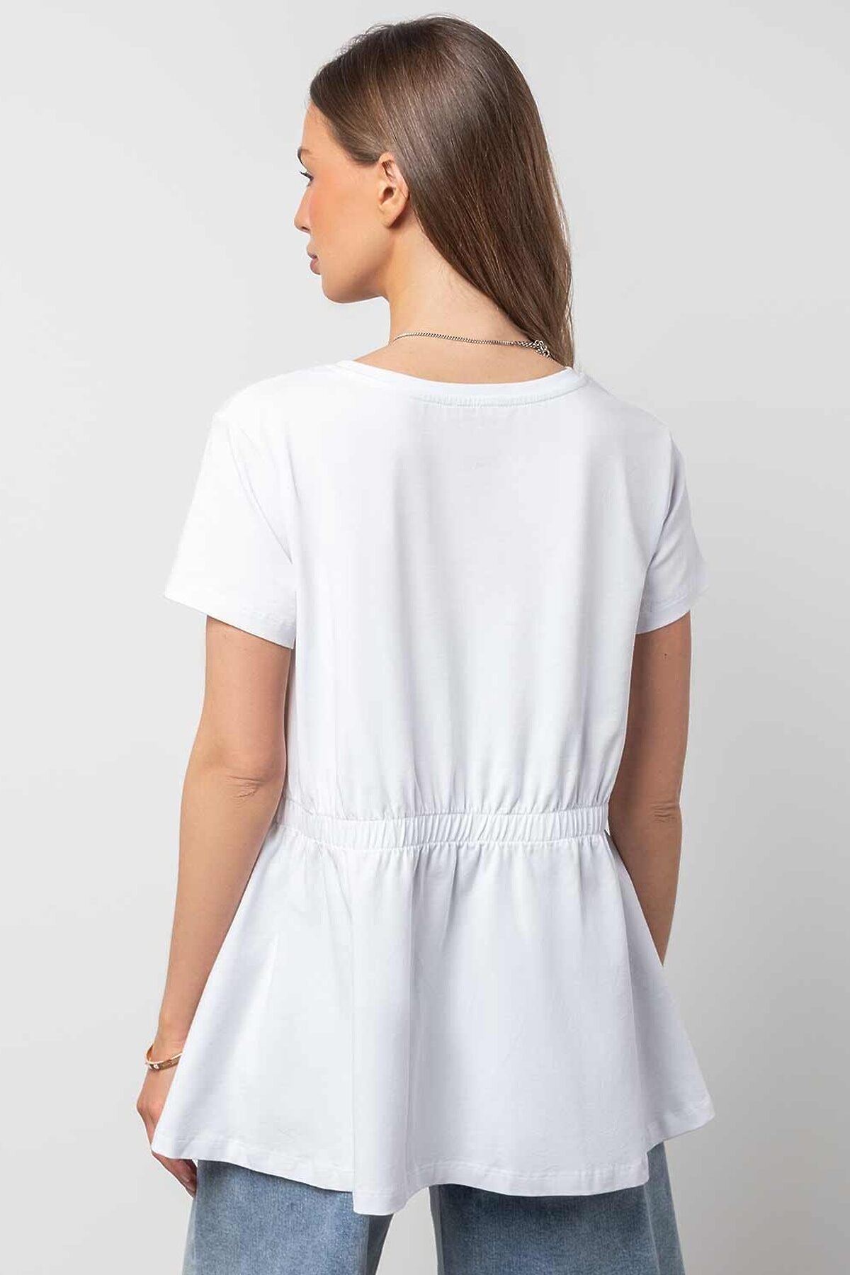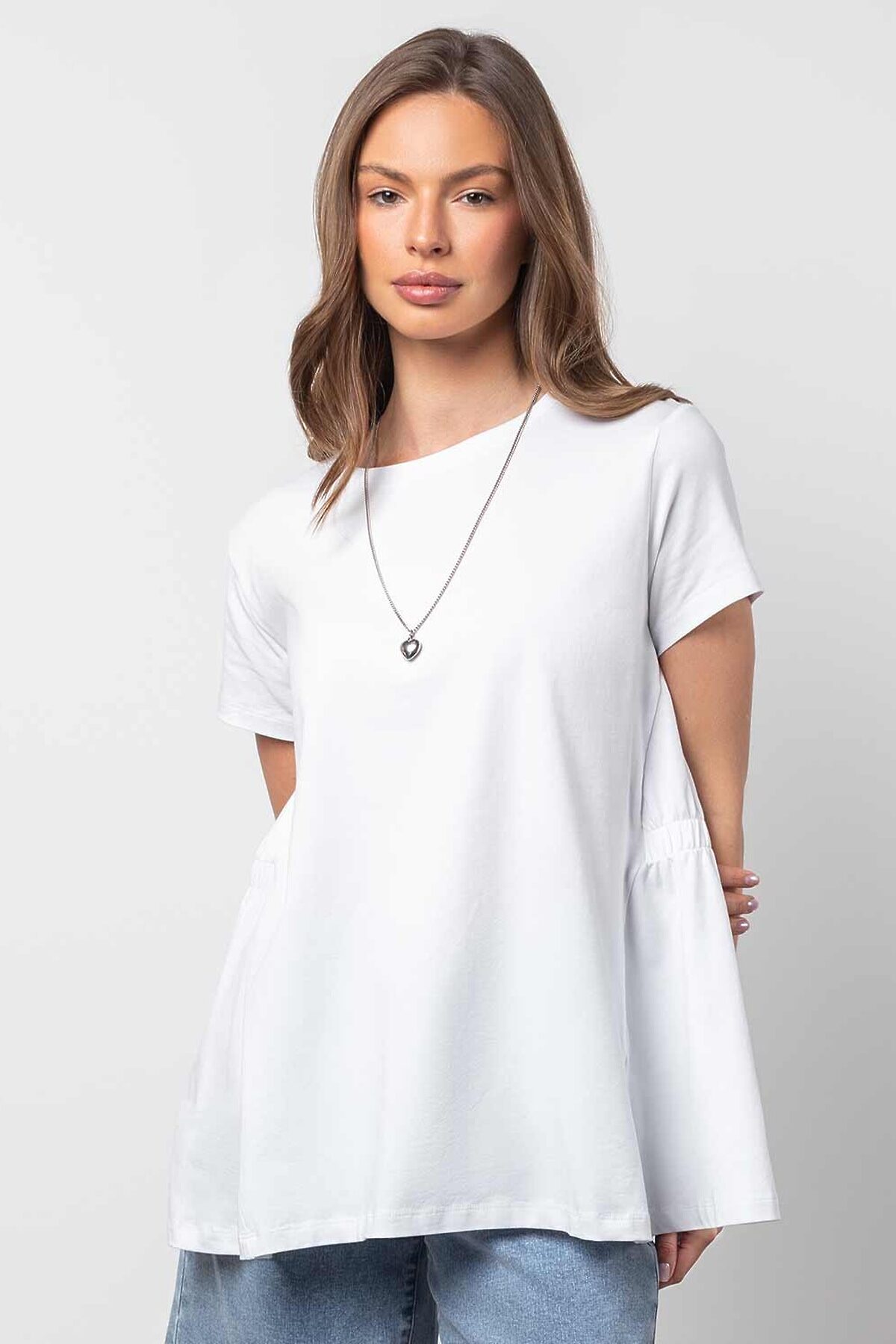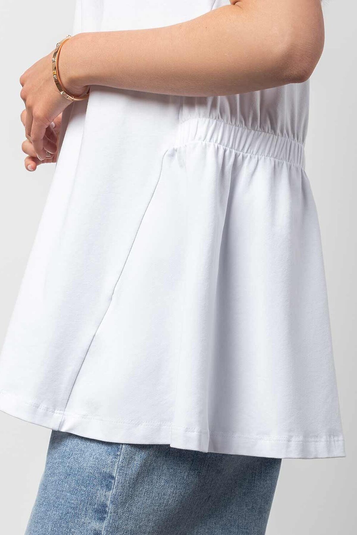 Свободный джемпер-туника сшит из премиального хлопка. На спинке изделия сборка, придающая модели воздушность и женственность. Наличие эластана в составе, способствует формоустойчивости и меньшей сминаемости. Из декора — небольшой металлический логотип бренда, на рукаве изделия.