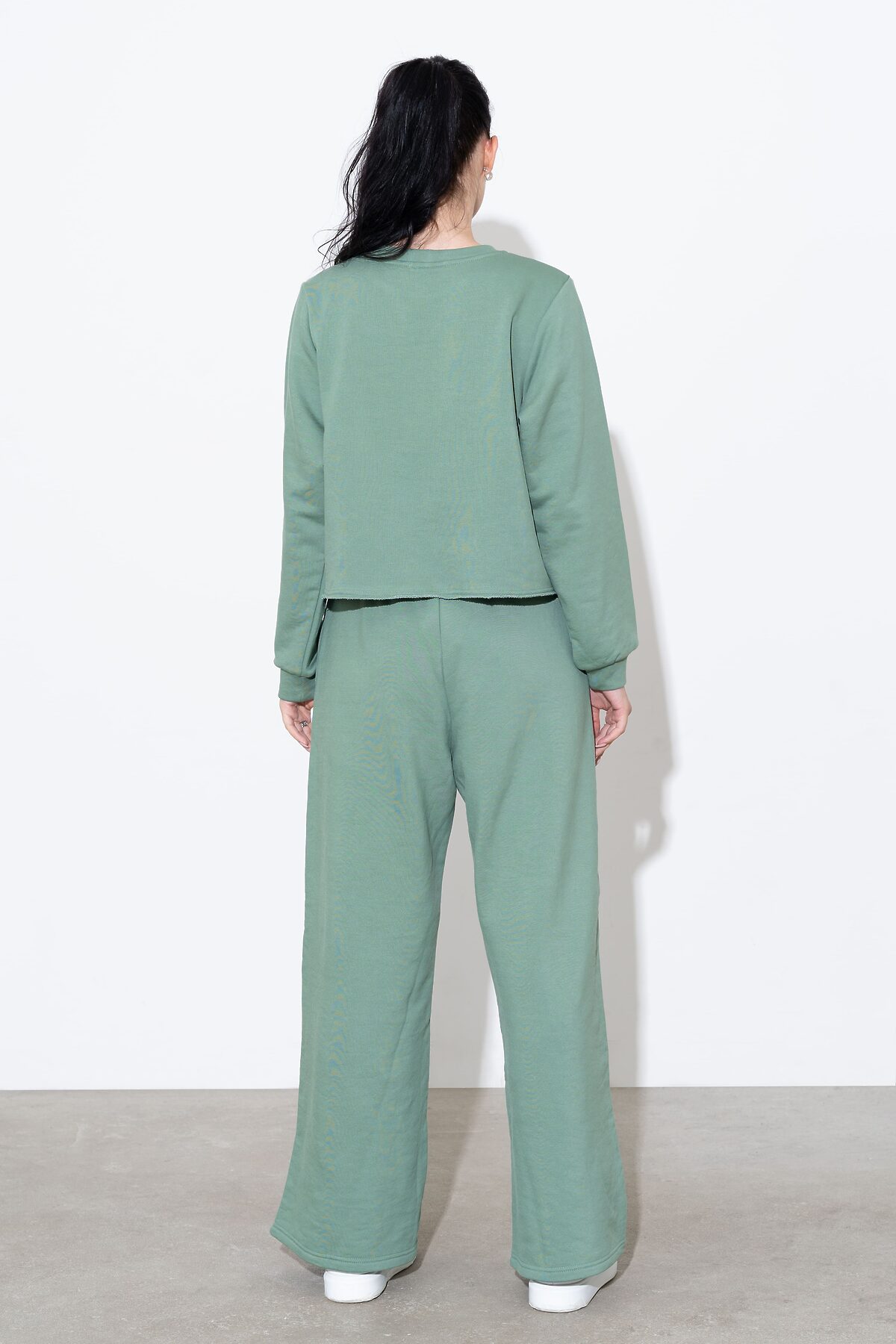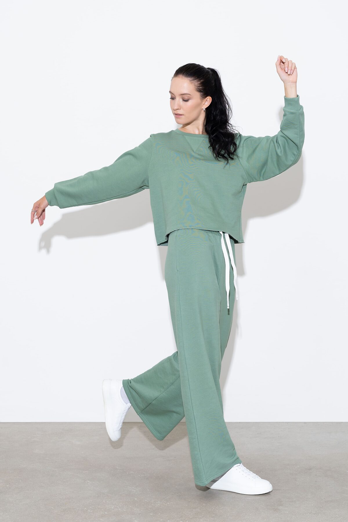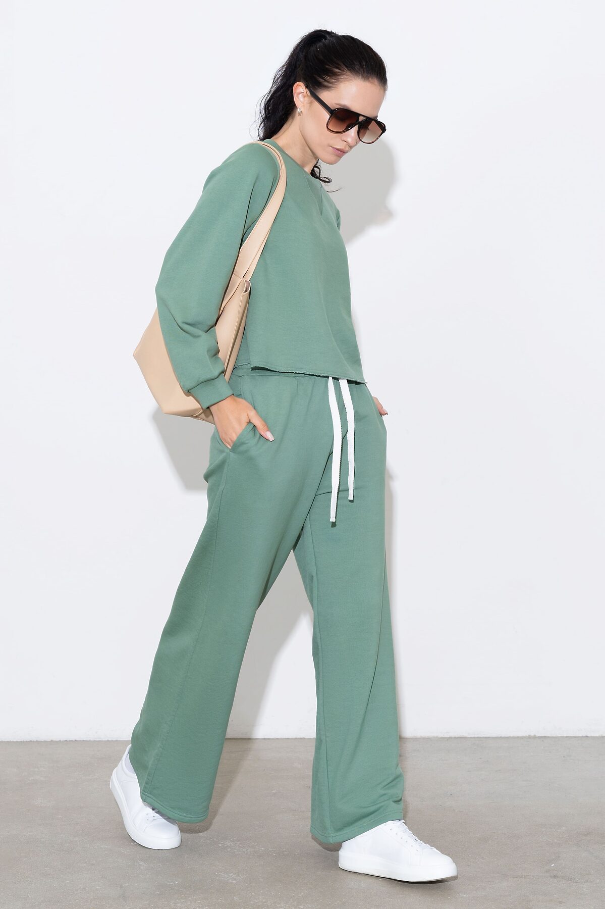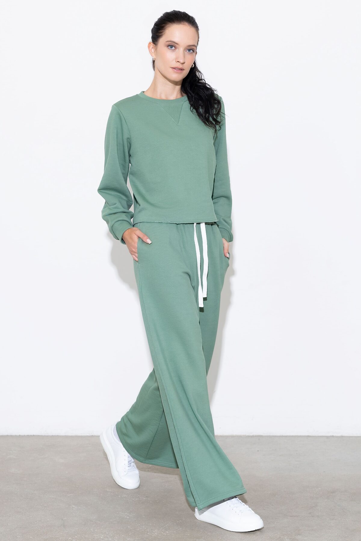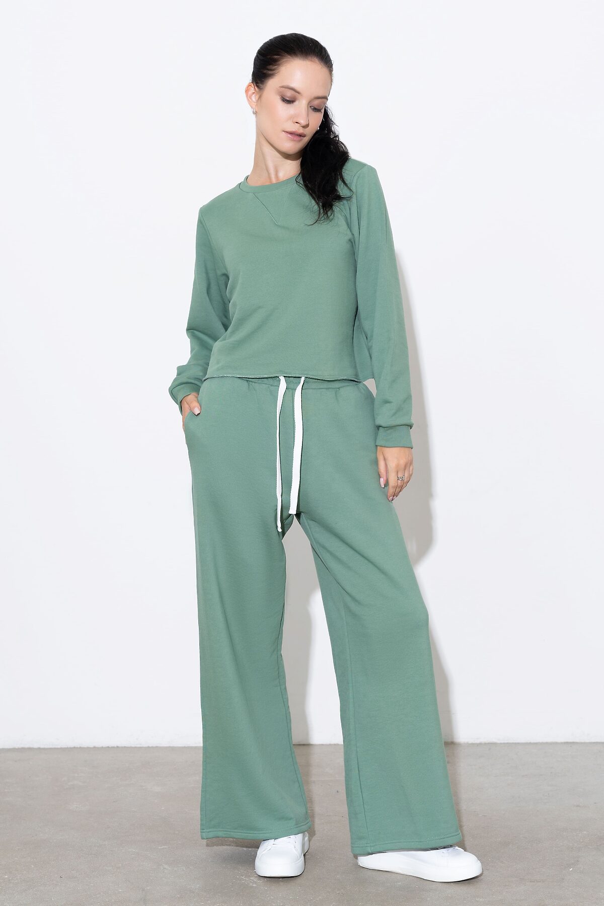 Спортивный костюм, состоящий из укороченного свитшота и брюк-палаццо с карманами в боковых швах.