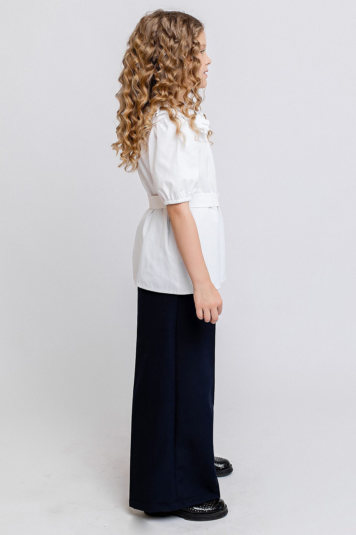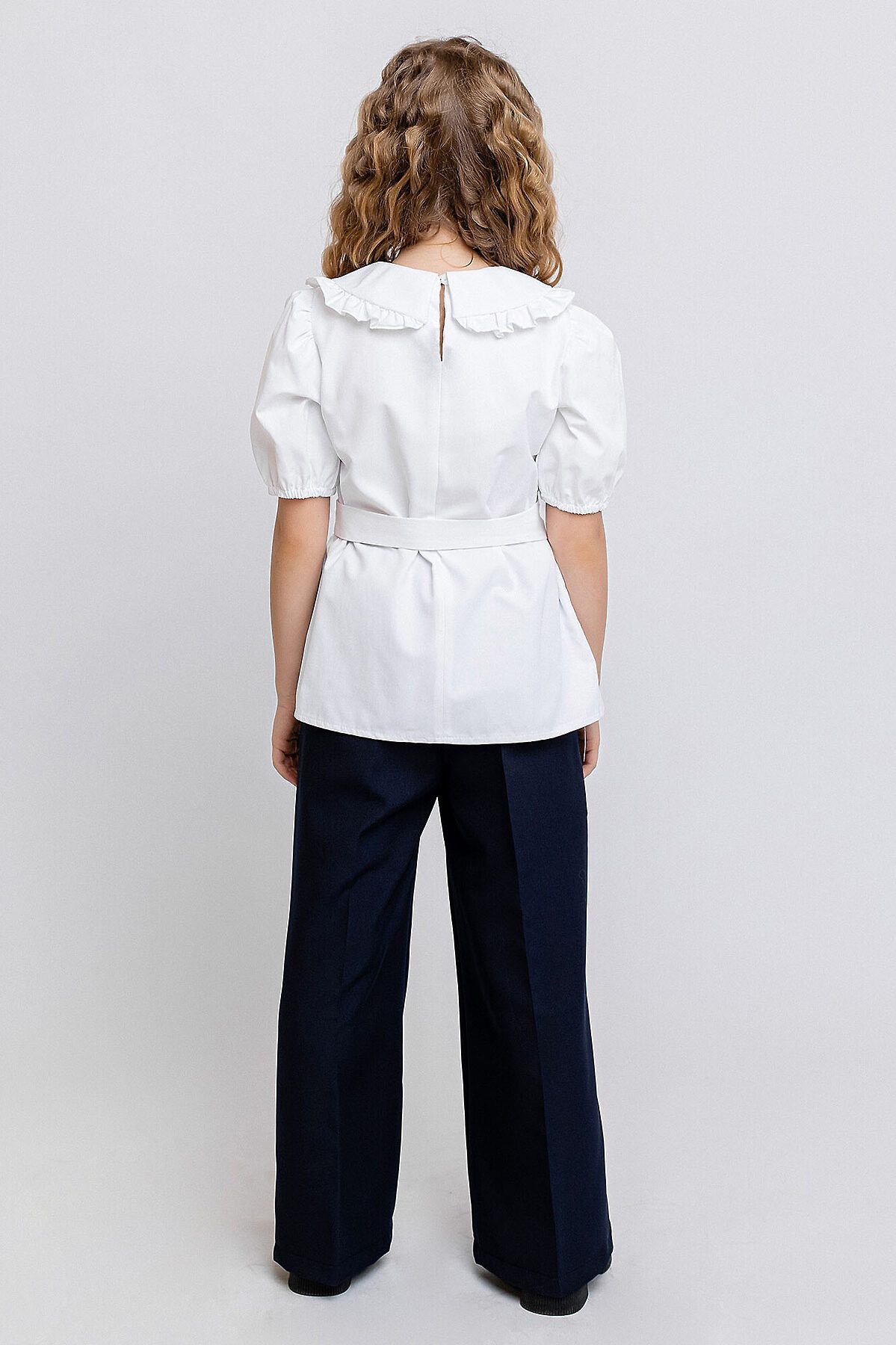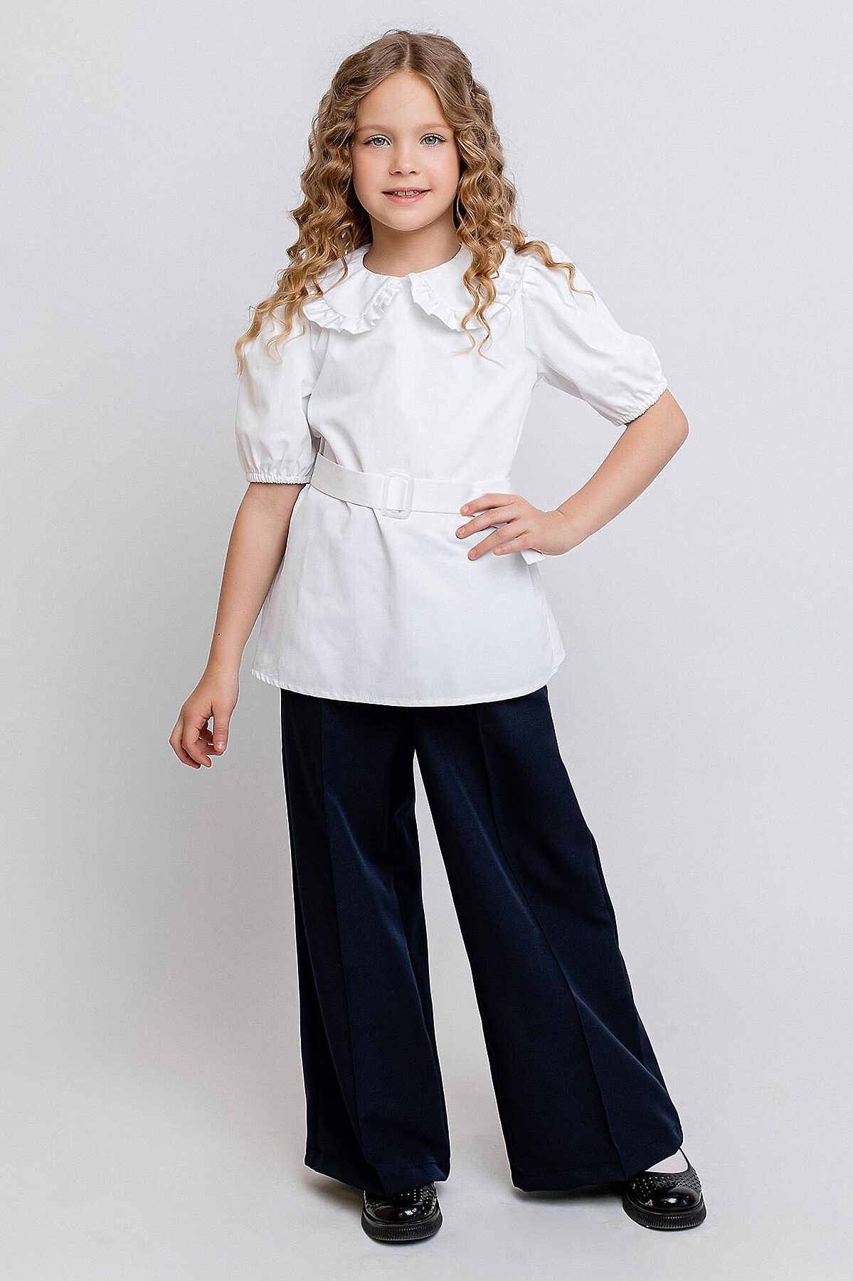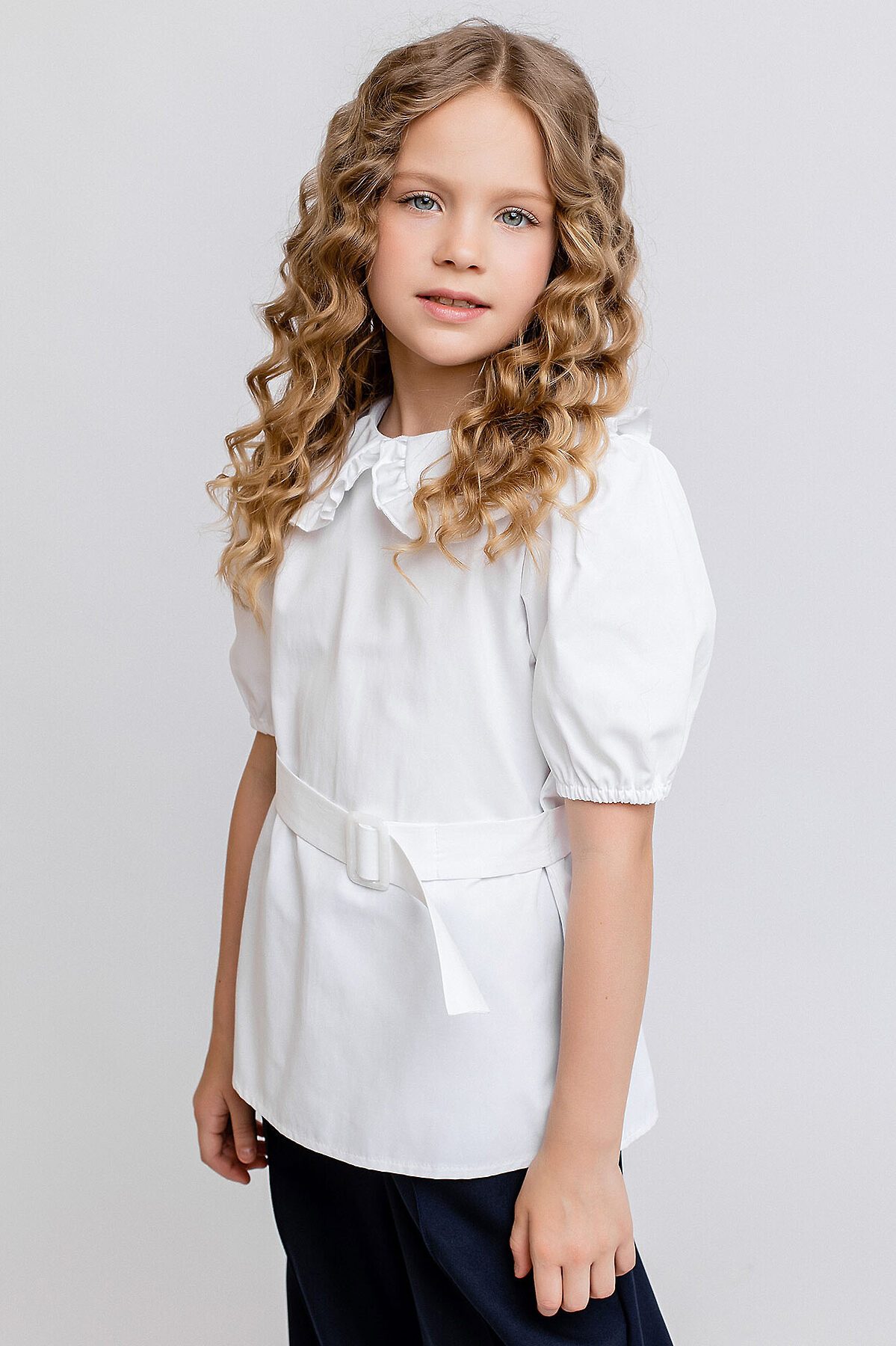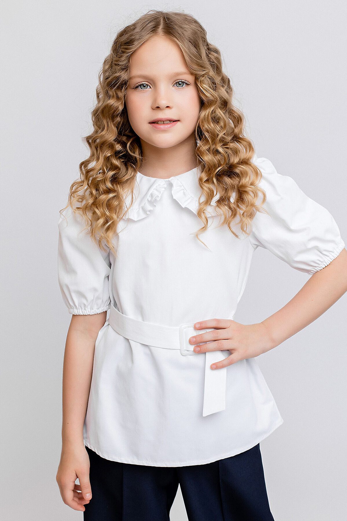 Блузка белая для девочки с короткими рукавами на резинке и декоративным воротником. Застежка на петли пуговицы. Поясок с пряжкой. Сборка на рукавах. Подобранная по размеру красивая блузка из сорочечной ткани с рукавами 3/4 не будет тянуть, давить, сковывать движения.