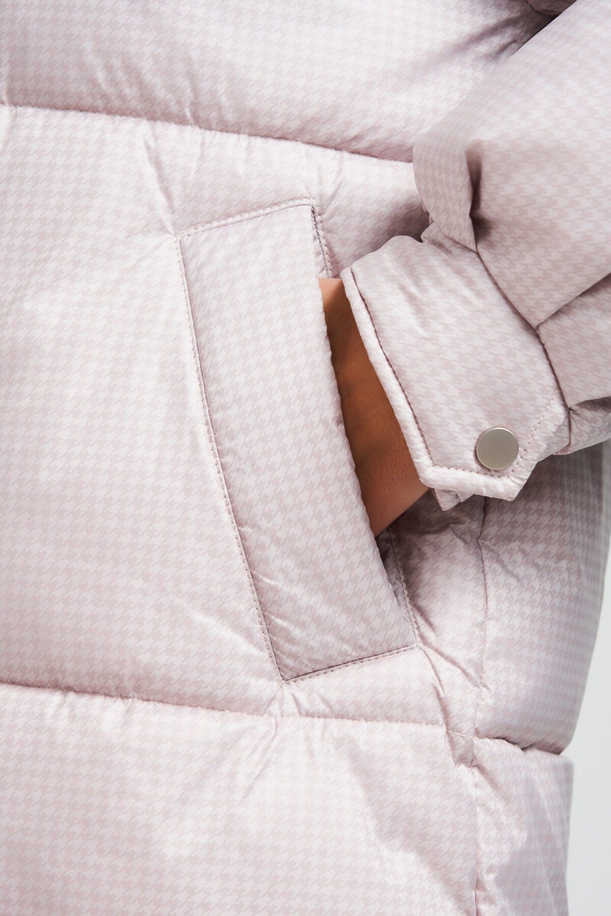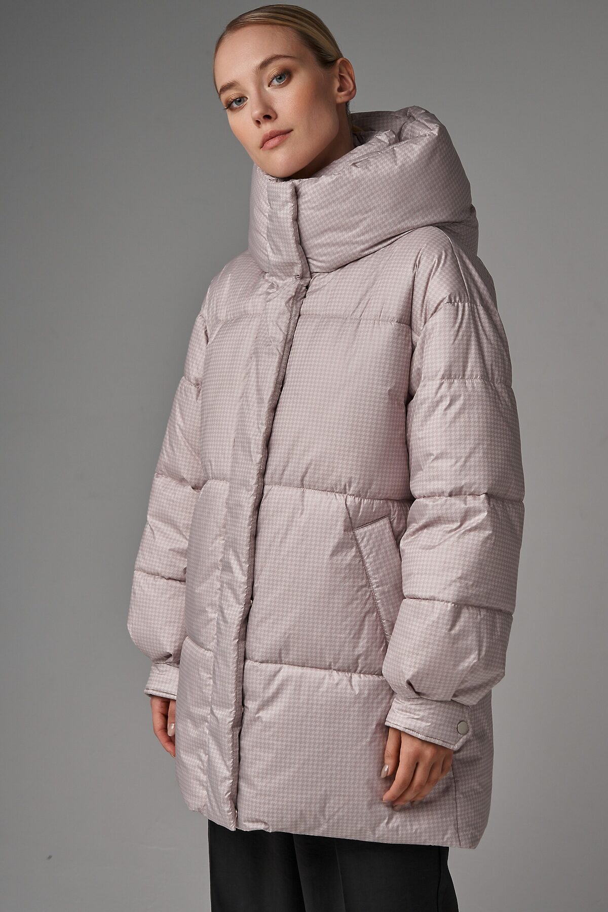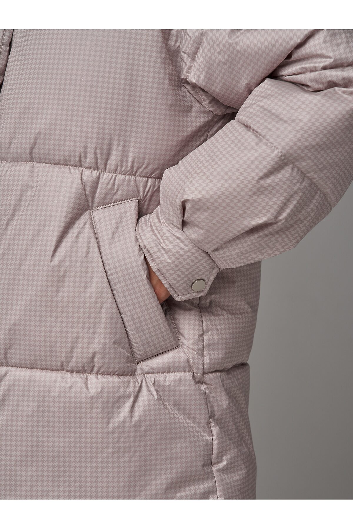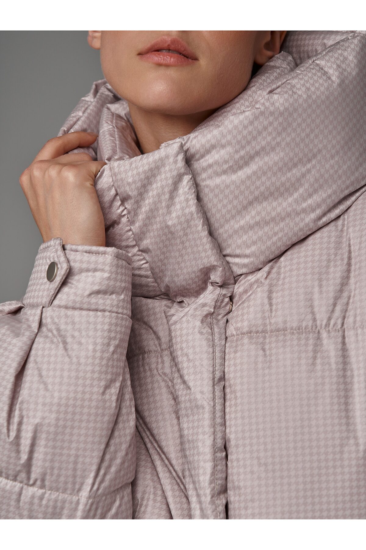 Пуховик oversize силуэта. В изделии есть внутренняя утяжка по низу. Рукав со спущенным плечом. По низу рукавов заложены складки и имеются манжеты с отделочными кнопками. Застежка на молнию, скрытую под планкой на потайных кнопках. В изделии имеются два функциональных кармана с листочками на магнитах и один внутренний карман. Ткань - плащевая с водоотталкивающей пропиткой. Утепление - Био-пух, 200 гр. Рекомендуемый температурный режим (от 0°C до -15°C). Длина изделия - 85 см. Длина рукава - 64 см.
