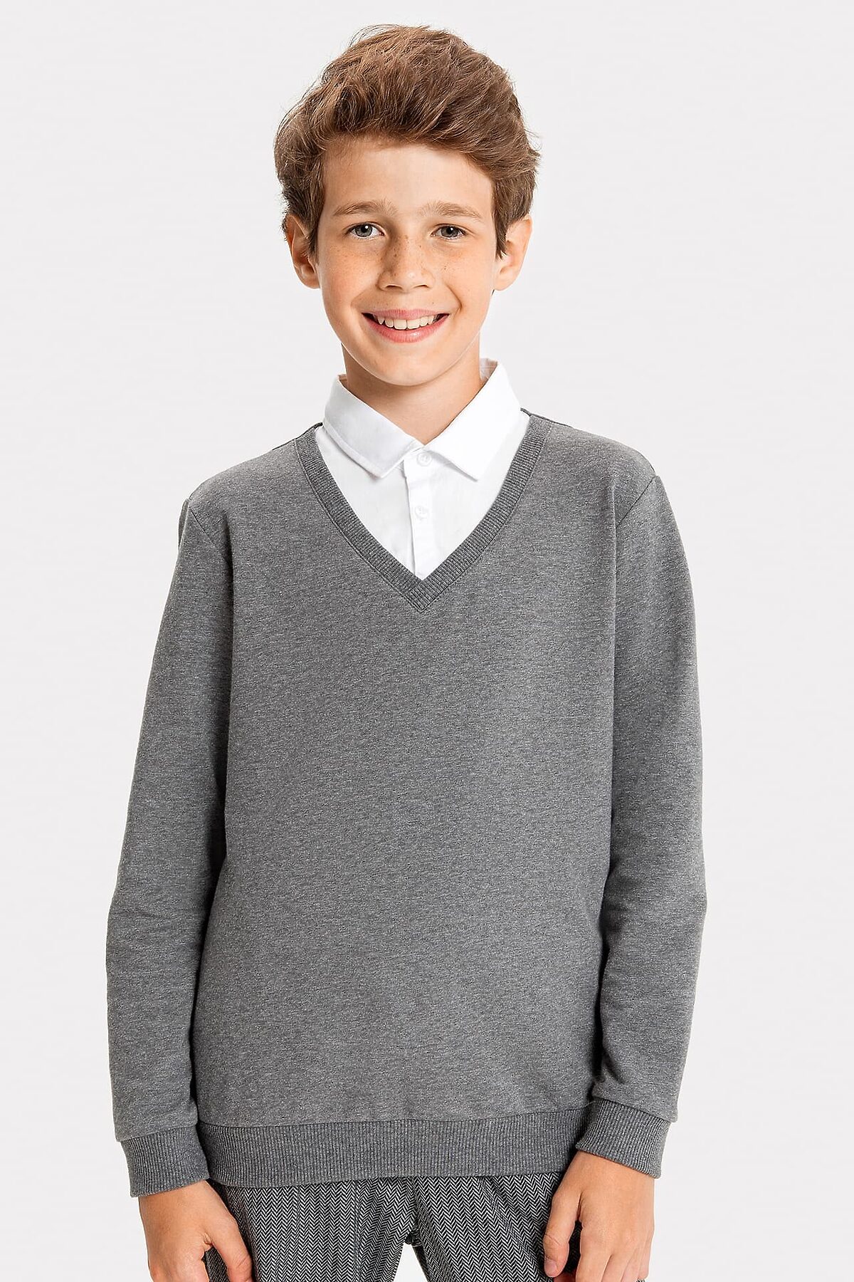Прямой джемпер из трикотажного футера. Горловина V-образная, есть декоративная манишка с воротником и планкой с пуговицами. Рукава длинные, с манжетами из рибаны, как и пояс по нижнему краю джемпера. Стильно!