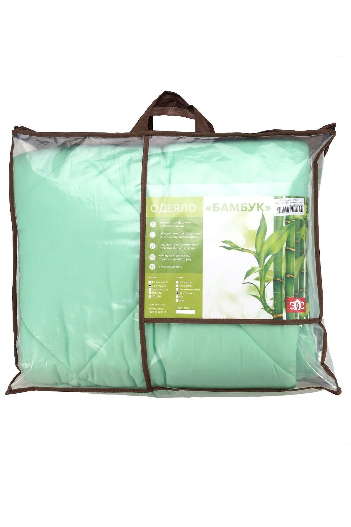 Одеяло 1,5-спальное, облегченное, стеганое с кантом. Наполнитель: бамбук пласт 150г/м2. Ткань чехла: прессатин-мягкая, бархатистая, однотонная, плотность 90г/м2. Упаковка: сумка ТМ Эйс