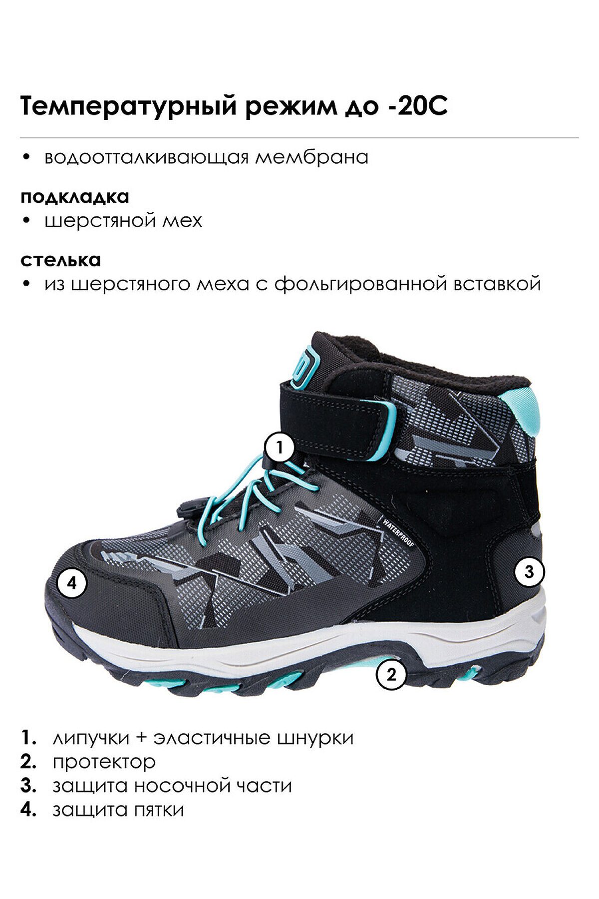 Конструкция верха изготовлена с использованием мембранных технологий. Усиленная защита носка и пятки специальными материалами. Подкладка и стелька выполнены из шерстяного меха 80%. Трехслойная стелька с фольгой, которая обеспечивает сохранение тепла в течение длительного времени. Формоустойчивый задник поддерживает стопу в правильном положении. Подошва имеет противоскользящий протектор. Удобная застежка-липучка и шнурок-утяжка. Рекомендованный температурный режим от 0°С до -20°С.