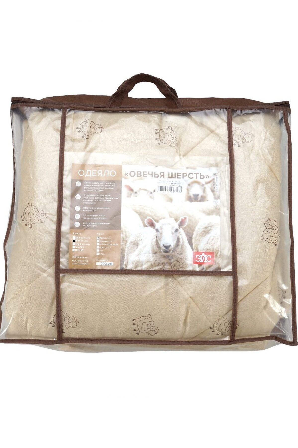Одеяло 2х-спальное, облегченное, стеганое с кантом. Наполнитель: термополотно из овечьей шерсти 150г/м2. Ткань чехла: полиэстер, плотность 60 г/м2. Цвет- бежевый, тематика "Овечка" Упаковка: сумка ТМ Эйс
