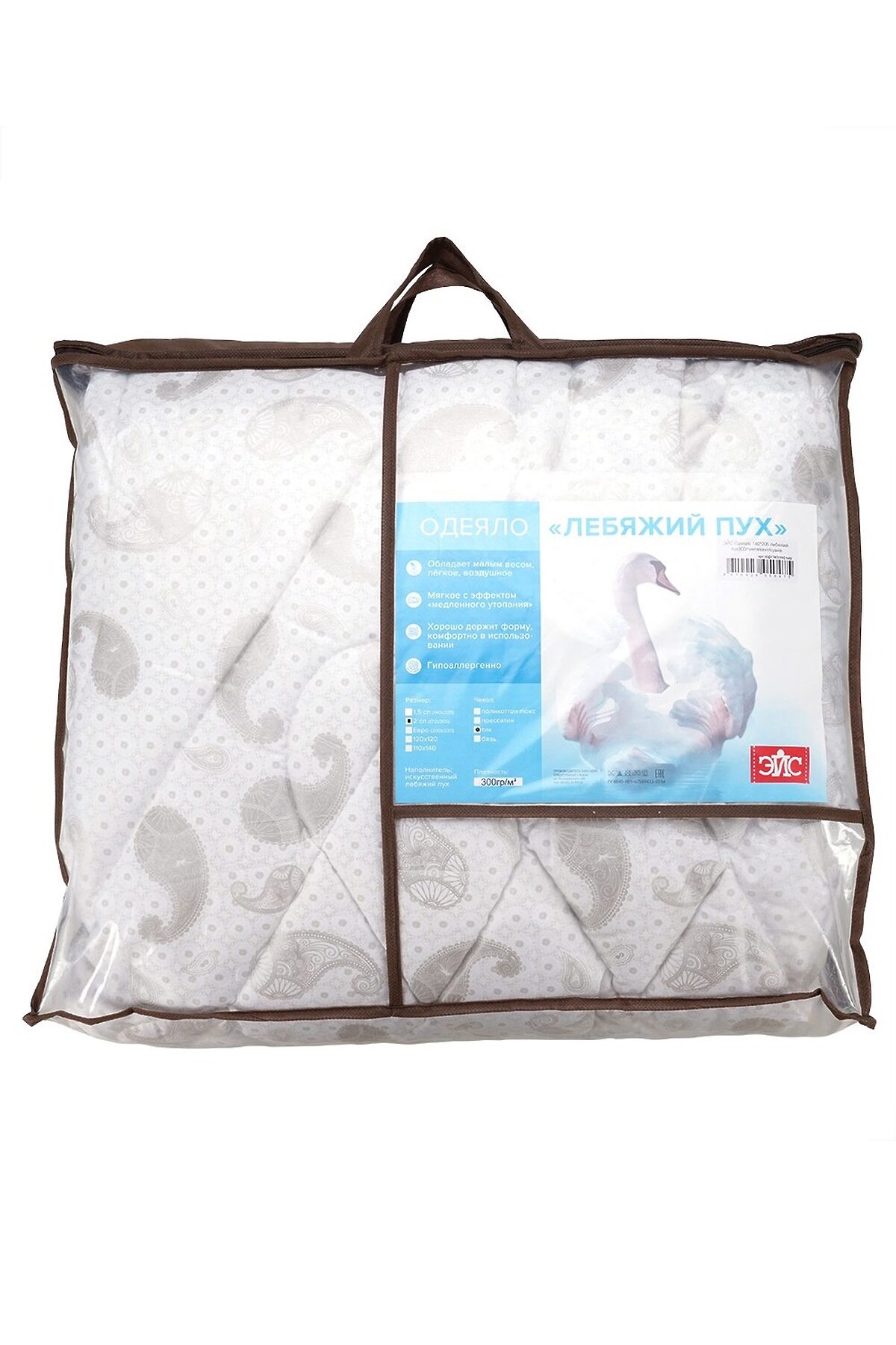 Одеяло "Евро", теплое, стеганое с кантом. Наполнитель: искусственный лебяжий пух, чёс 300г/м2. Ткань чехла: тик 100% ПЭ , плотность 110г/м2, с пуходержащей пропиткой. Цвет: ассорти Упаковка: сумка ТМ Эйс