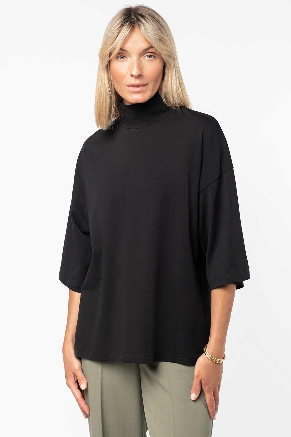 Джемпер-водолазка over-size выполнен из премиального мягкого хлопка. Наличие эластана в составе изделия, способствует формоустойчивости и меньшей сминаемости. Свободный силуэт не сковывающий движений подходит для любого типа фигуры. Хорошо сочетается в паре с джинсами или классическими брюками.