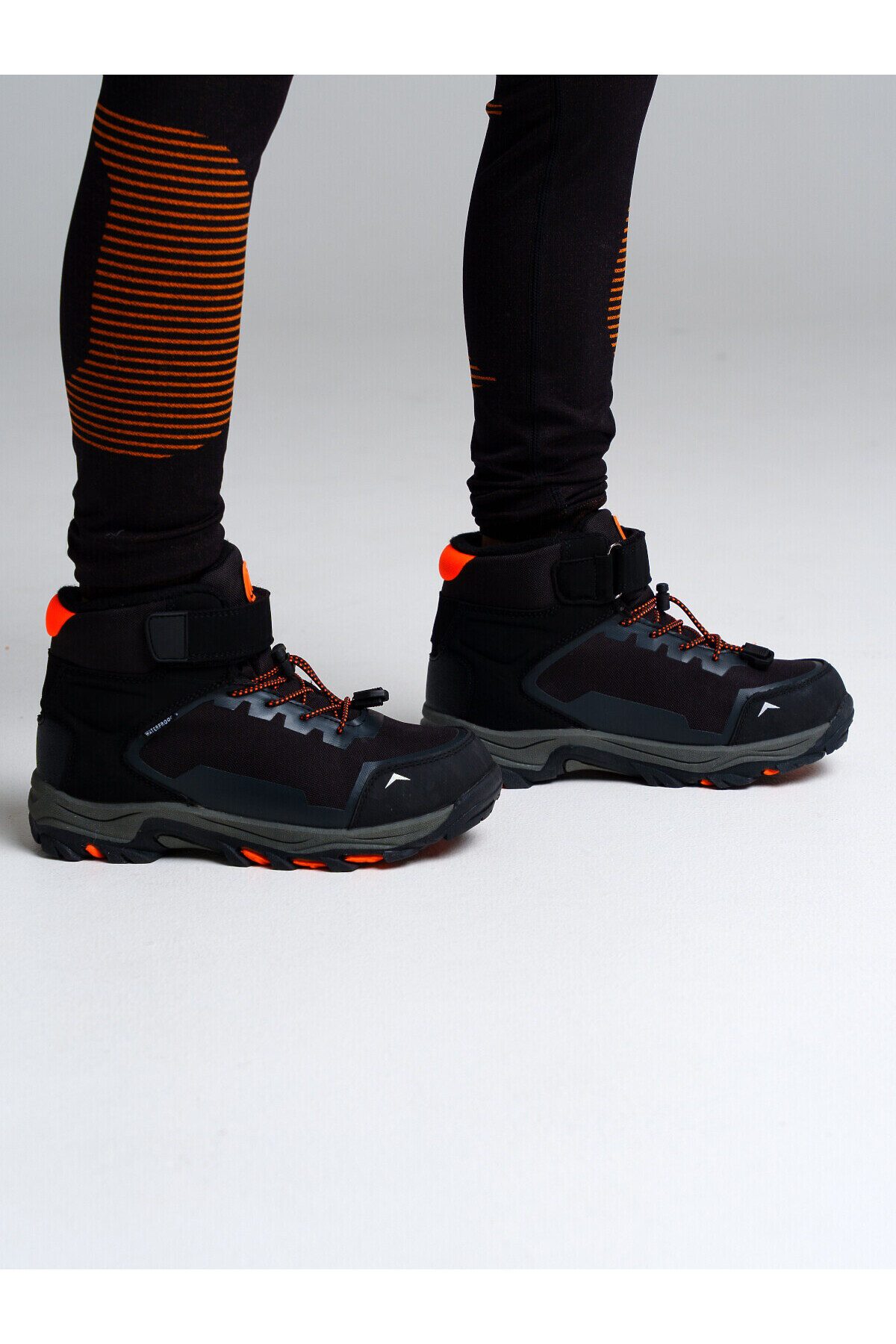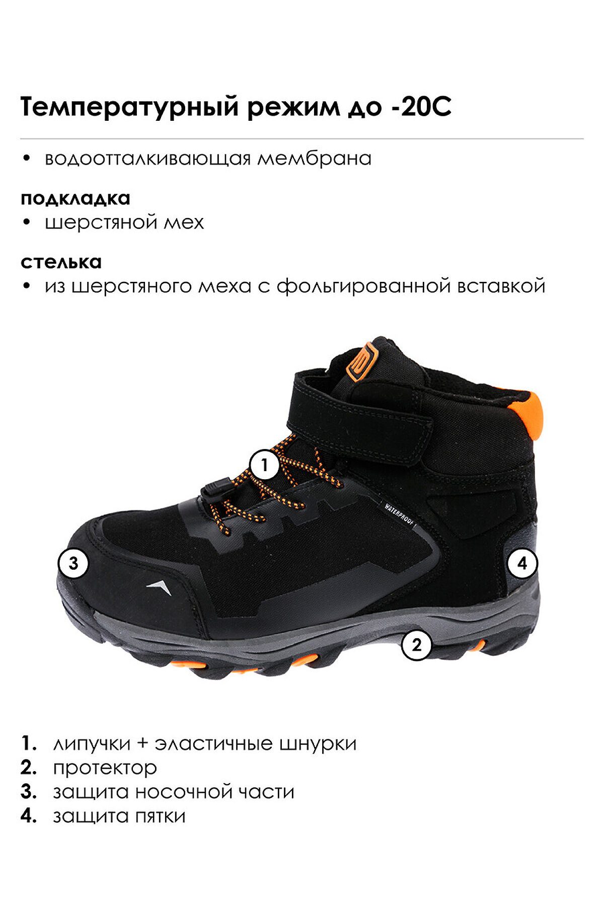 Конструкция верха изготовлена с использованием мембранных технологий. Усиленная защита носка и пятки специальными материалами. Подкладка и стелька выполнены из шерстяного меха 80%. Трехслойная стелька с фольгой, которая обеспечивает сохранение тепла в течение длительного времени. Формоустойчивый задник поддерживает стопу в правильном положении. Подошва имеет противоскользящий протектор. Удобная застежка-липучка и шнурок-утяжка. Рекомендованный температурный режим от 0°С до -20°С.