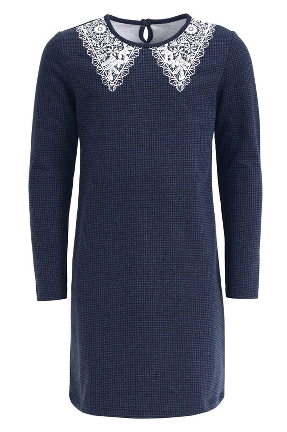 Платье для девочки выполнено из футера - мягкого плотного хлопкового полотна с лайкрой. Изделие с длинными рукавами, сзади застегивается на пуговицу, украшено печатью имитирующей кружево. Отличный выбор для школьницы на каждый день! Уход: только машинная стирка (руками не стирать!) при температуре 40 градусов, без предварительного замачивания. Изделия с печатью и декором перед стиркой необходимо вывернуть на изнаночную сторону. Материал: футер