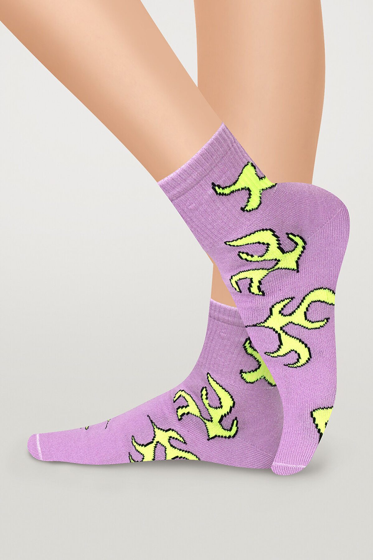 Стильные носки для девушки, с изображением языков зеленого пламени. Идеально подойдут для повседневной носки. Выполнены из мякого трикотажа, что не вызывает дискомфорта при носке, отлично сидят на ножке
