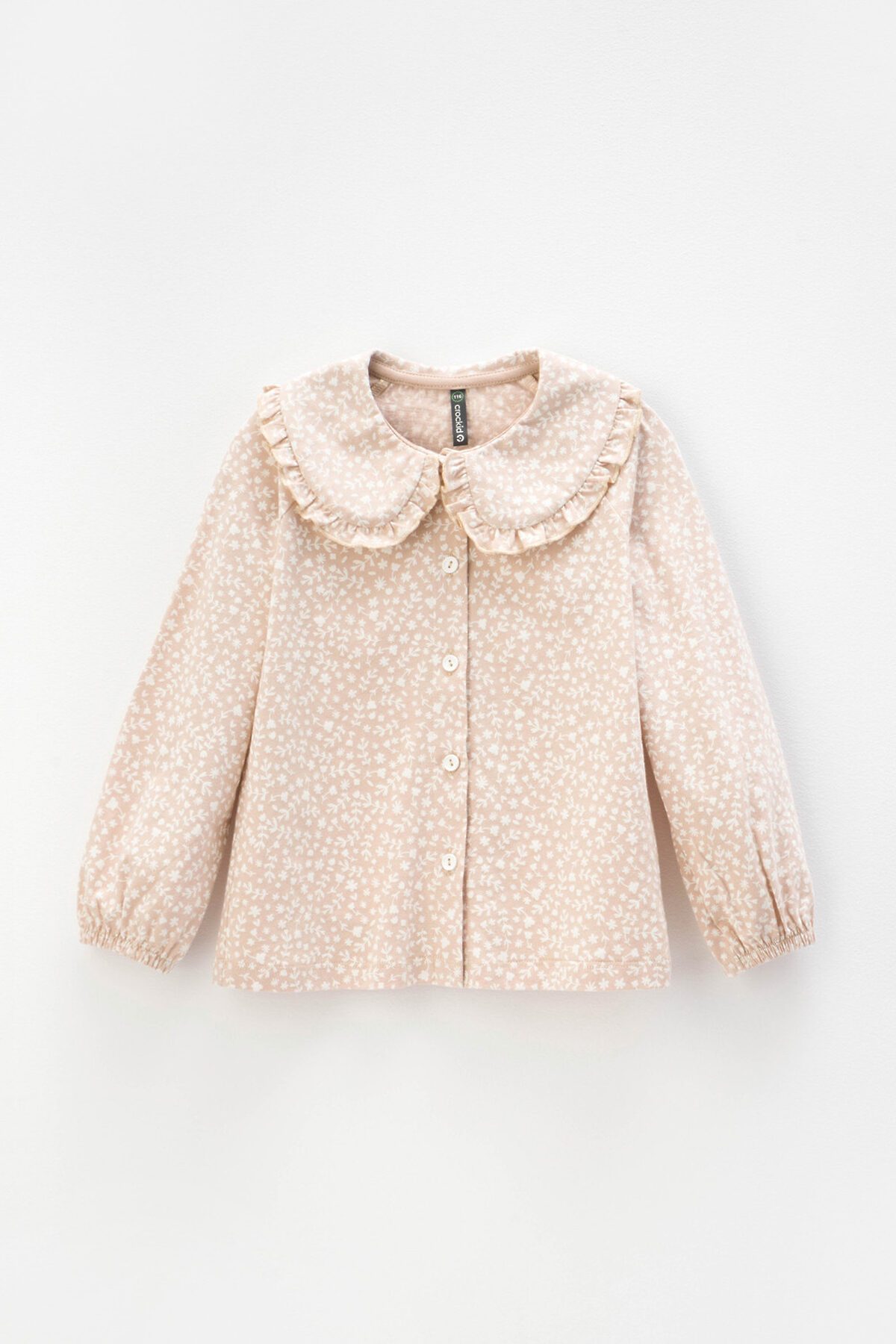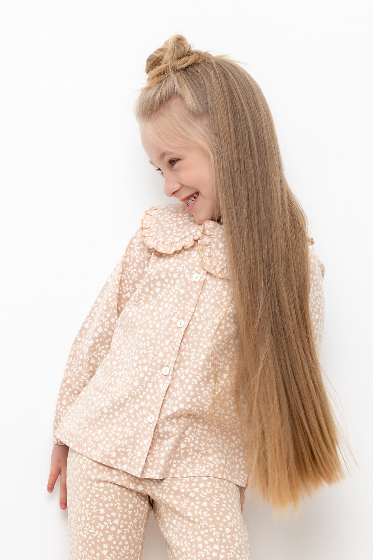 Рубашка для девочки из гладкого трикотажного полотна. Застегивается на пуговицы по всей длине изделия. Украшена объемных воротником с рюшами. Оригинальная набивка выполнена из стойких текстильных гипоаллергенных красителей.
