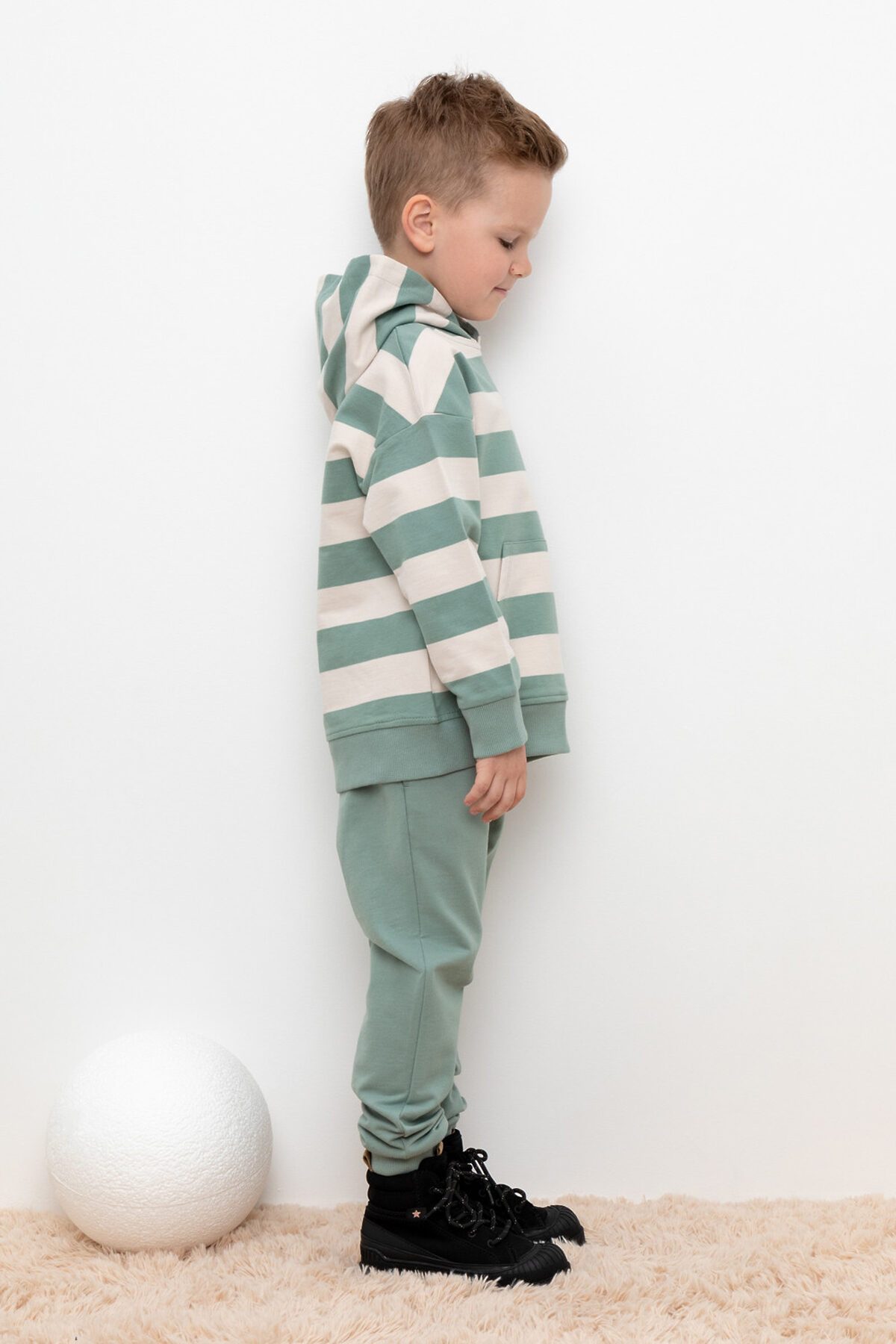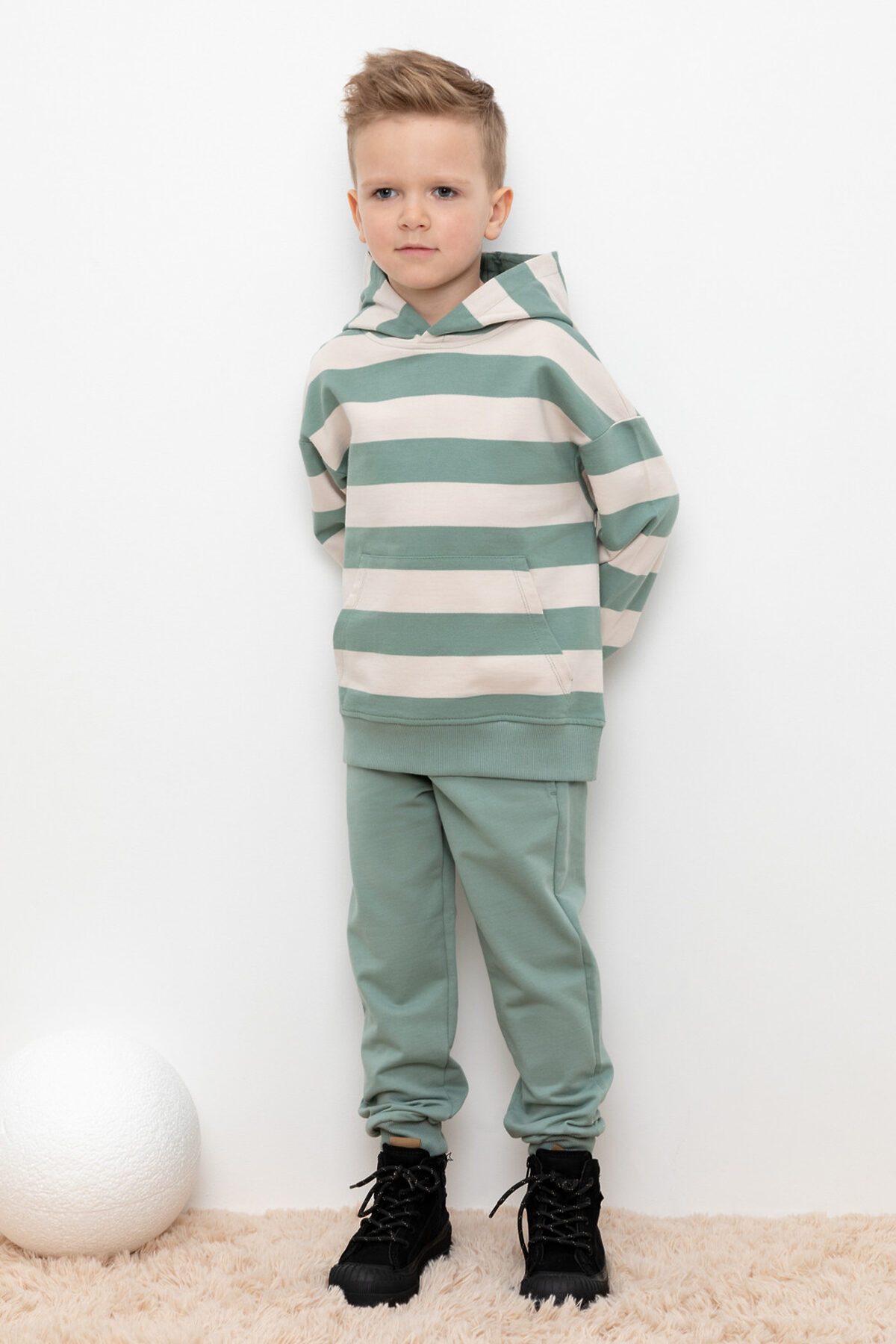 Трикотажные брюки для мальчика из петельчатого футера. Эластичный пояс на резинке регулируется по ширине с помощью шнурка, по бокам два удобных кармана, внизу эластичные манжеты.