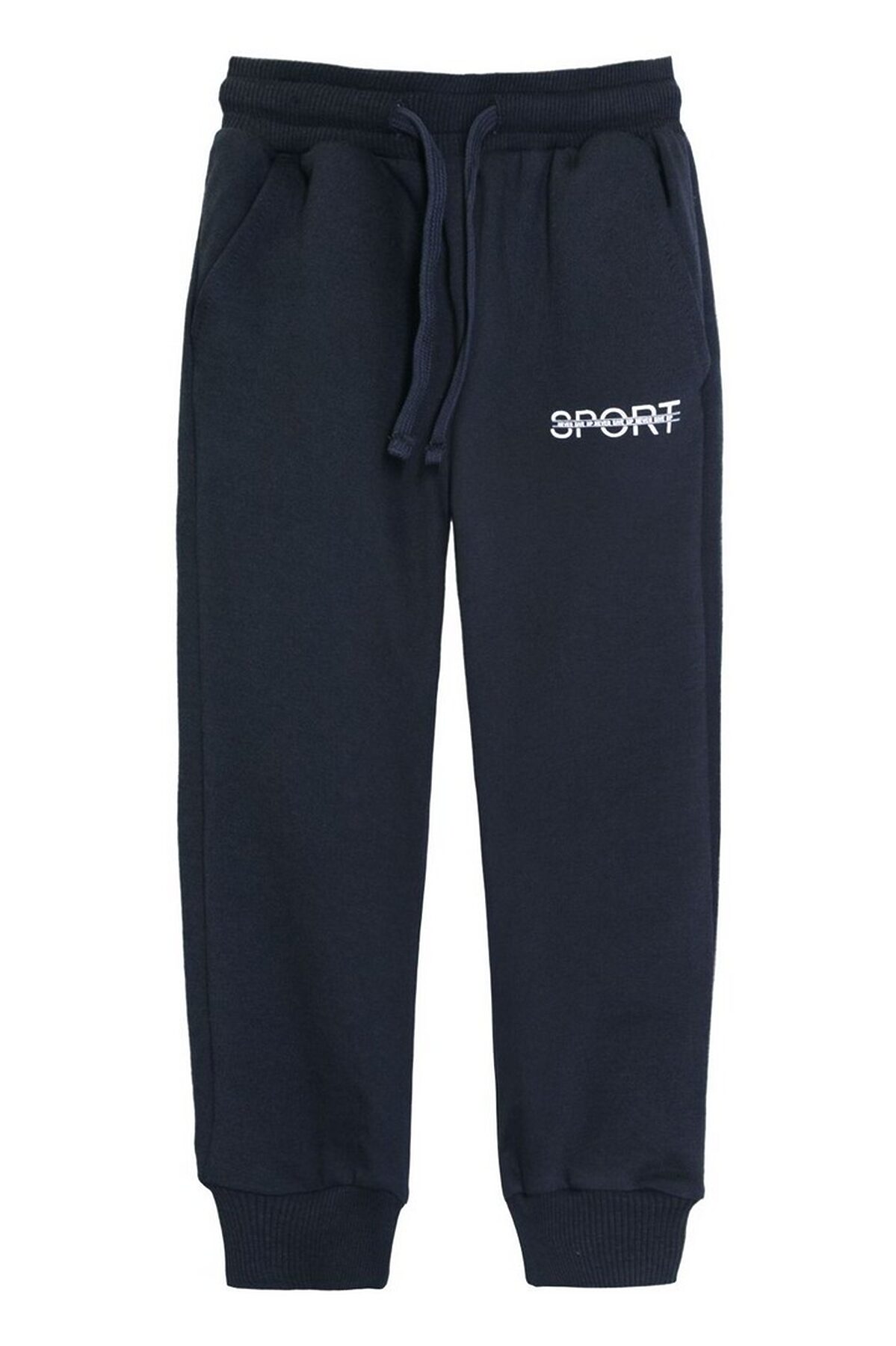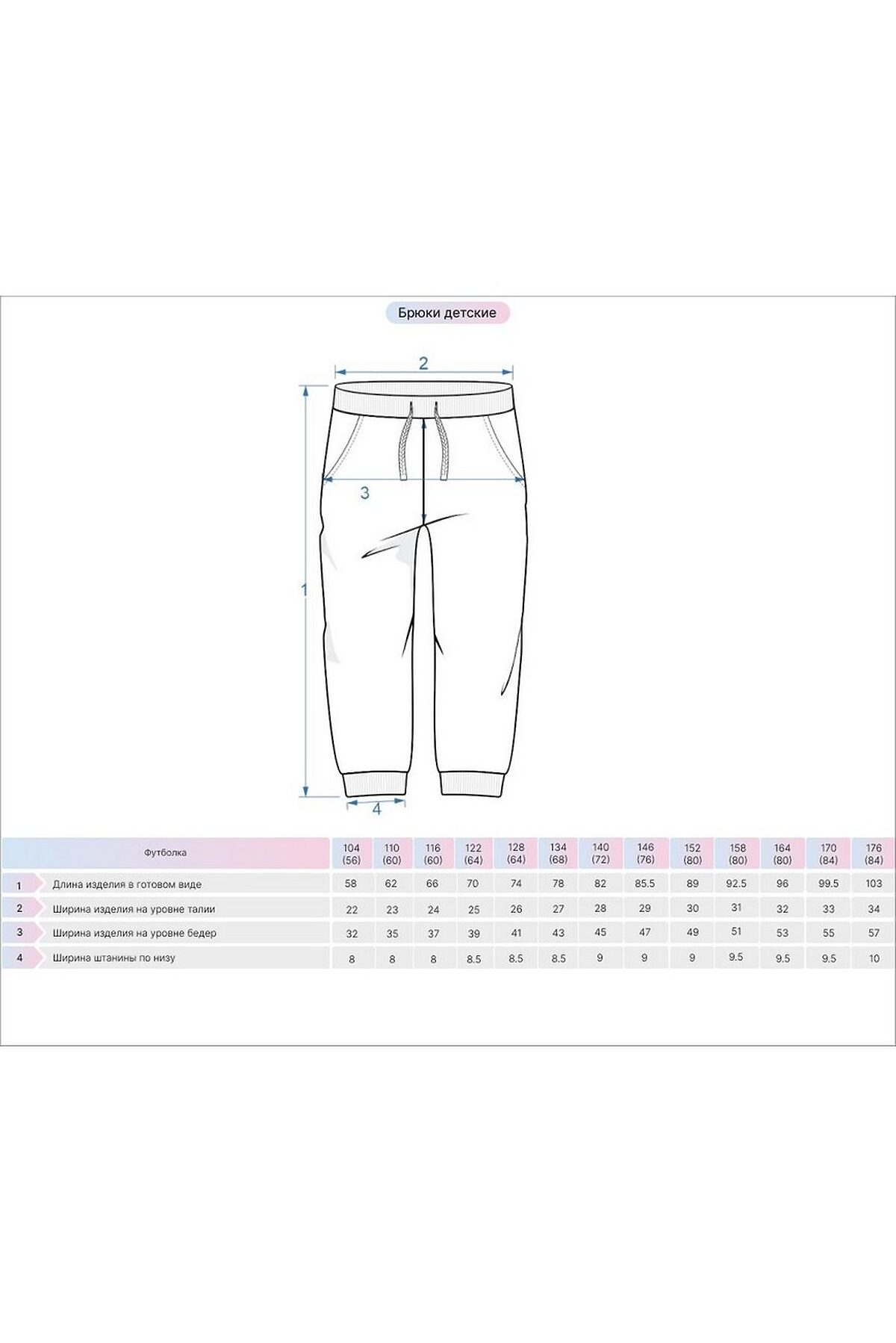 Брюки детские прямого силуэта. Пояс отрезной, выполнен из кашкорсе, в цвет изделия, с эластичной тесьмой внутри, тесьма закреплена в шов. На изделии выполнены карманы с отрезным бочком и отлетной мешковиной, вход в карман обтачной. По низу изделия манжеты из кашкорсе. На передней половинки брюк принт шелкография.