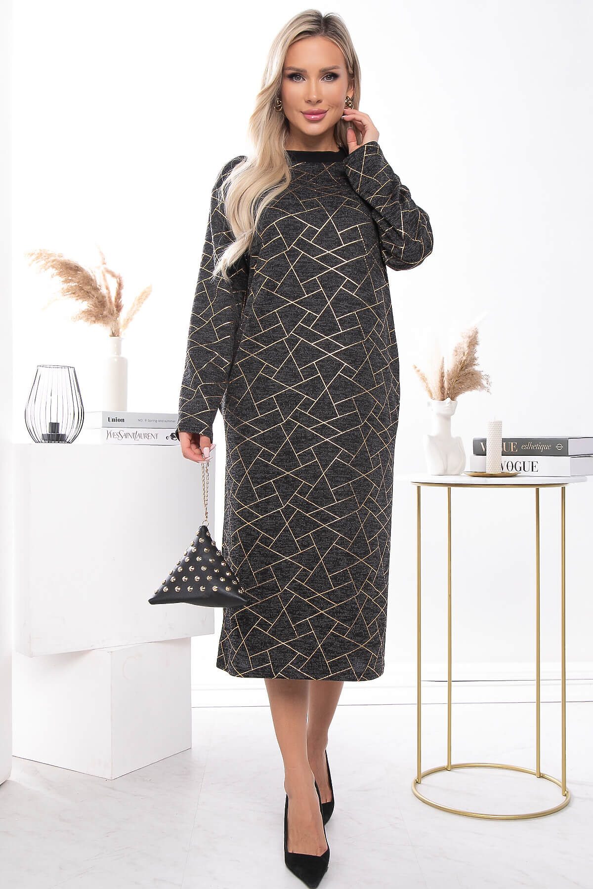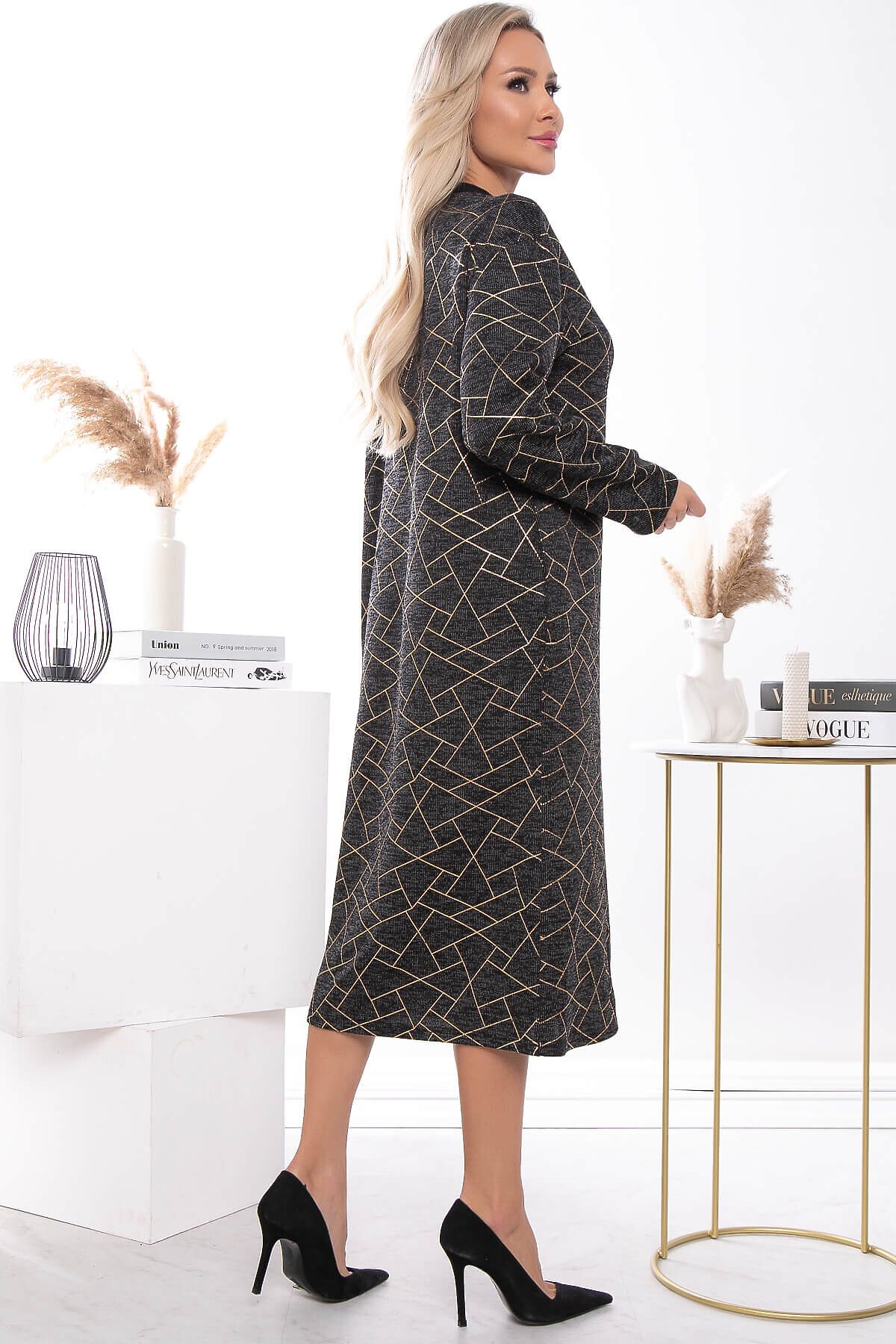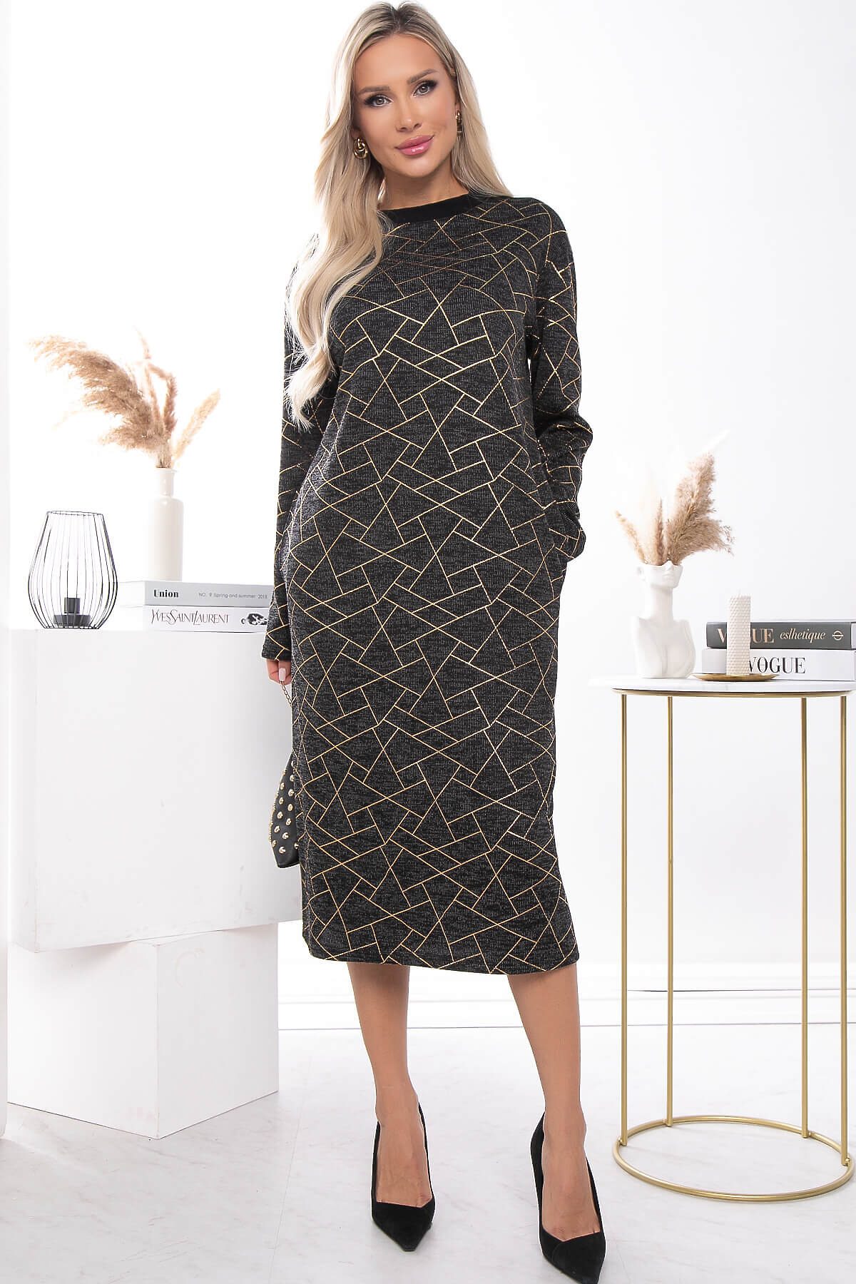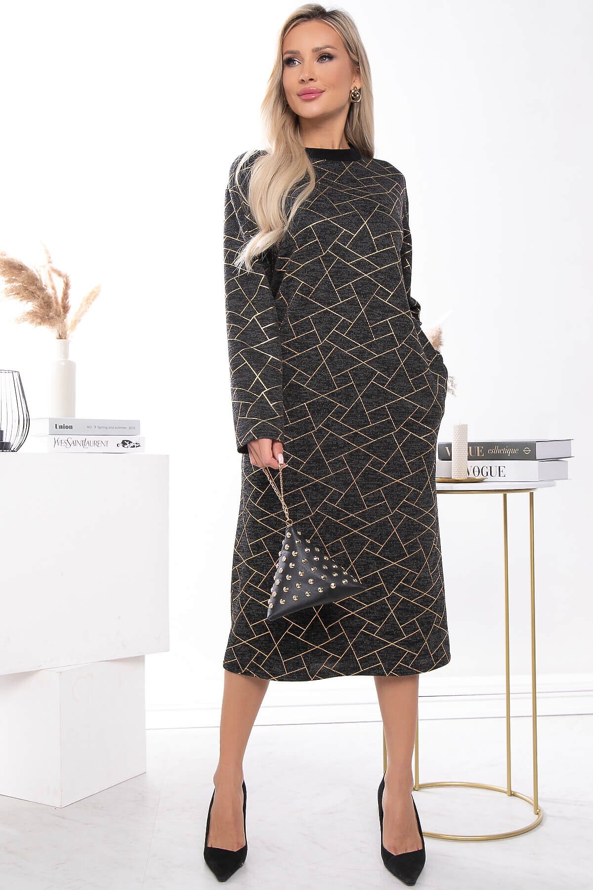 Платье для комфортного повседневного образа. Такие вещи очень универсальны и всегда выручают в ситуации, когда не знаешь, что надеть. Платье прямого кроя свободного силуэта. Рукава длинные со спущенным плечевым швом. Изделие украшает принт с вставками золотого цвета. В боковых швах есть карманы.