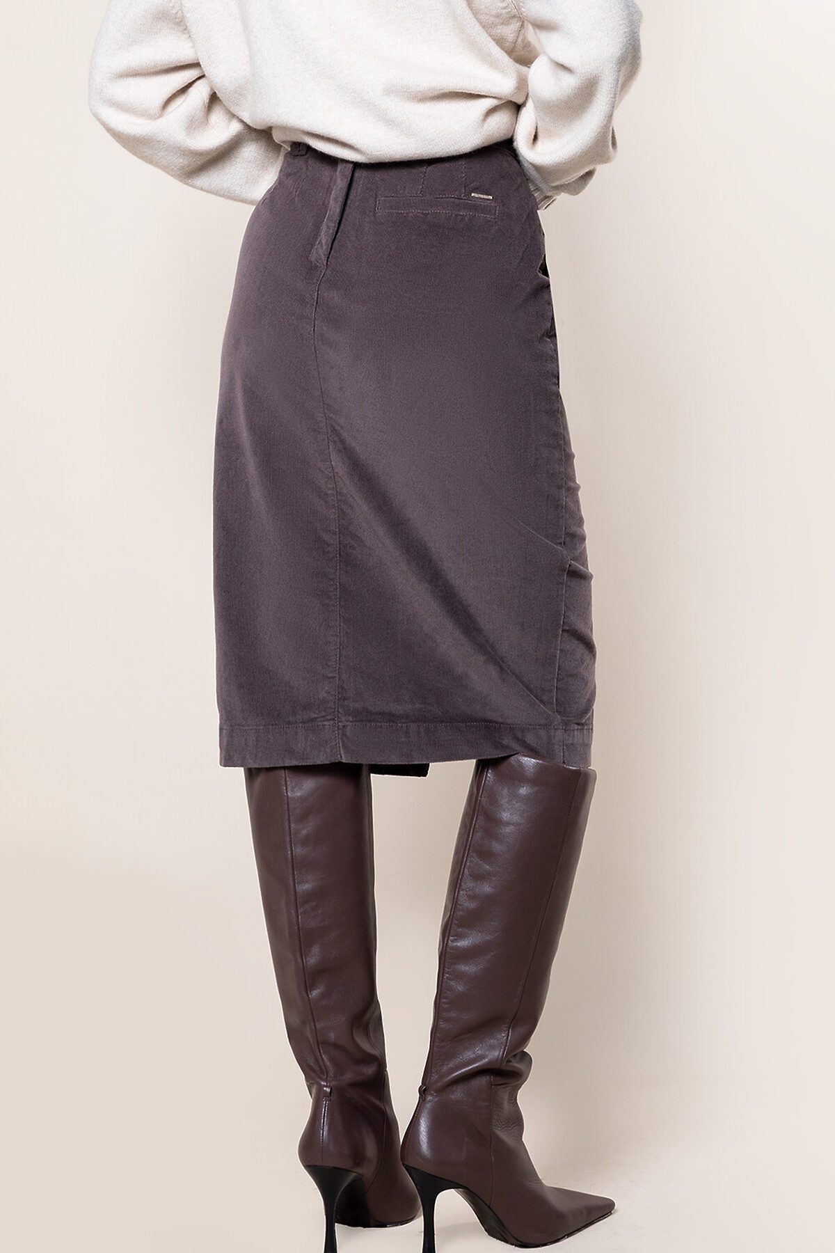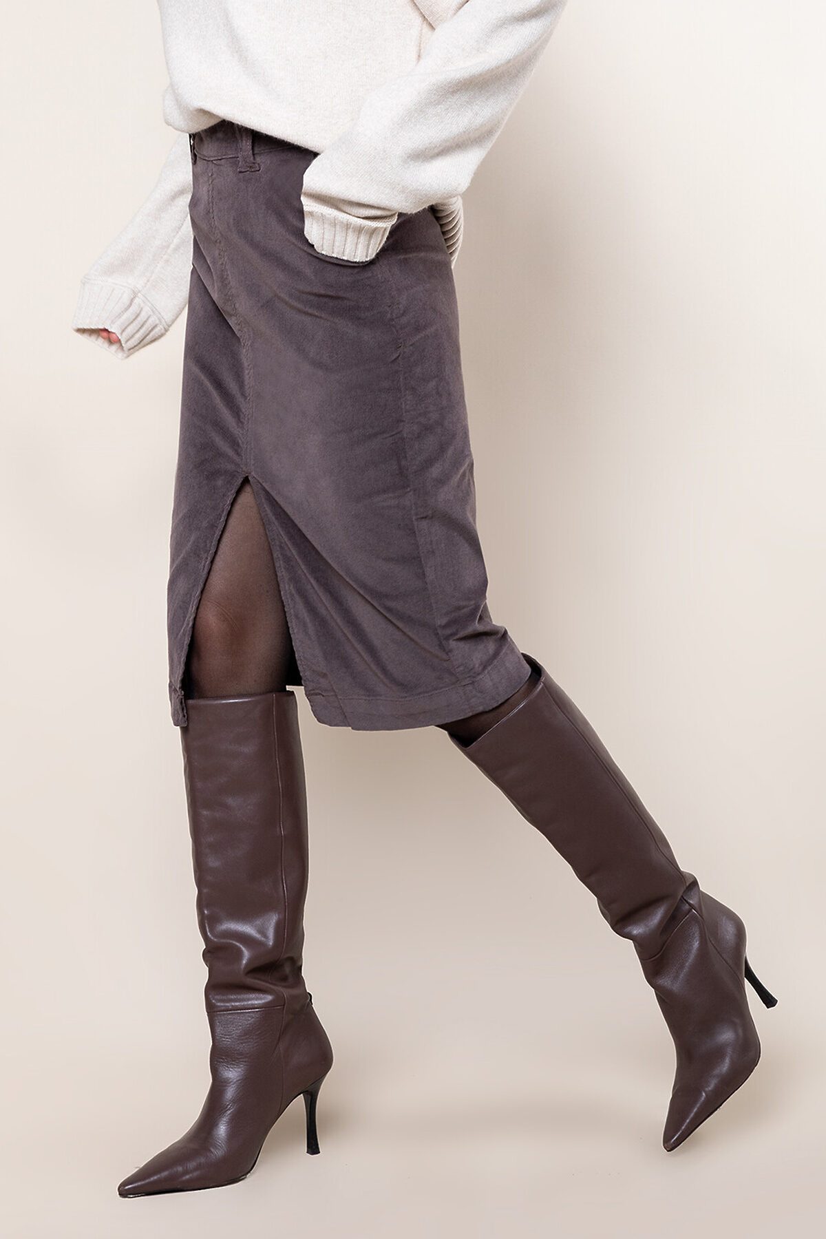 Юбка-карандаш с высокой посадкой на талии, выполнена из эластичного вельвета. Материал очень мягкий но при этом плотный и легко тянется, не мешая движениям. Модель дополнена карманами по бокам, а нужный эффект создает вертикальный шов спереди, переходящий в соблазнительный разрез.