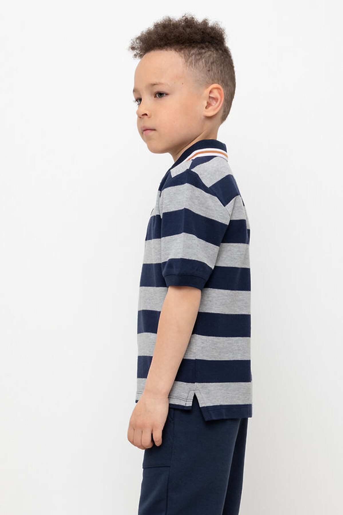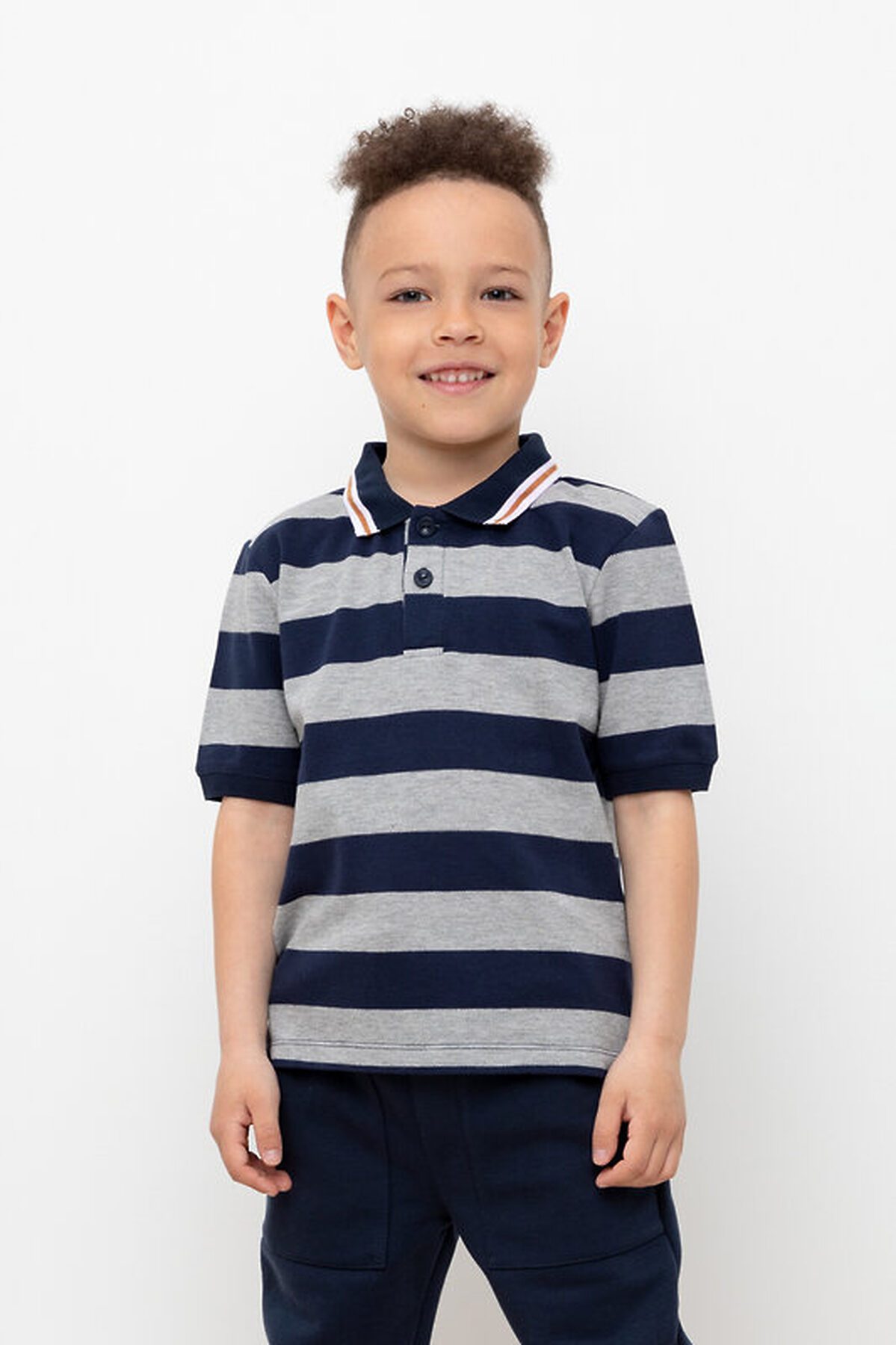 Поло для мальчика из высококачественного трикотажного полотна пике. У изделия вязаный воротник и застежка спереди на две пуговицы.