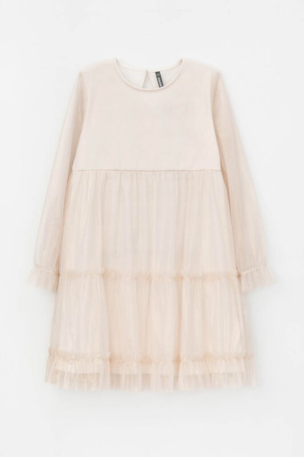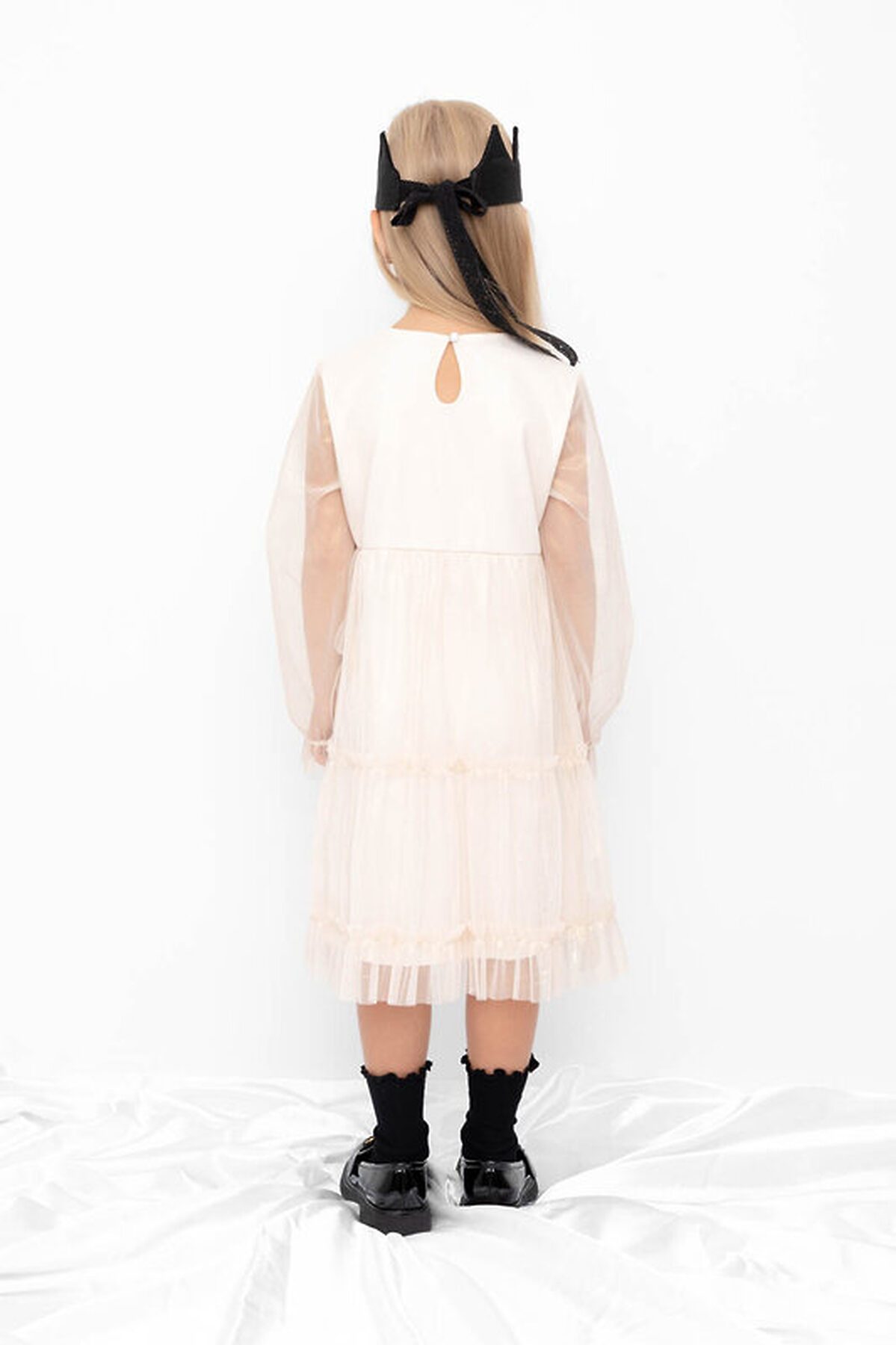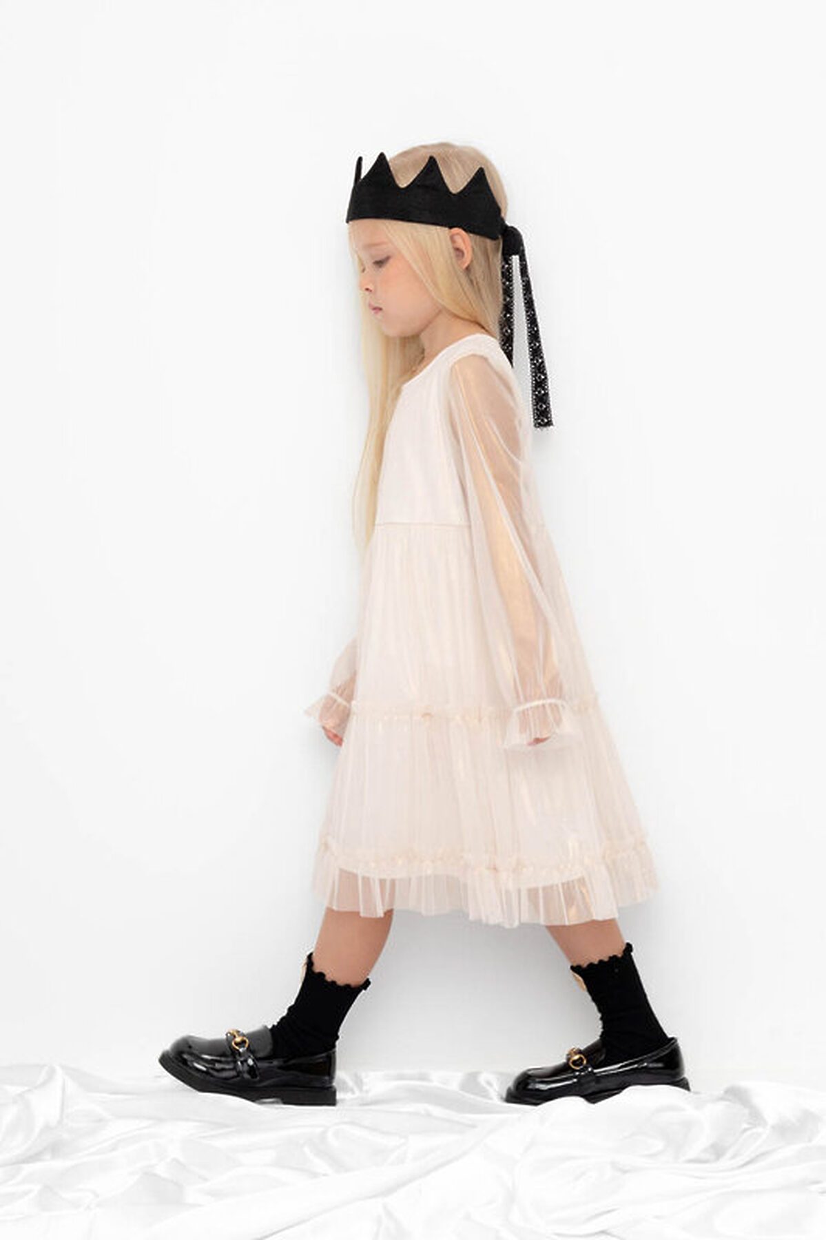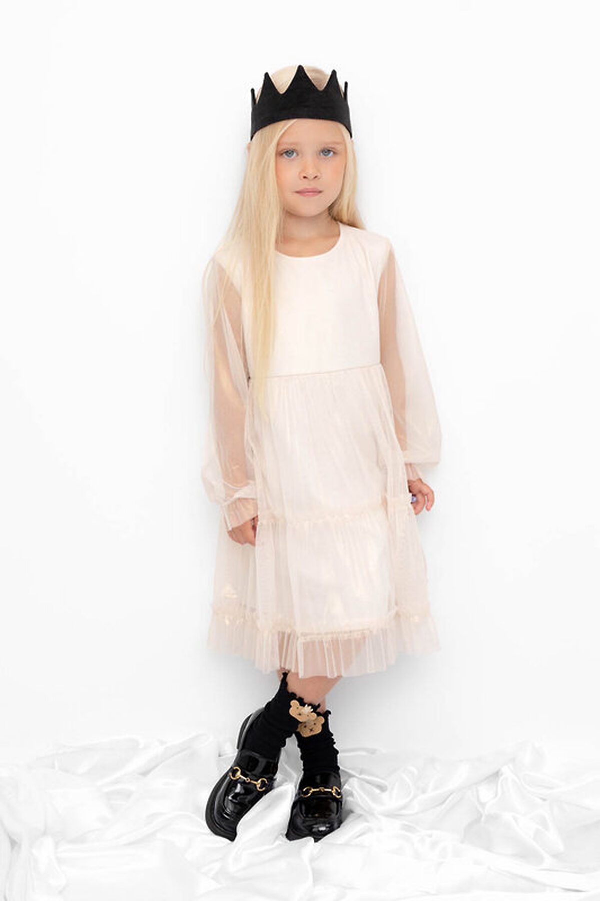 Нарядное платье для девочки из высококачественного трикотажа супрем с лёгким слоем из сетки с золотым переливом. Длинные рукава из сетки собраны на резинку. Для удобства одевания платье застёгивается на пуговицу на спинке. Платье сохраняет форму и стойкий цвет после многочисленных стирок и идеально подходит для праздников и фотосессий.
