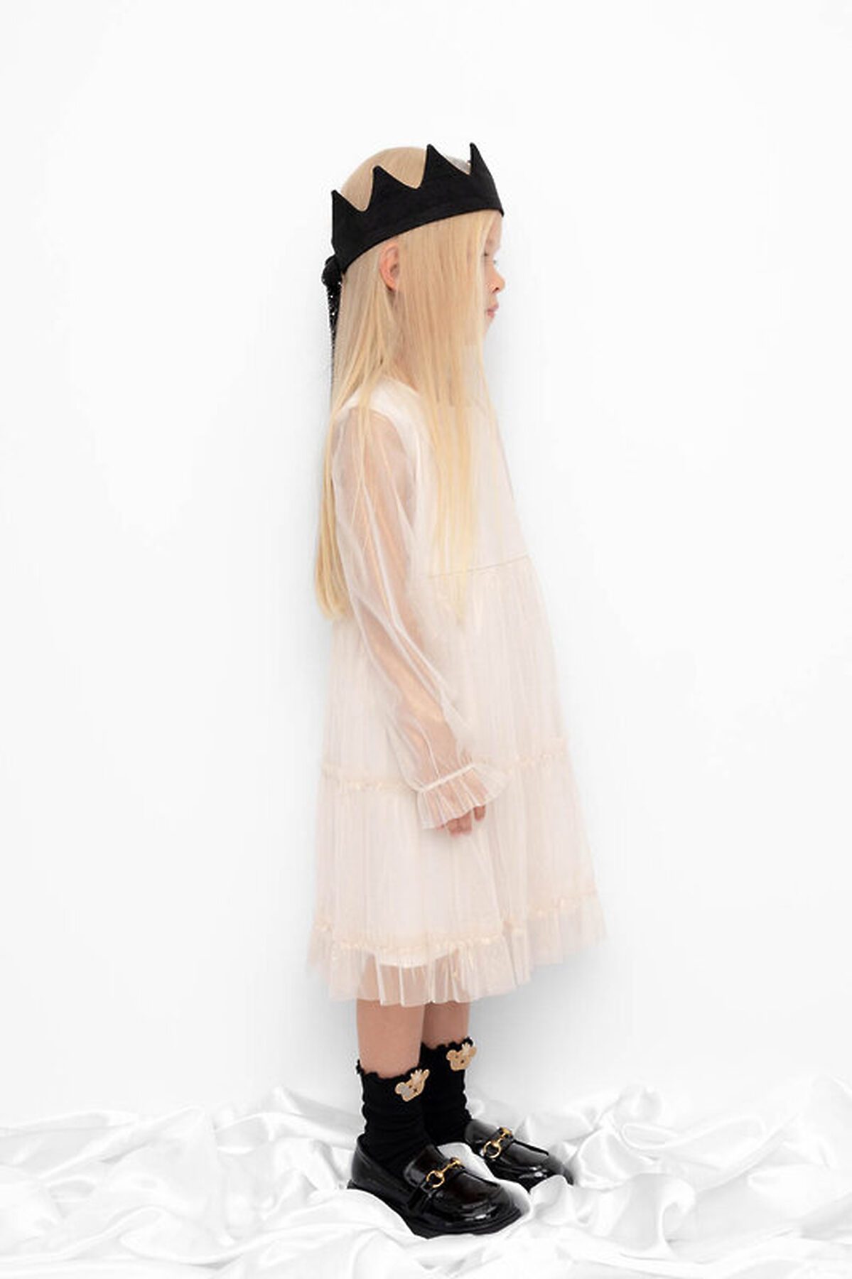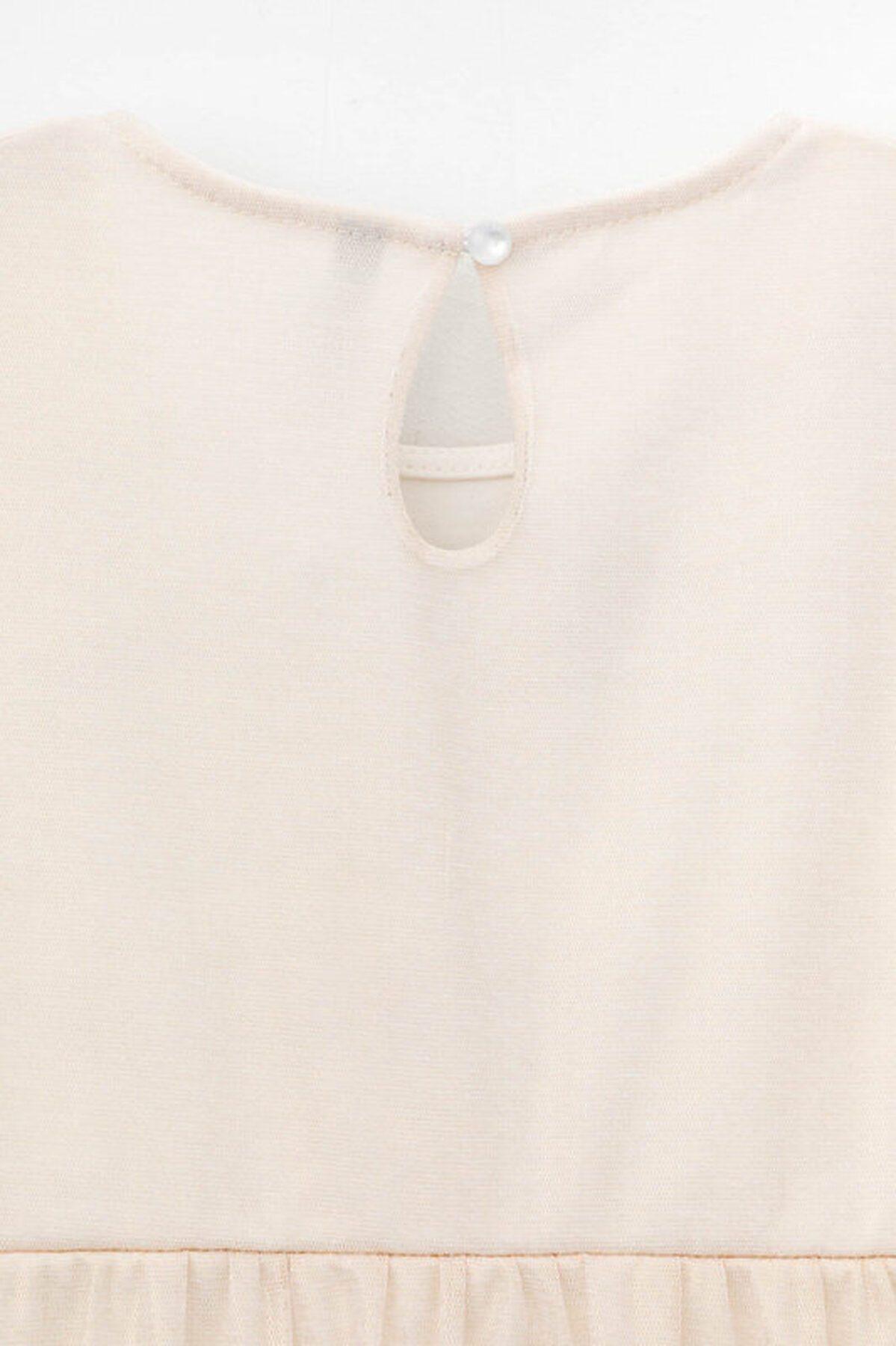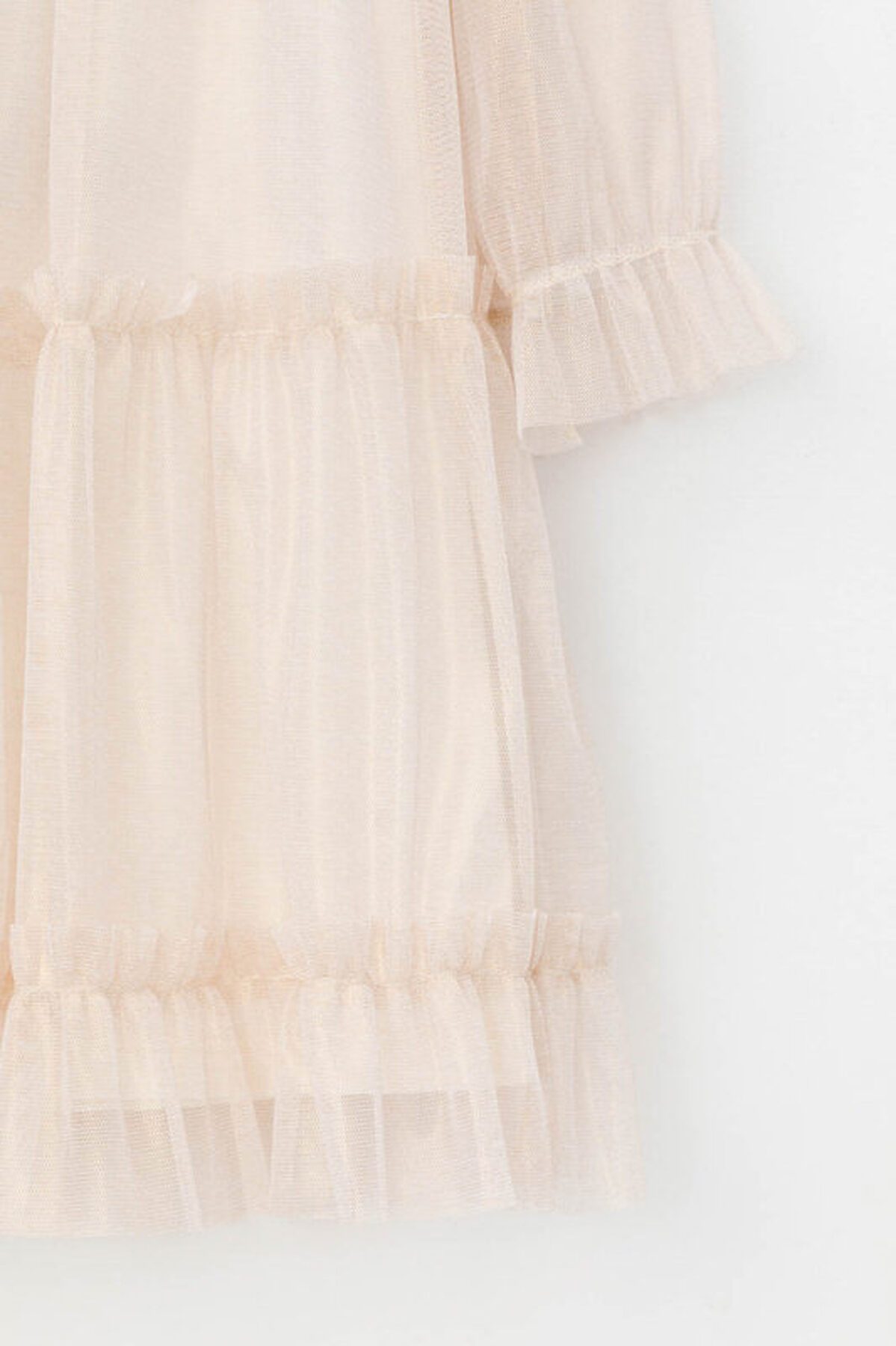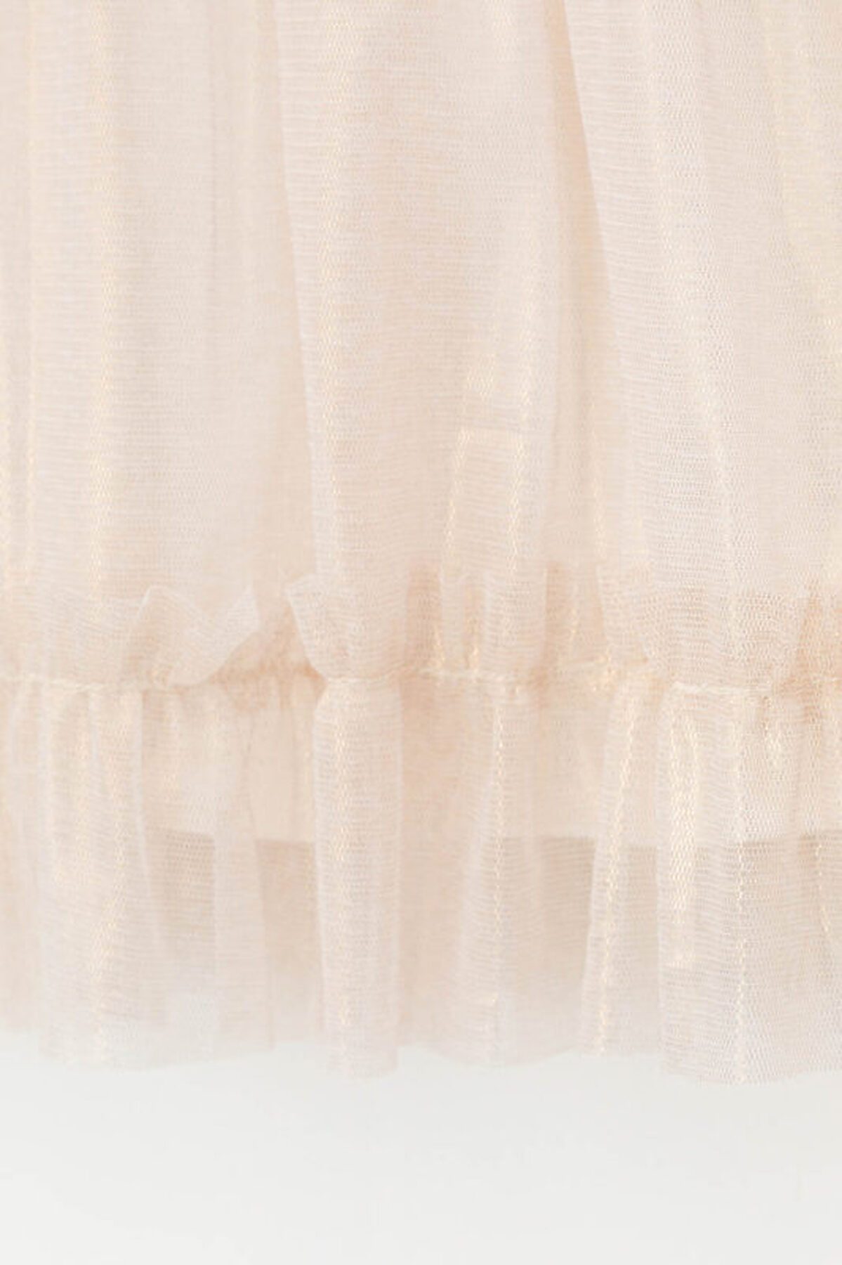 Нарядное платье для девочки из высококачественного трикотажа супрем с лёгким слоем из сетки с золотым переливом. Длинные рукава из сетки собраны на резинку. Для удобства одевания платье застёгивается на пуговицу на спинке. Платье сохраняет форму и стойкий цвет после многочисленных стирок и идеально подходит для праздников и фотосессий.