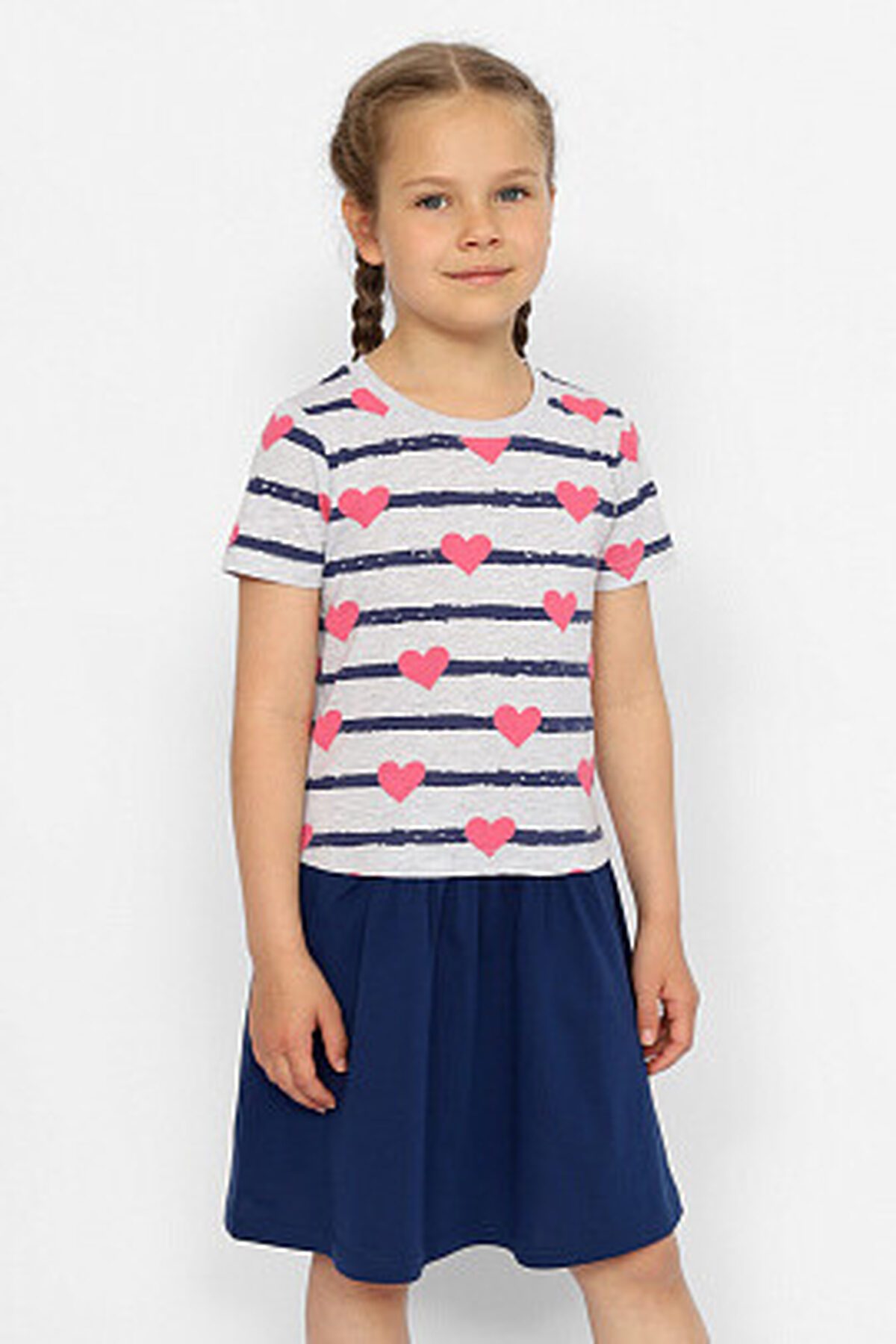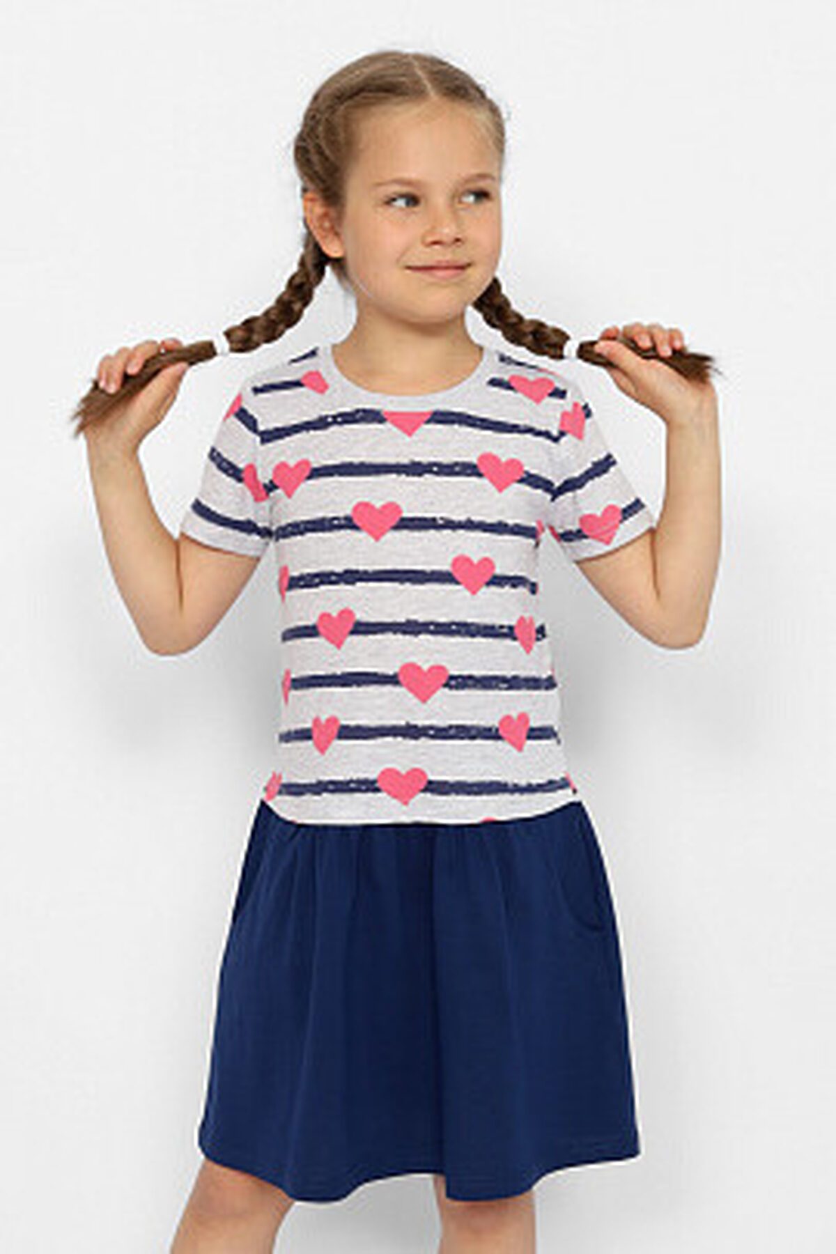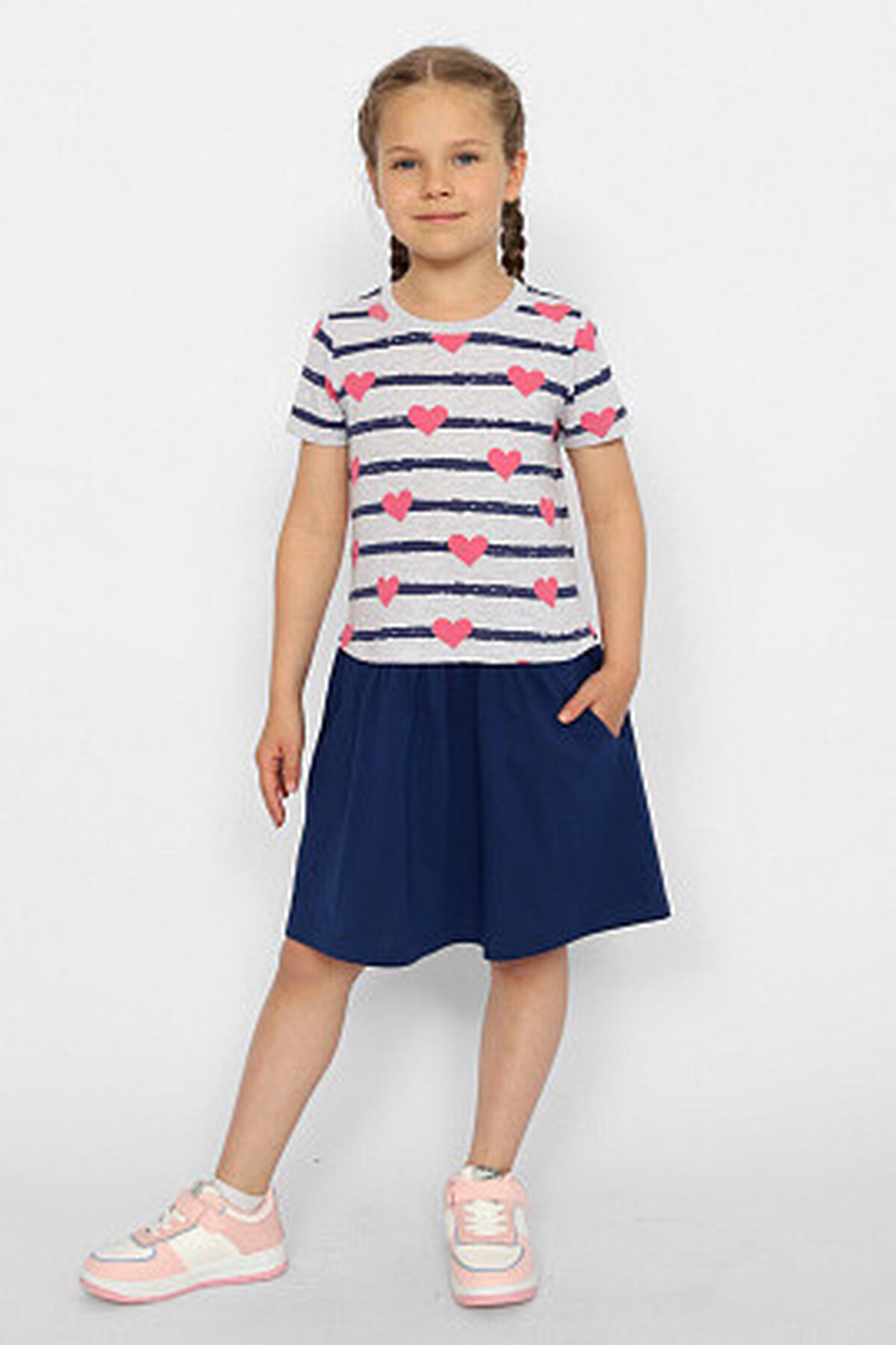 Платье для девочки с короткими рукавами и отрезной юбкой по линии ниже талии. На юбке обработаны боковые карманы. Горловина обработан узким воротником из полотна с эластаном.