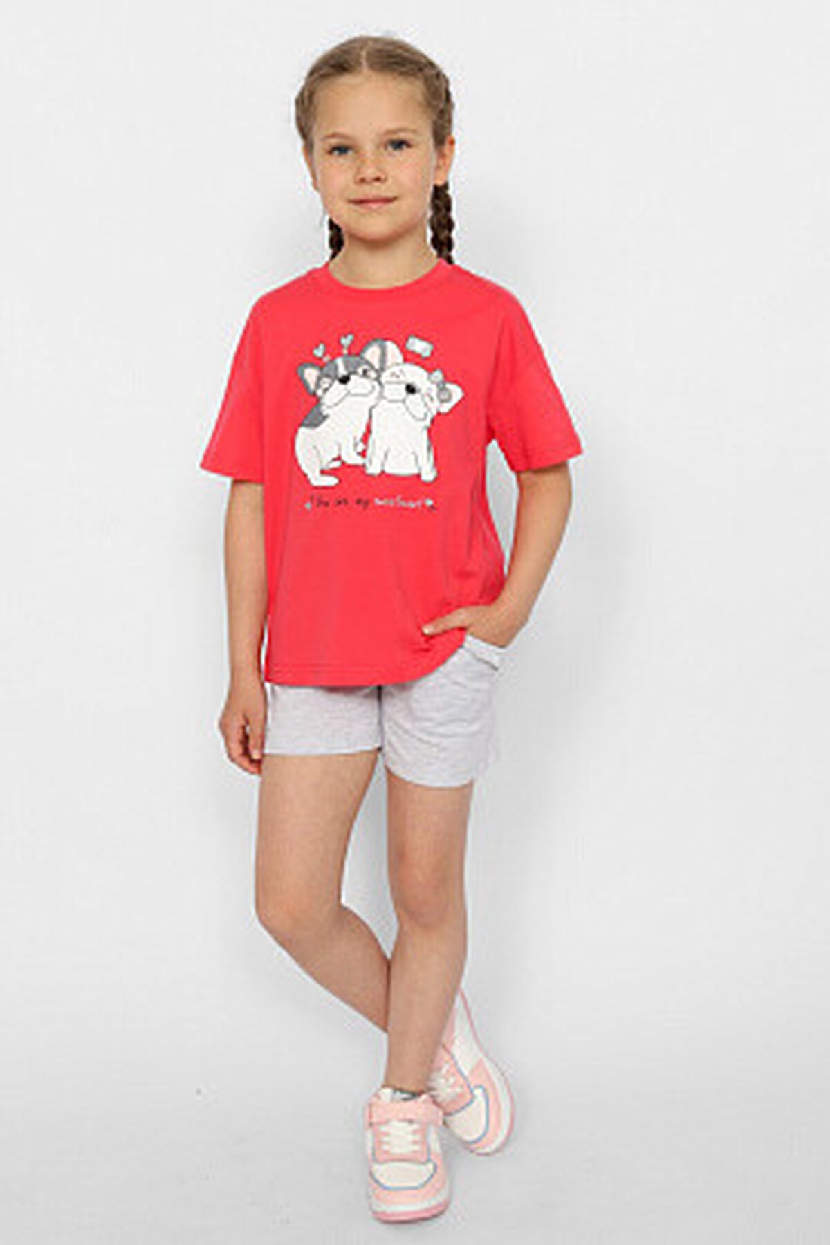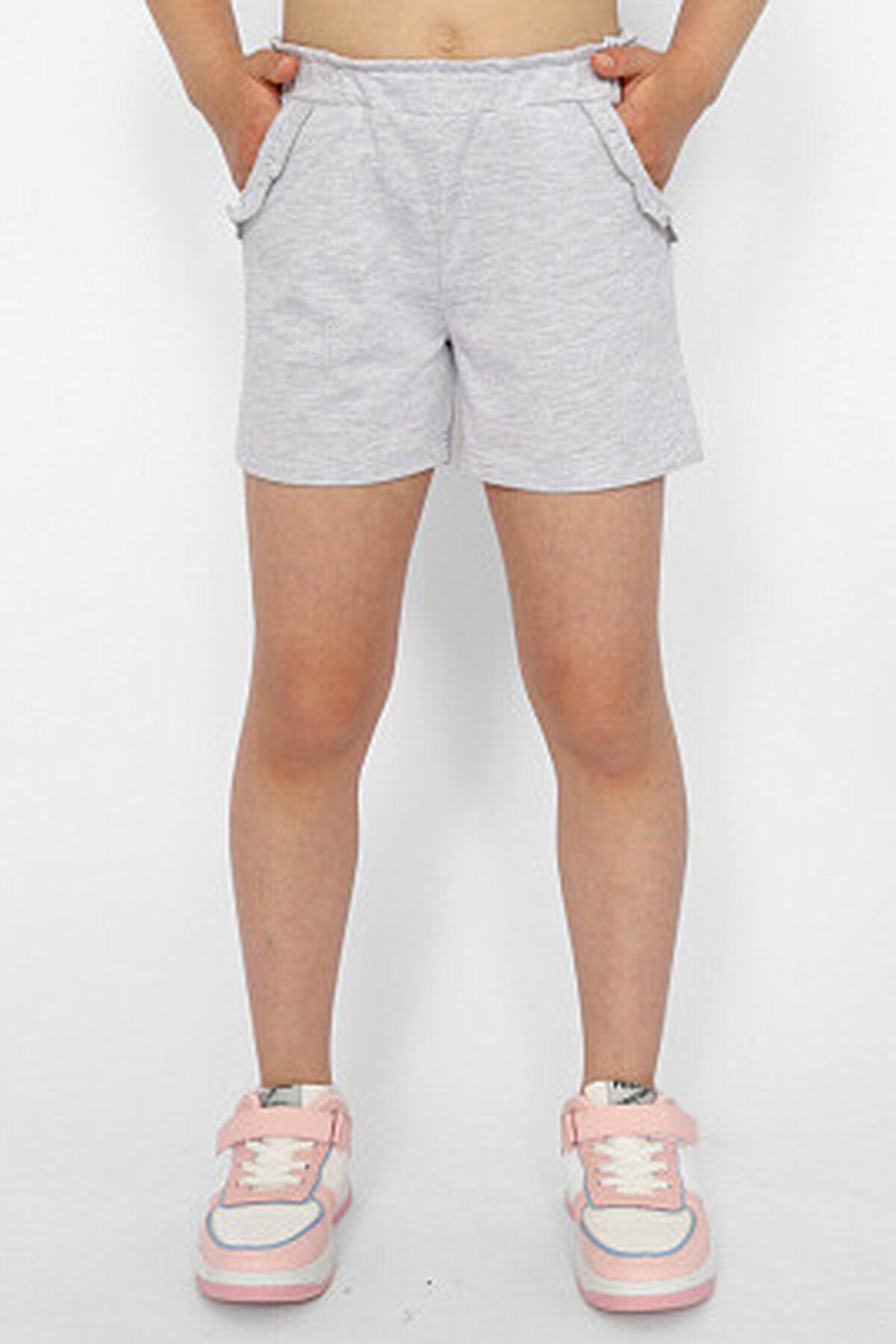 Шорты для девочки с карманами и притачным поясом из основного полотна. В пояс вставлена резинка. Вход в карман оформлен декоративной рюшей.