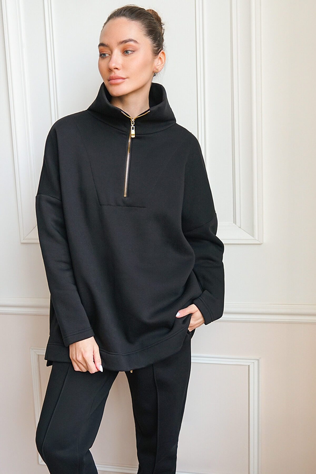 Джемпер выполнен из премиального футера-трехнитки. Теплая модель с начесом дополнена высоким воротом на молнии золотистого цвета. Свободный крой подходит для любой фигуры.