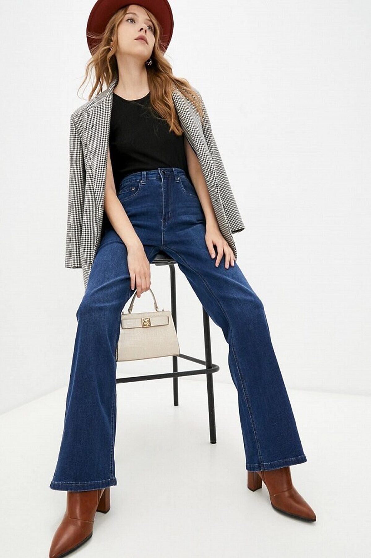 Прямые джинсы темно-синего цвета с осветленными элементами. Модель с высокой посадкой. Минималистичный дизайн с контрастной строчкой, фирменной нашивкой и заклепками на карманах.