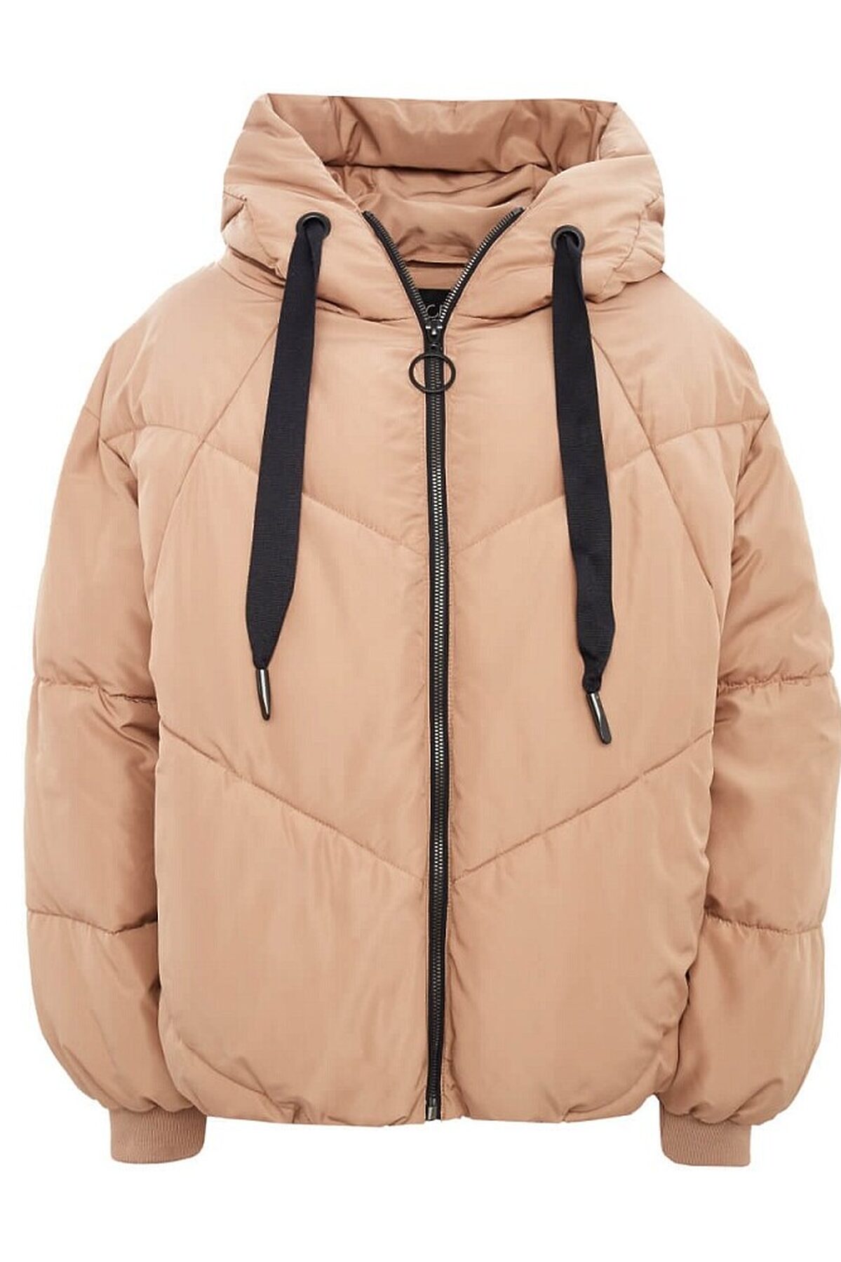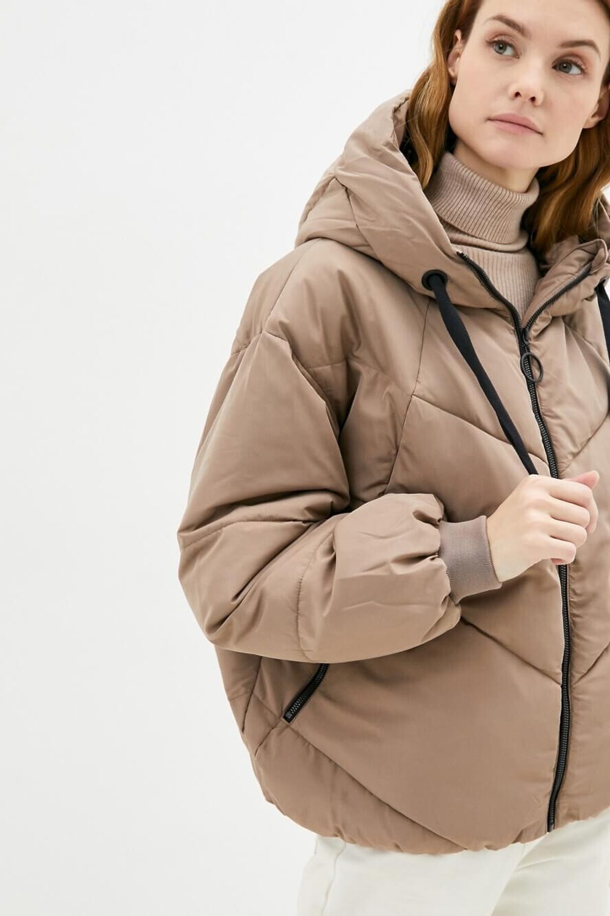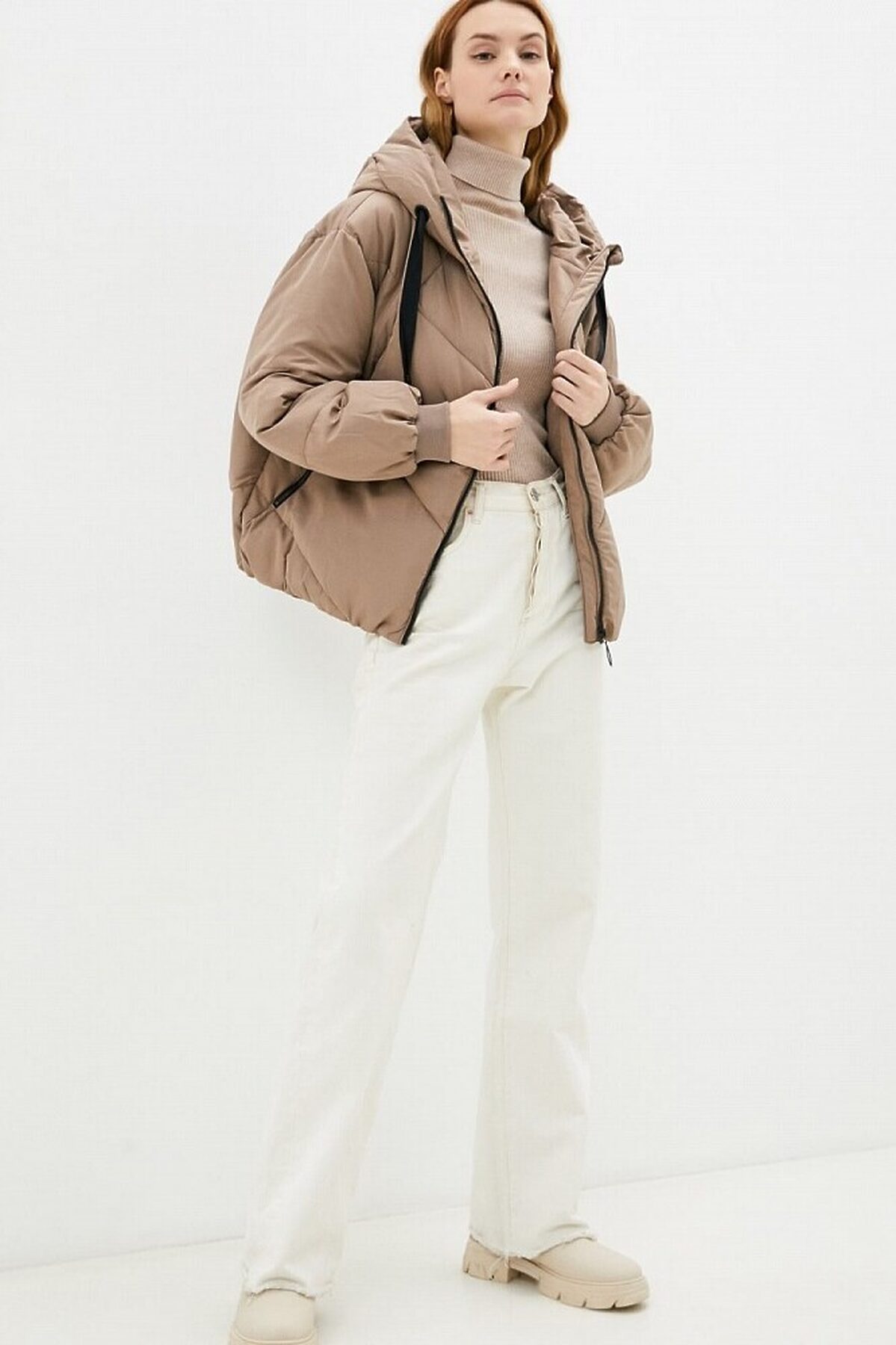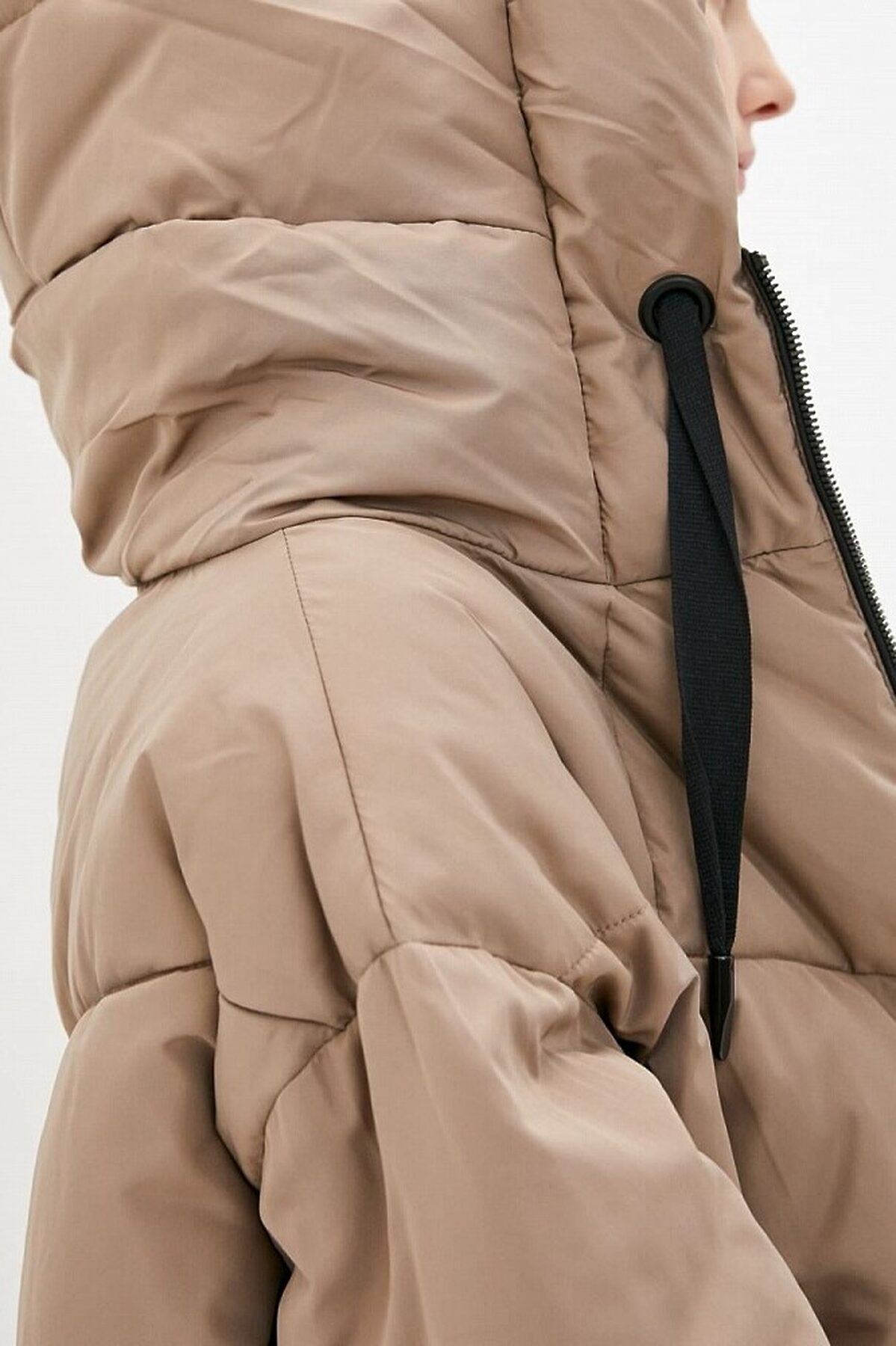 Короткая куртка-кокон темно-бежевого оттенка. Приспущенные рукава, объемный капюшон дополнен завязками из крупных черных лент. Стеганая отделка V-образным узором. Низ собран на резинку.