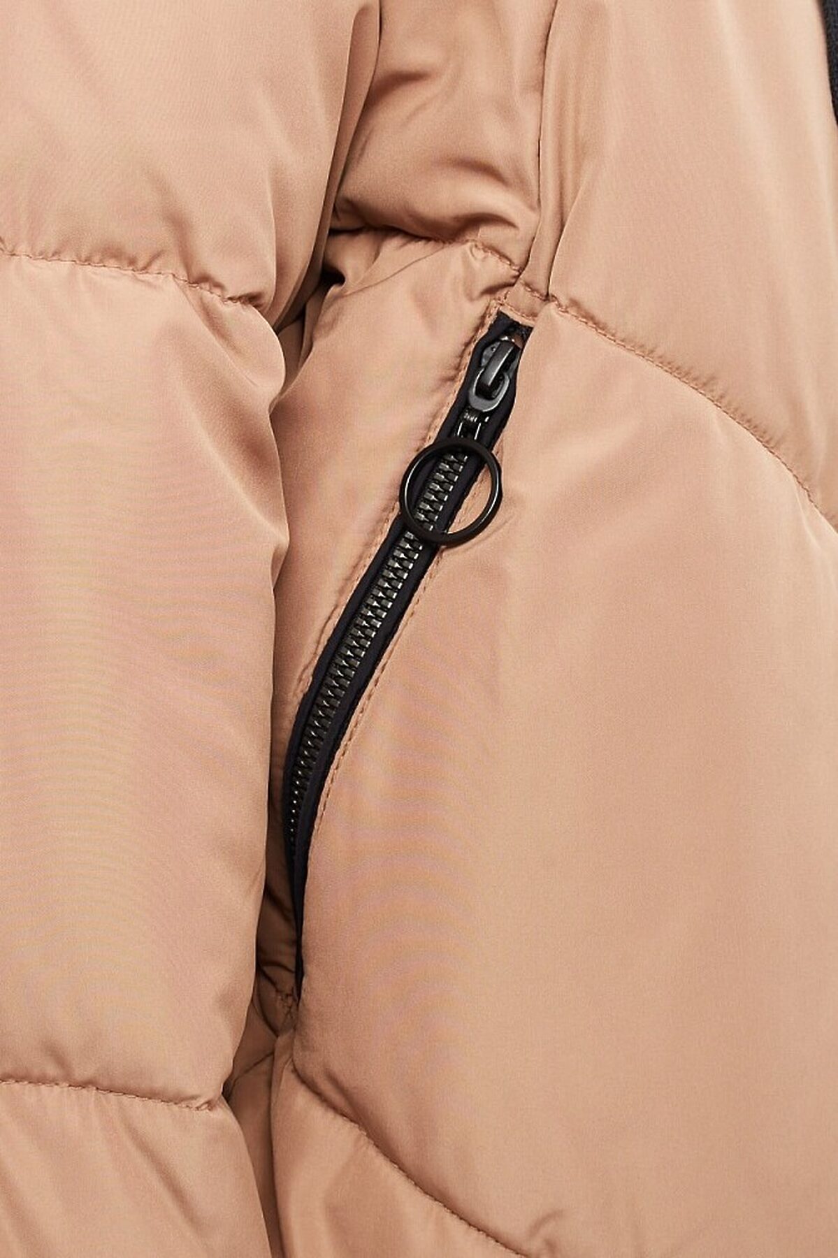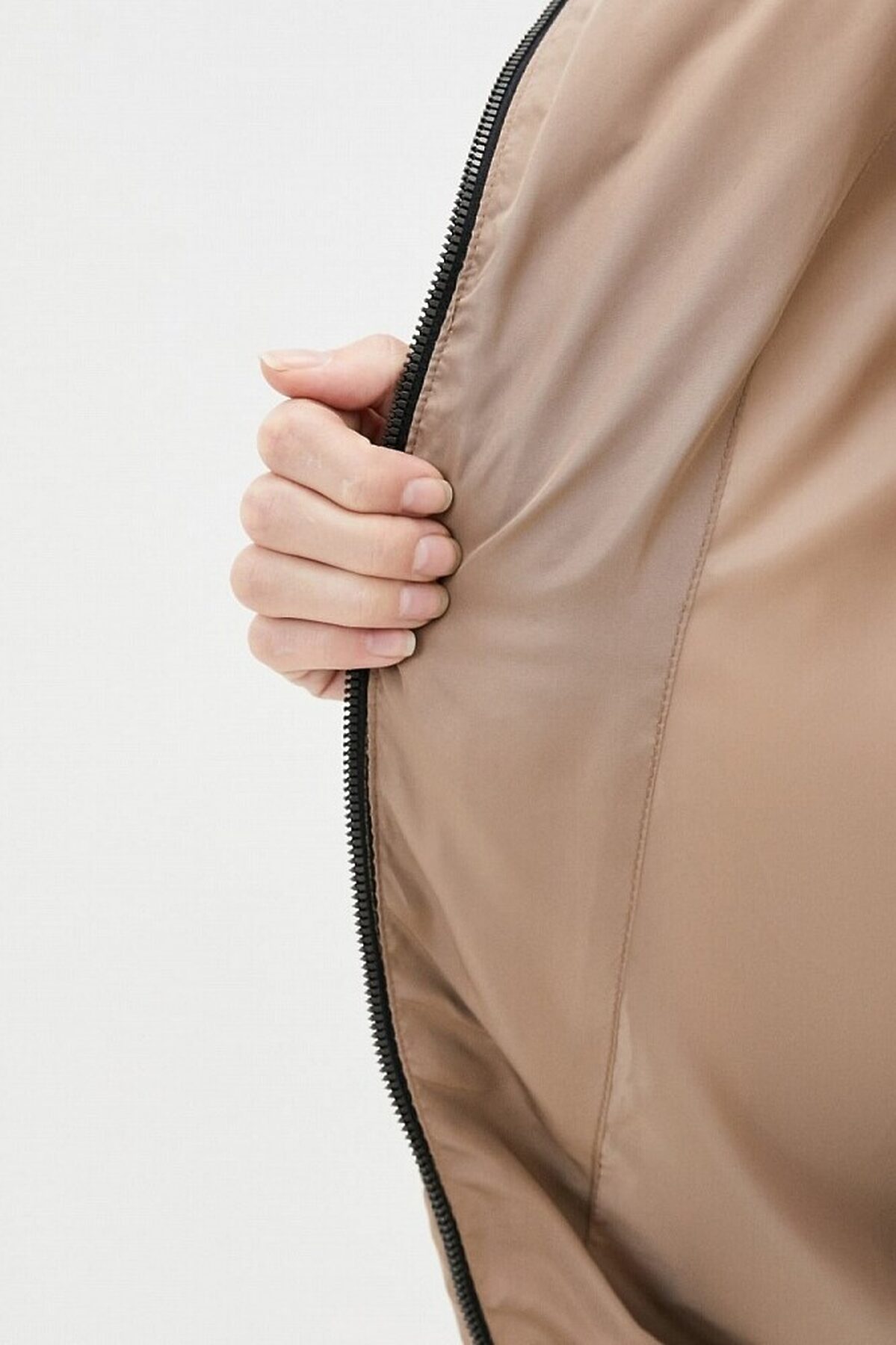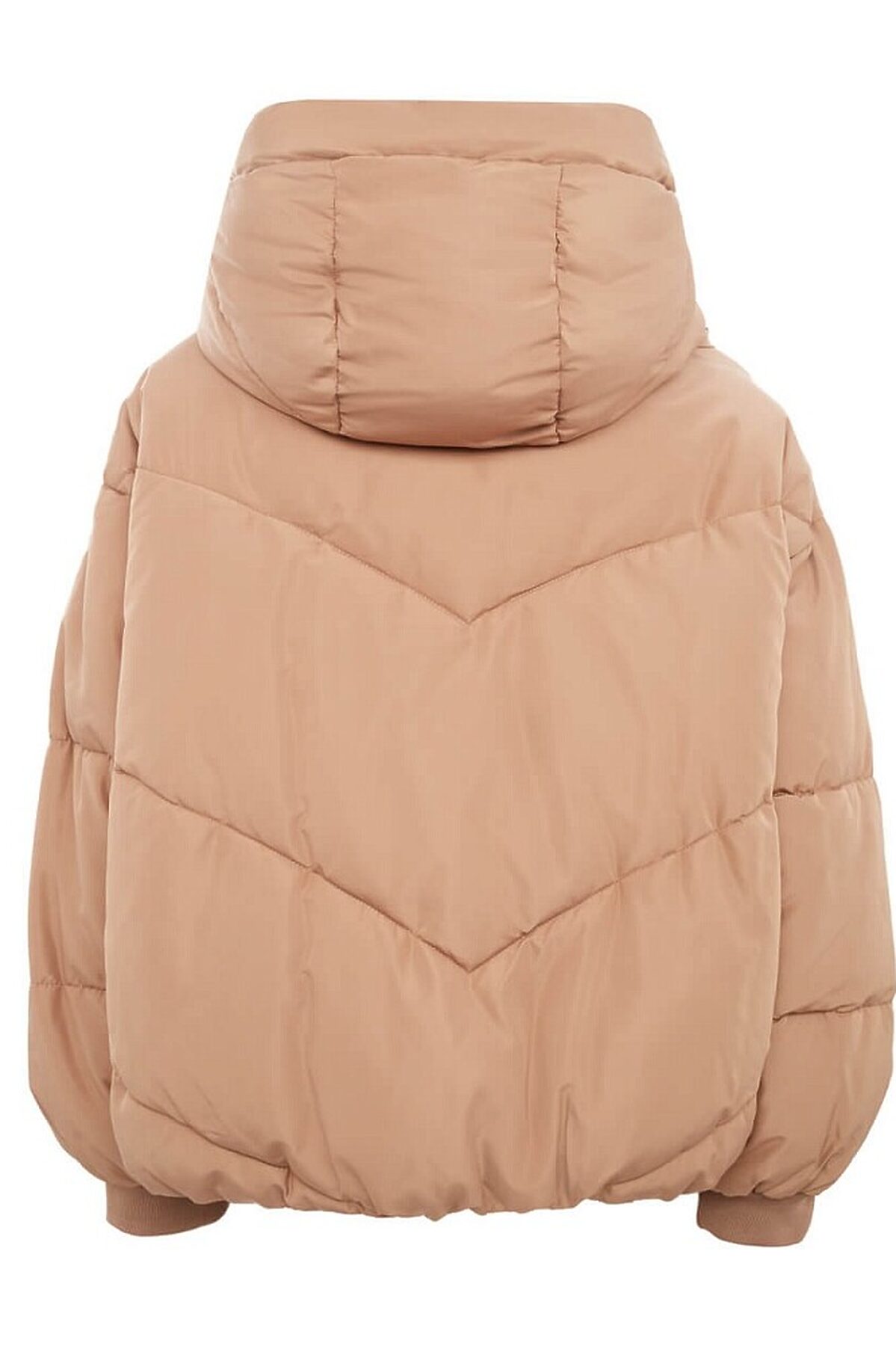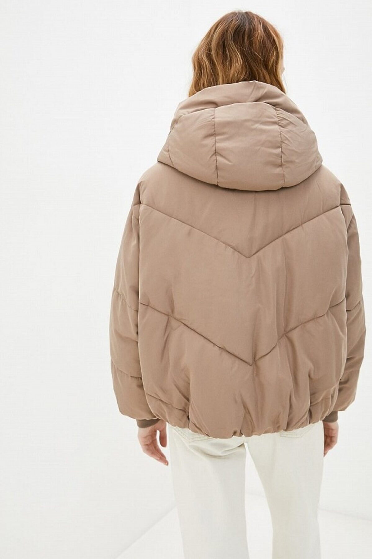 Короткая куртка-кокон темно-бежевого оттенка. Приспущенные рукава, объемный капюшон дополнен завязками из крупных черных лент. Стеганая отделка V-образным узором. Низ собран на резинку.