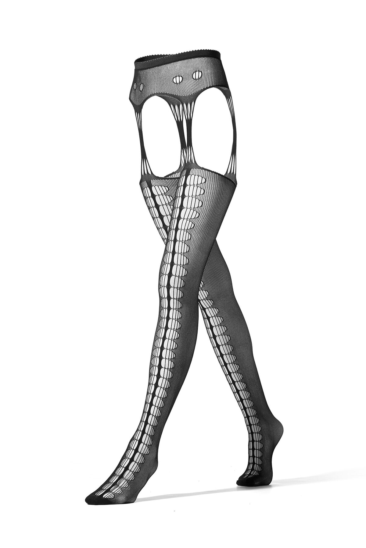 Колготки с открытыми бедрами и интимной зоной: имитация пояса с чулками. Сетчатый материал отлично тянется, а плотная резинка на талии обеспечивает идеальную посадку. Плотность 40 DEN. Параметры модели на фото 86-60-90 см, рост 177 см. На девушке колготки размера 2-4.