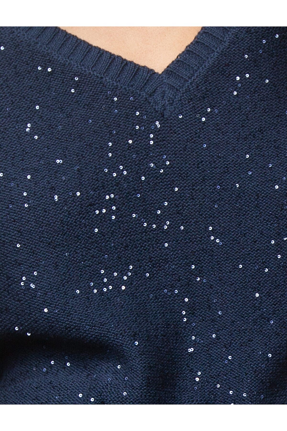 Джемпер с цельнокроеным рукавом выполнен из хлопковой пряжи крупной вязки. Небольшой V-образный вырез подчеркивает линию шеи и вытягивает силуэт. Вкрапление россыпи сияющих пайеток задают праздничное настроение. Лаконичная и в тоже время роскошная модель способна создать яркий образ на важном мероприятии, или стать блестящей изюминкой в привычном гардеробе.