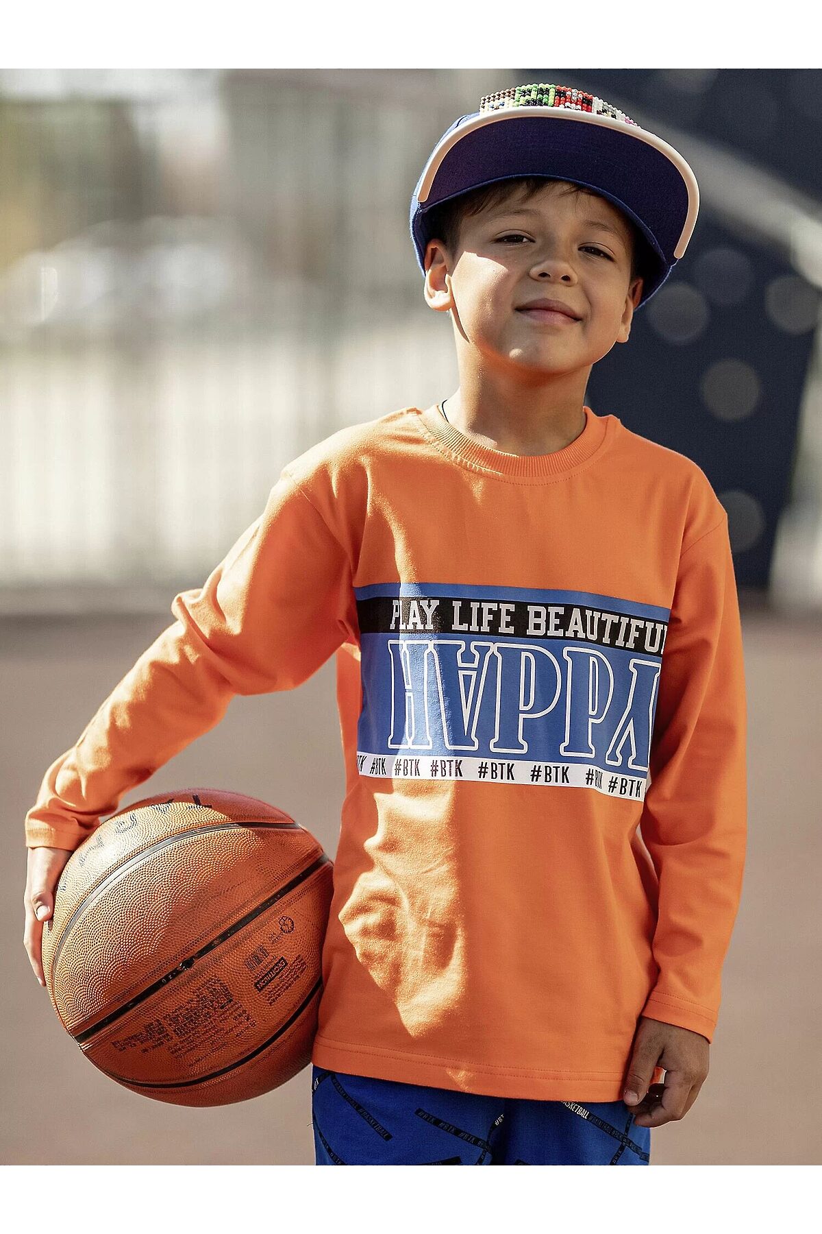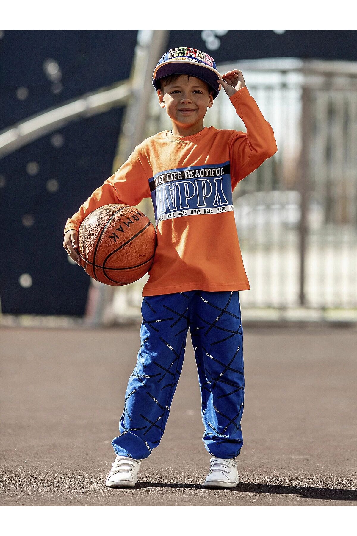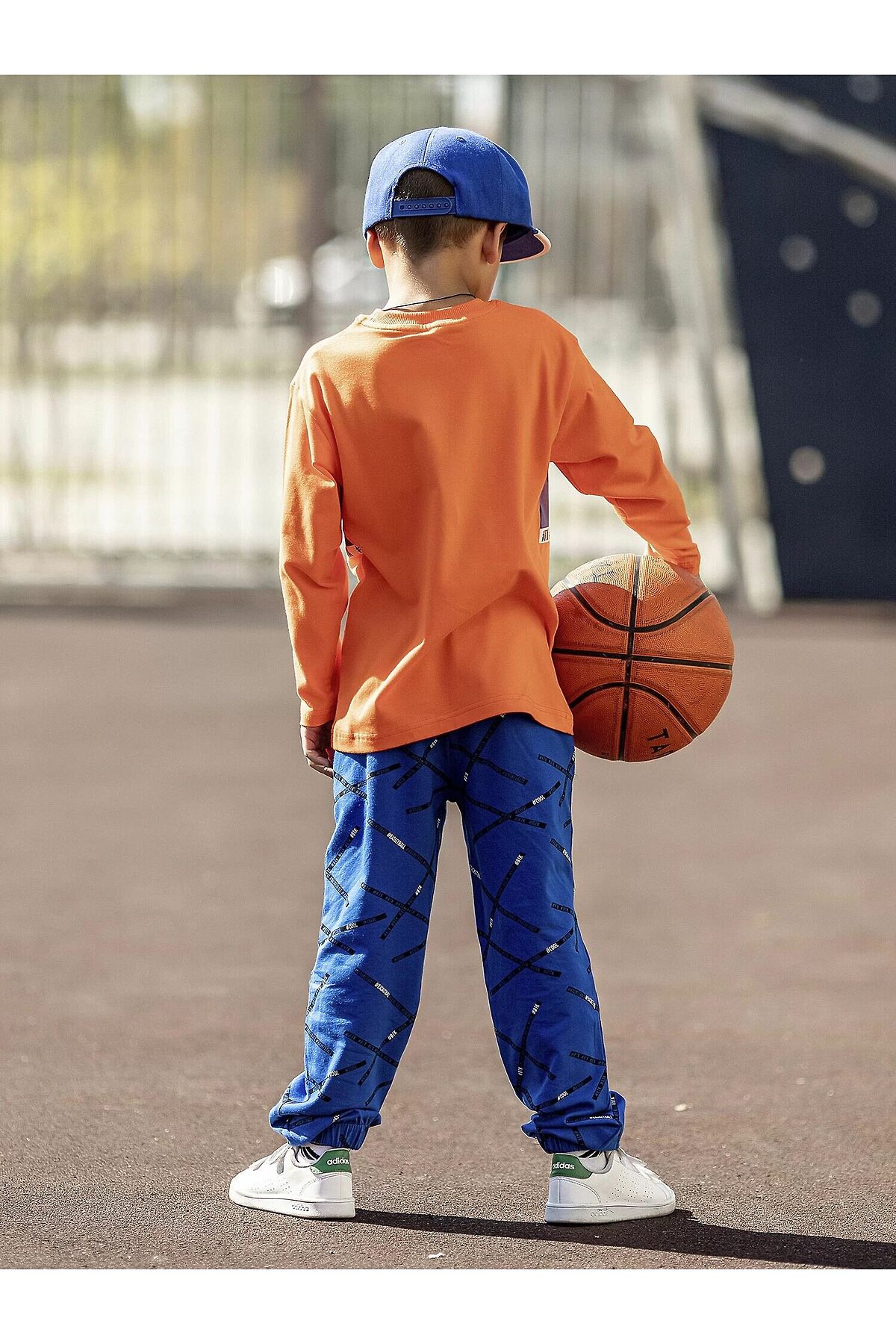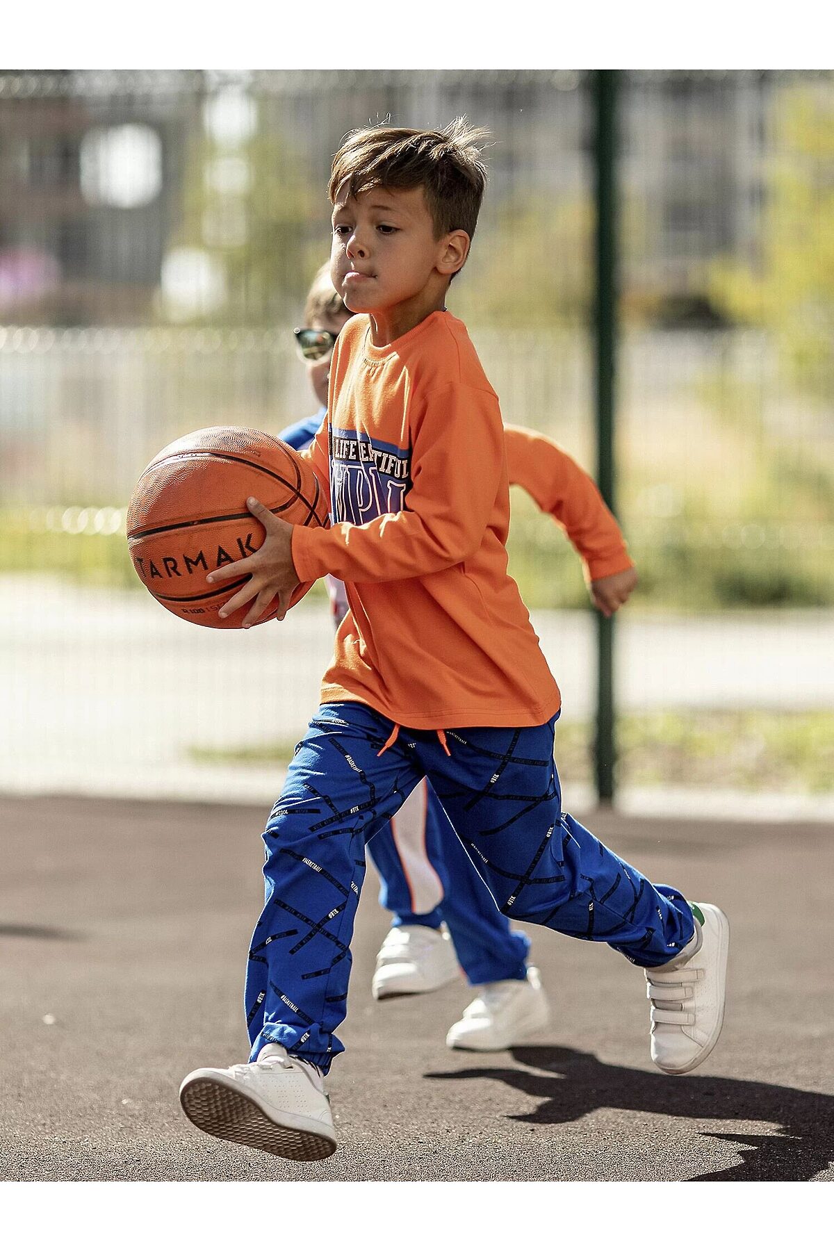 Комплект трикотажный для мальчика: оранжевый пуловер и синие брюки.