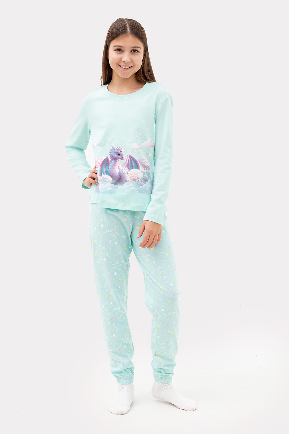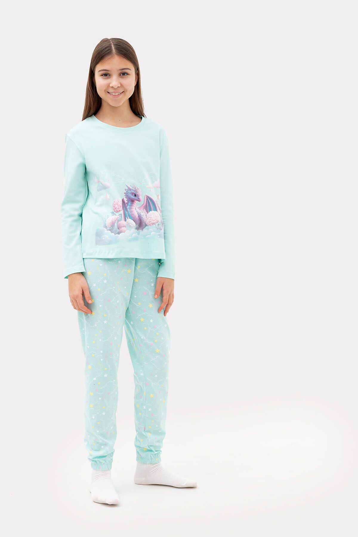 Комплект для девочек состоит из джемпера и брюк. Горловина круглой формы с притачной обтачкой из основного полотна. Рукава длинные втачные. Перед и спинка цельнокроеные. Низ джемпера и рукавов обработан швом в подгибку. Брюки длинные, немного заужены к низу. Пояс цельнокроенный с эластичной тесьмой внутри. Низ брюк застрочен с эластичной тесьмой внутри.