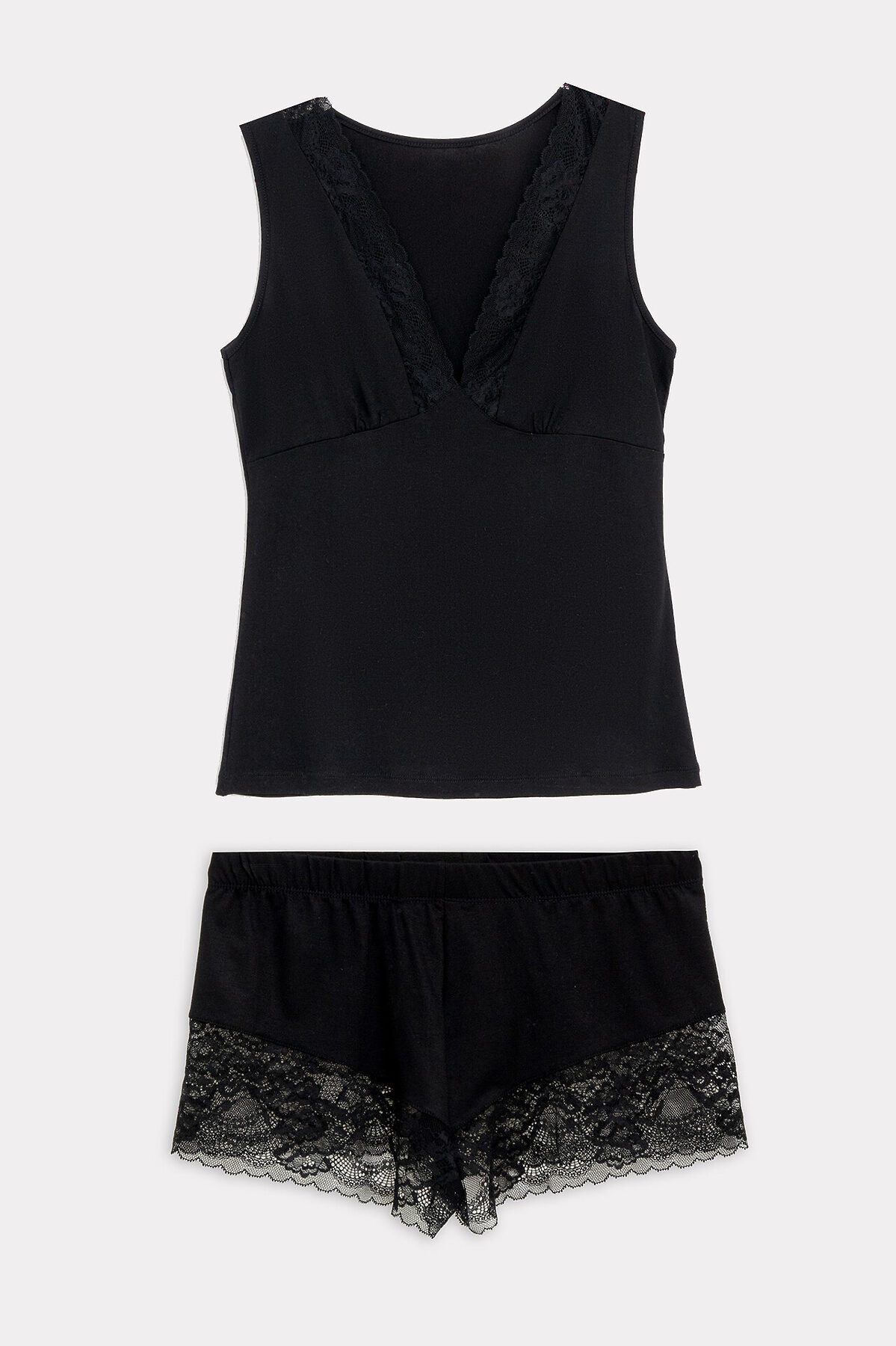 Очаровательный домашний комплект из топа и шортиков. В составе полотна преобладает нежнейшая вискоза. Топ с подрезом под грудью, со сборочкой и эластичным кружевом на зоне декольте. Шорты короткие, свободные, с эластичной тесьмой в поясе и кружевным декором. Элегантно и стильно