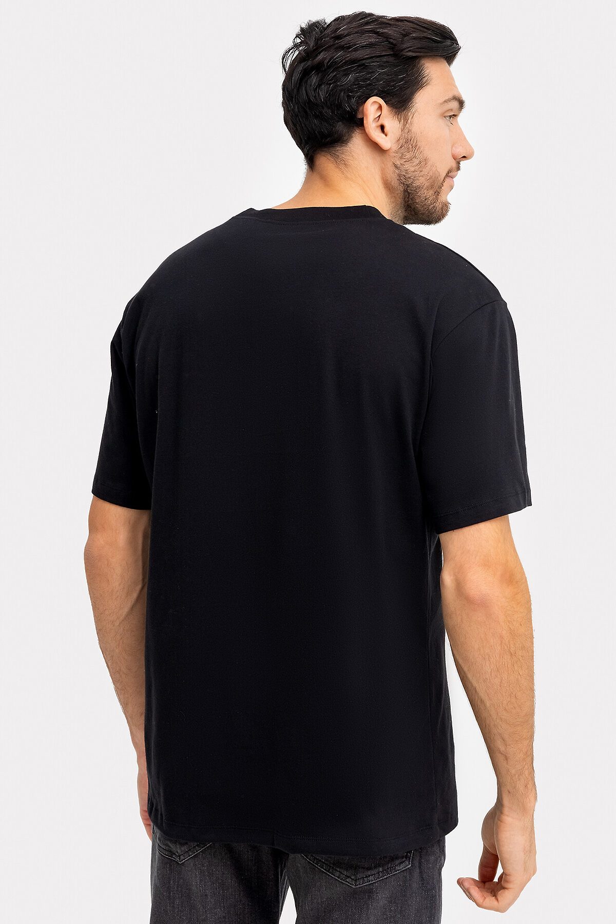 Футболка мужская из кулирного полотна. Силуэт прямой, свободный. Длина до середины бедер. Спинка и перед цельнокроенные. Круглая горловина, плотно прилегающая к шее, обработана притачной обтачкой из рибаны, шов соединения расстрочен Линия плеча немного спущена. Рукава короткие, втачные. Нижние срезы футболки и рукавов обработаны швом в подгибку на плоскошовной машине.