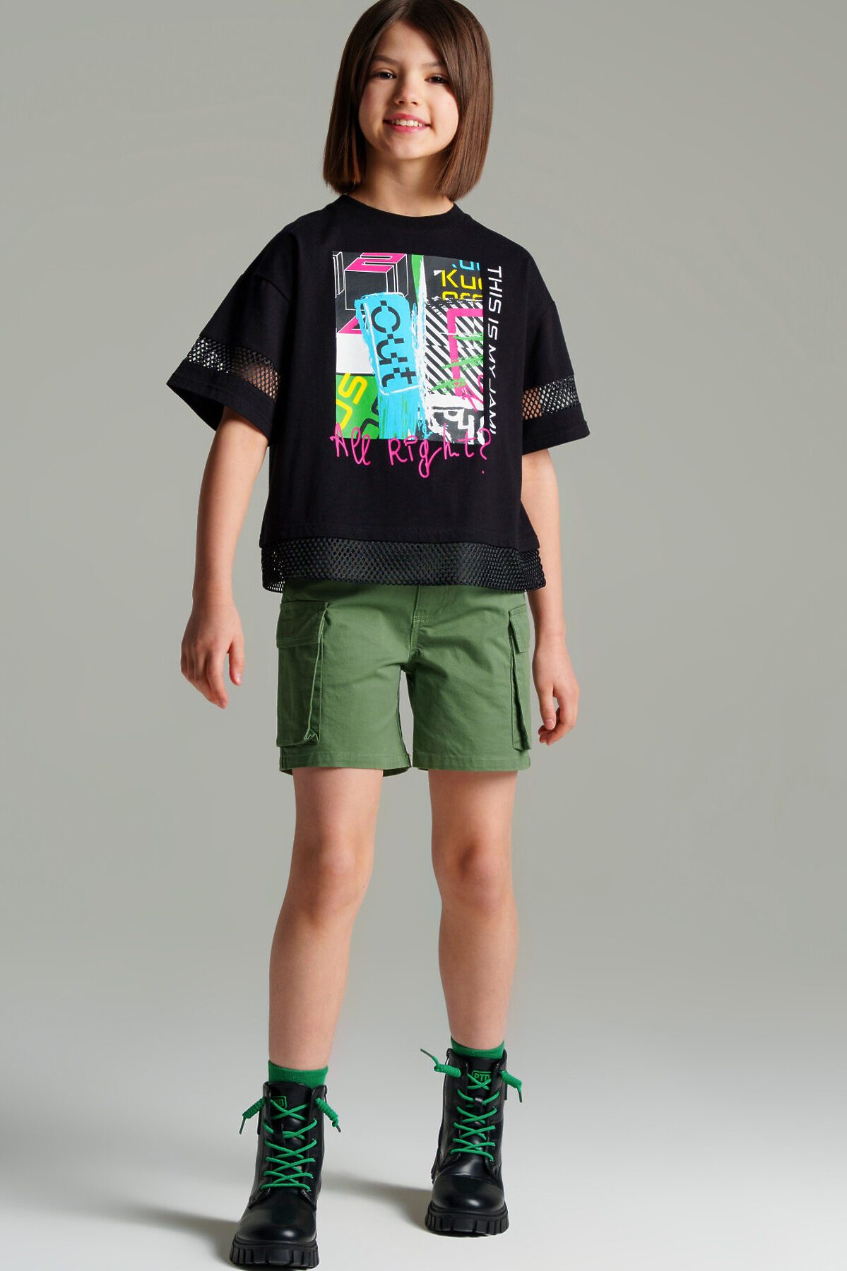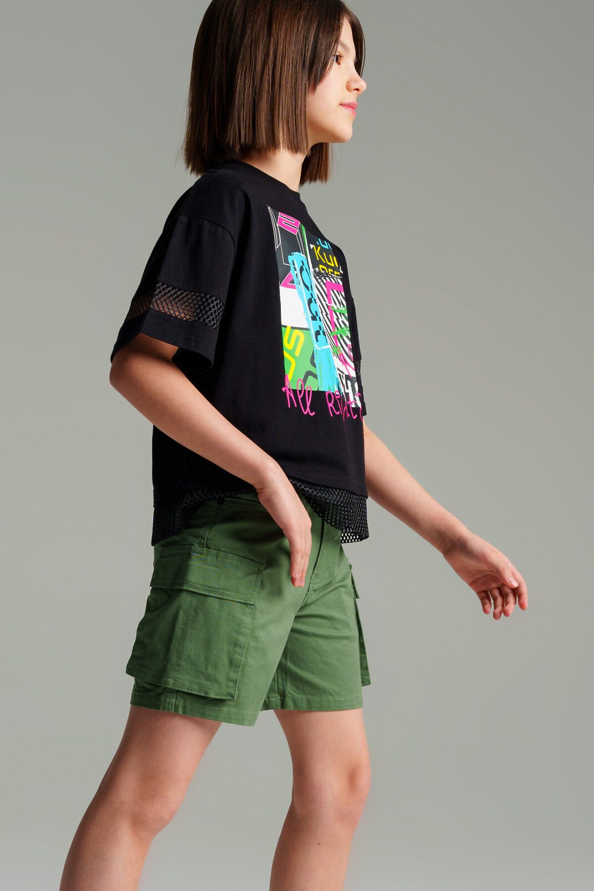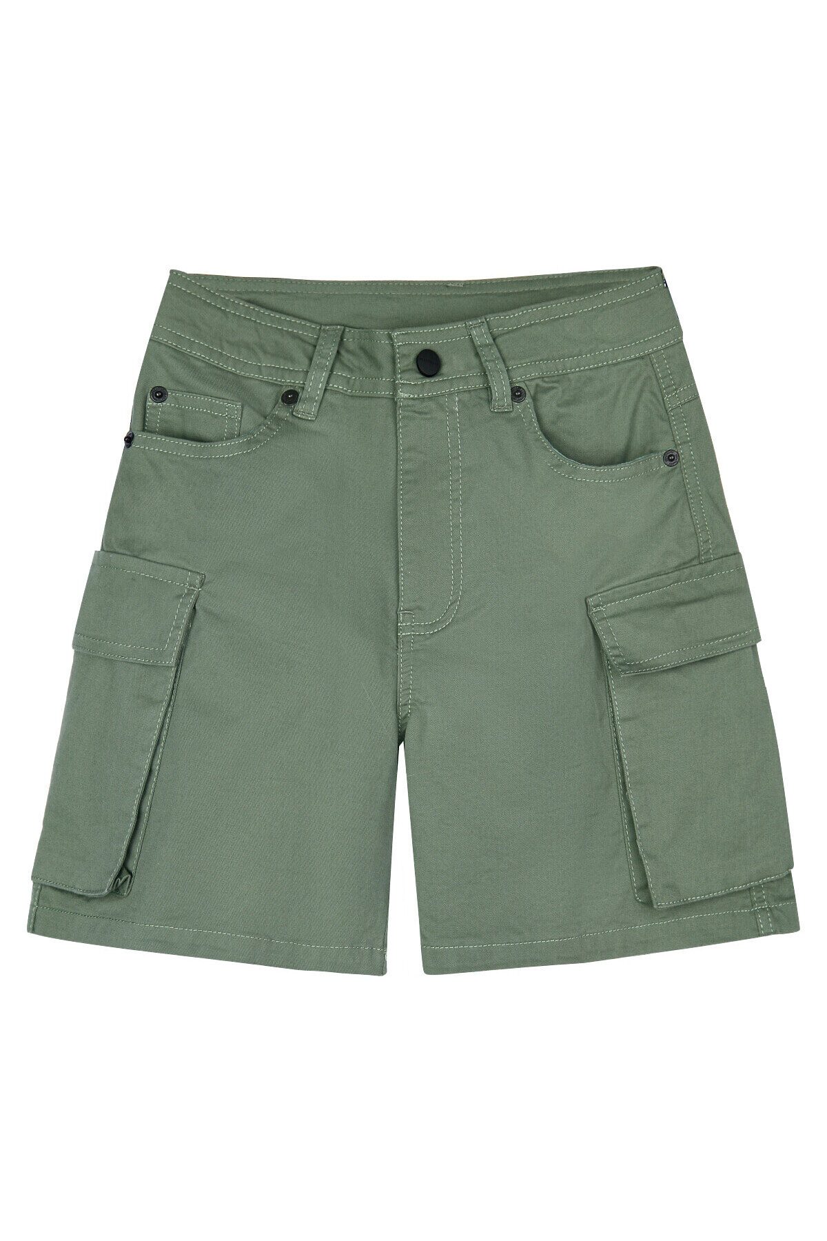 Шорты из твила для девочки. Застежка на пуговицу, пояс с внутренней утяжкой. Функциональные накладные карманы с клапанами.