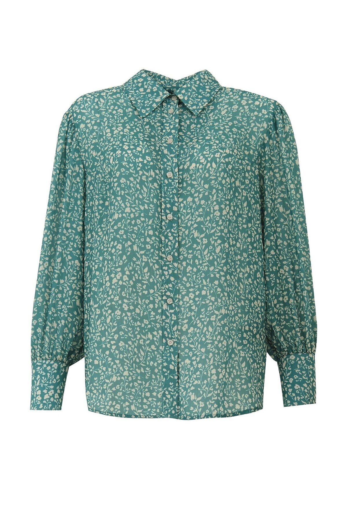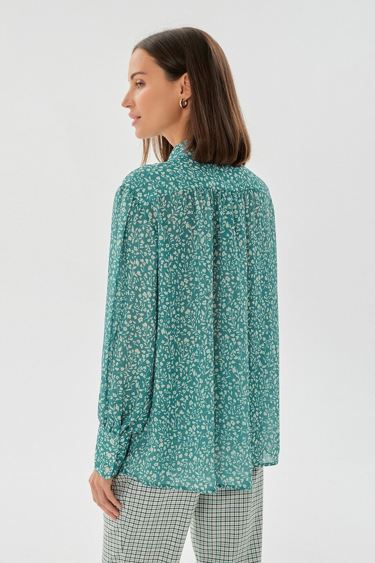 Романтичная прямая блуза с отложным воротником бирюзового цвета с цветочным принтом из плательной ткани.