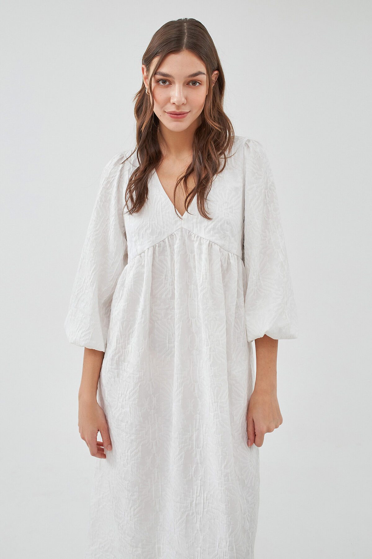 Объемное платье из фактурной ткани в молочном цвете. Модель с завышенной линией талии дополнена V-образным вырезом и объемными рукавами. На спинке пришитый пояс для лучшей посадки на фигуру.