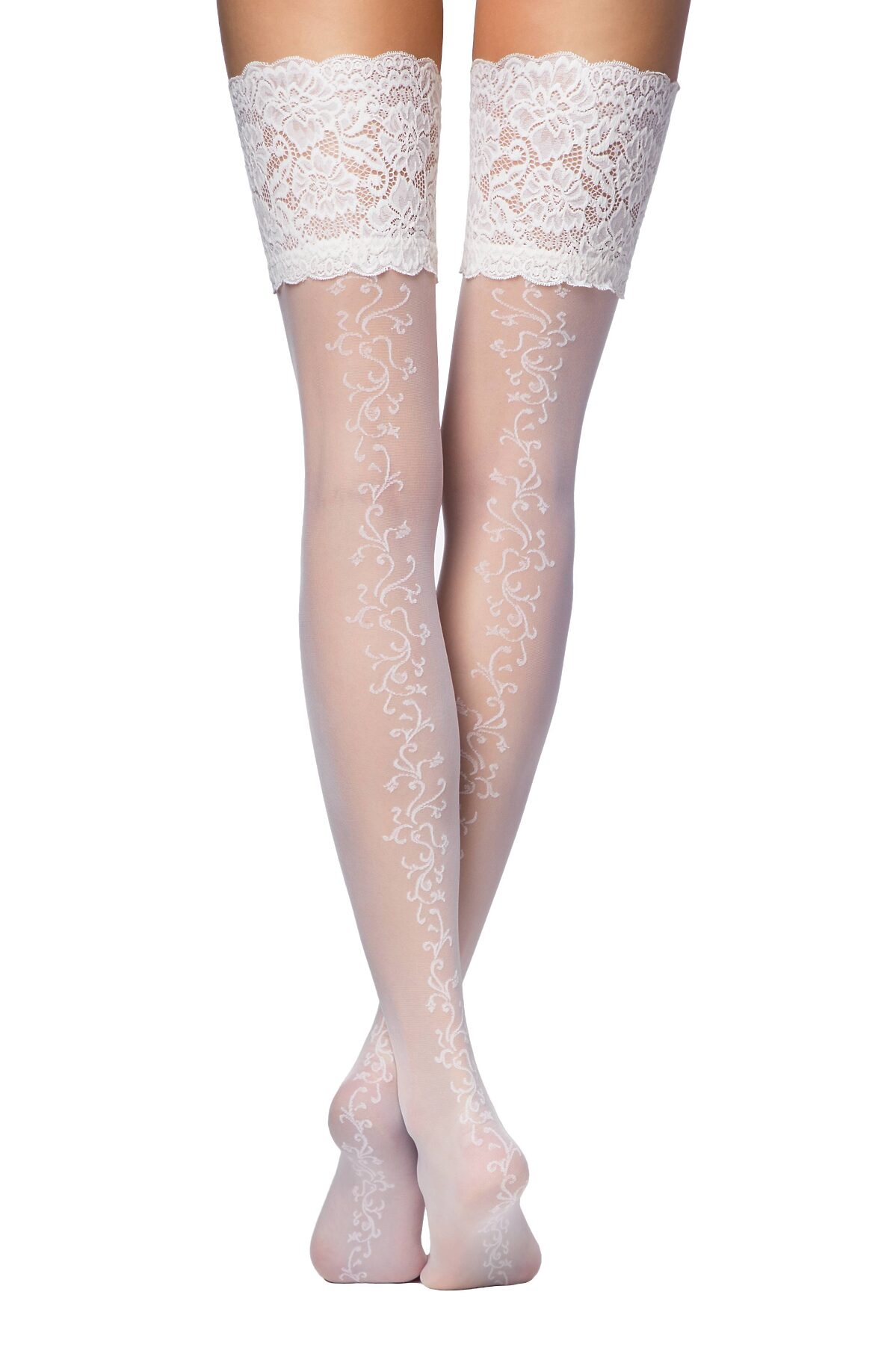 Тонкие эластичные фантазийные чулки 20 ден с широкой кружевной самоподдерживающейся резинкой. Рисунок в ножке - "Цветочная лиана, расположенная сзади ноги".