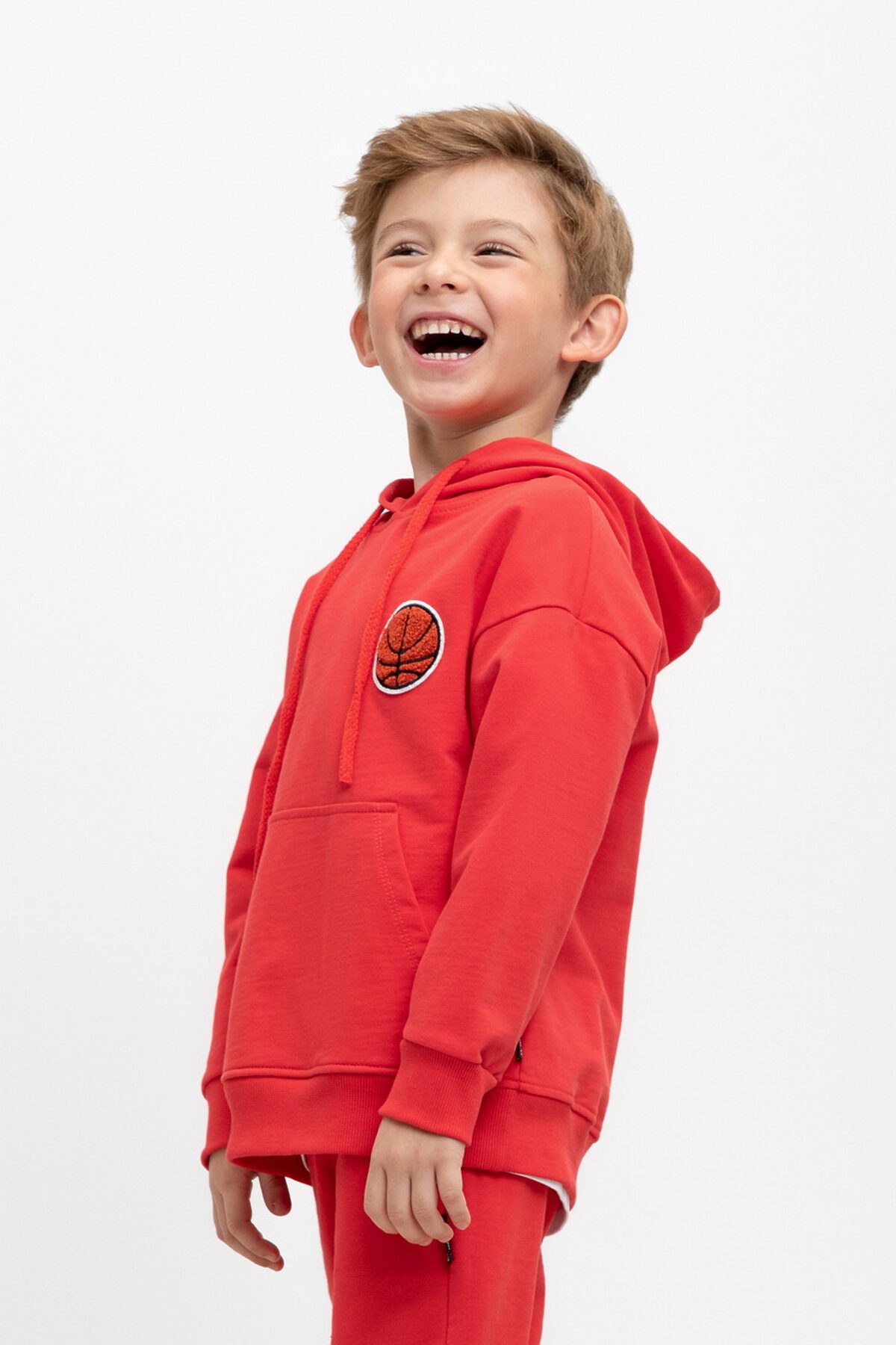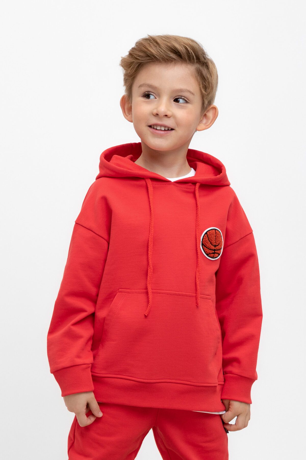Толстовка с капюшоном для мальчика из петельчатого футера. Манжеты и пояс из эластичного трикотажа в рубчик. Спереди удобный карман-кенгуру.