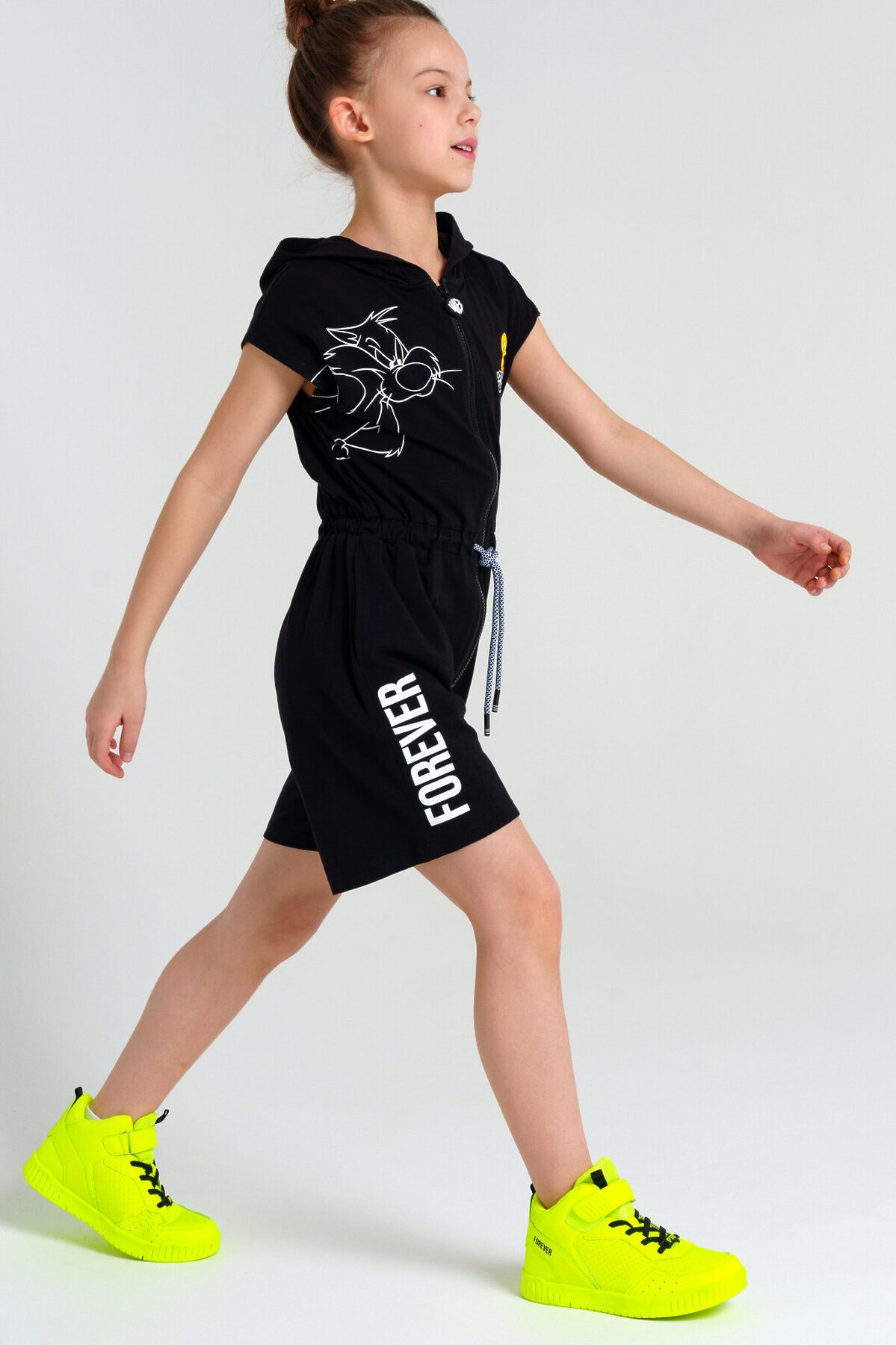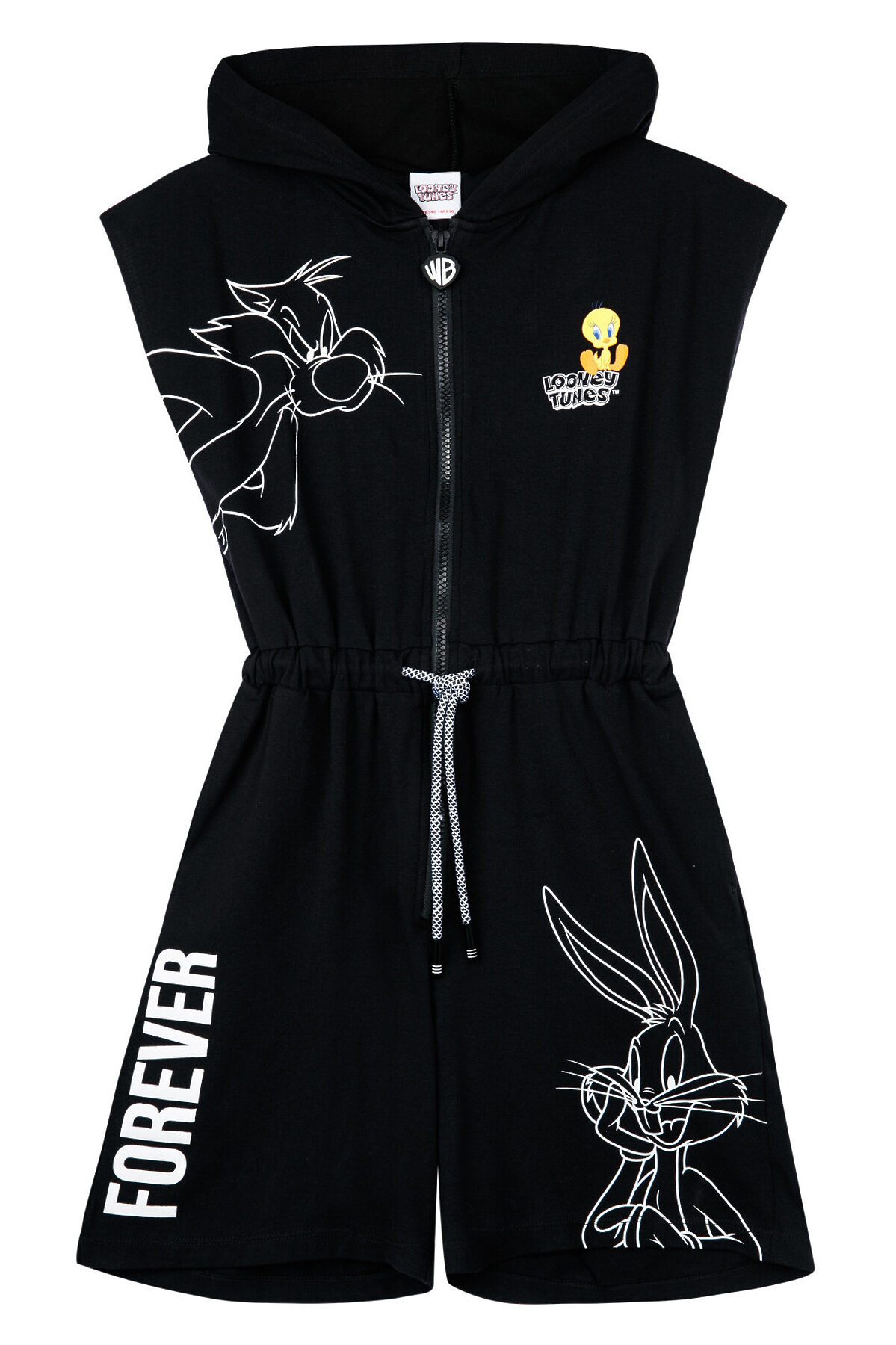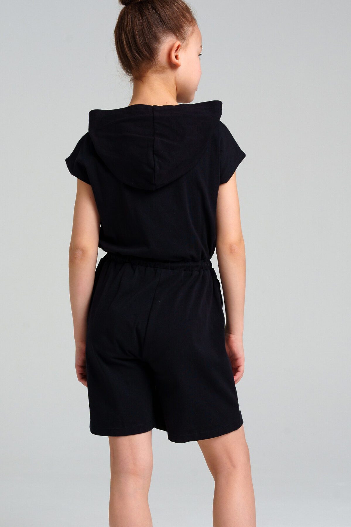 Комбинезон с капюшоном из качественного и приятного на ощупь трикотажа джерси. Высокое содержание хлопка 95%. Благодаря наличию эластана в составе ткани изделие проще в уходе и держит форму. Эластичный пояс со шнурком.