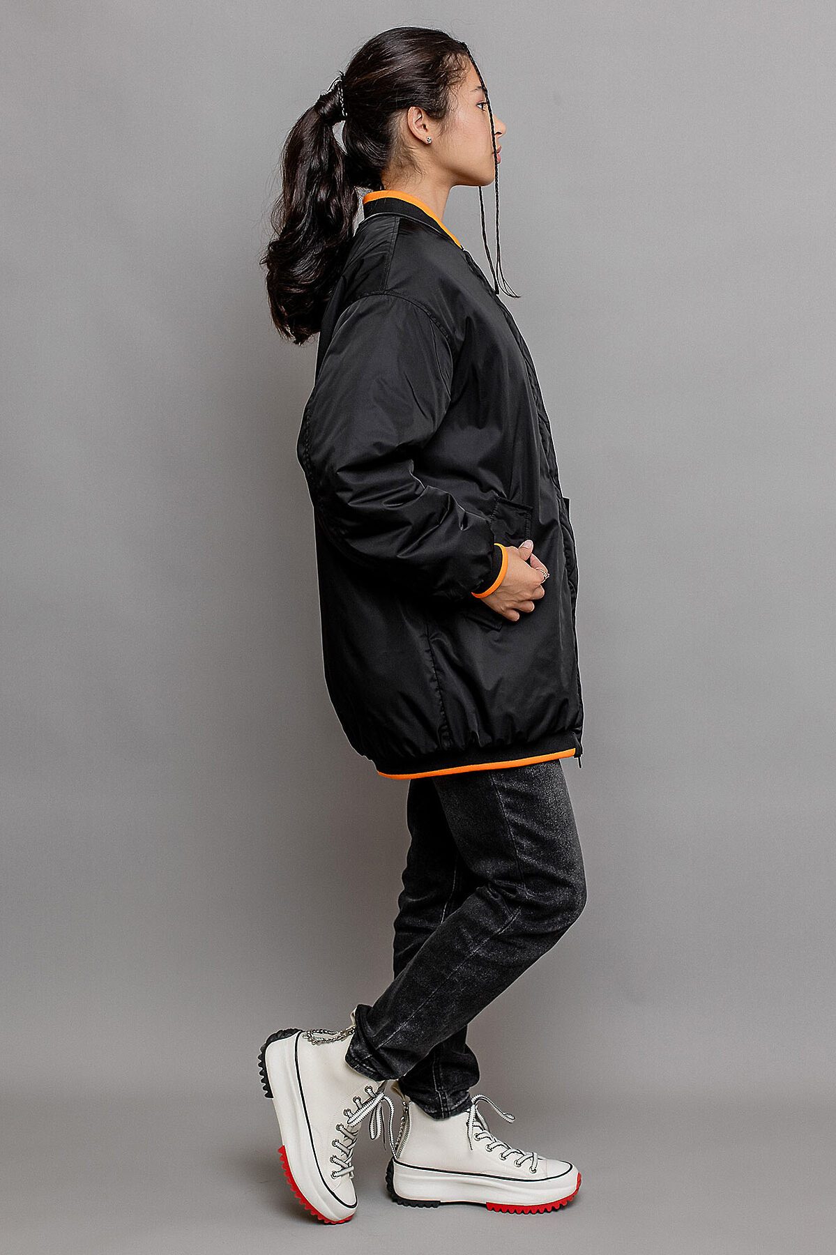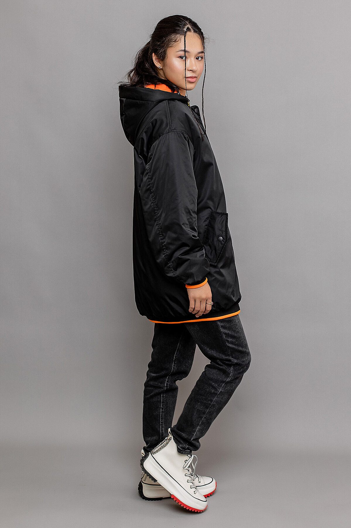 Бомбер Смэш черный удлиненный для девочки имеет свободный крой со спущенной линией плеча, что придает ему трендовый вид, а также обеспечивает свободу движения и комфорт. Бомбер можно сочетать с любой одеждй, сохраняя при этом стиль и удобство. Выполнен из плотной ткани с водоотталкивающей пропиткой. Капюшон съемный на молнии и регулировкой по лицевому краю. На левом рукаве съемный объемный карман, декорированный светоотражающим оригинальным термотрансфером.